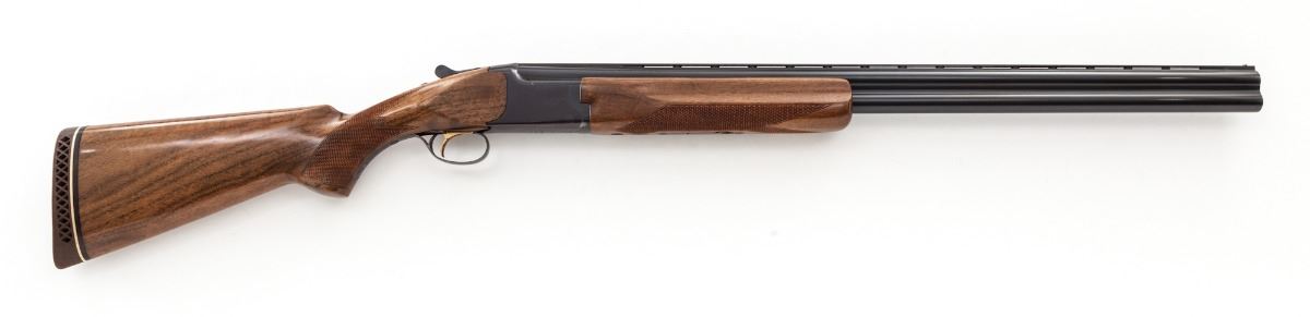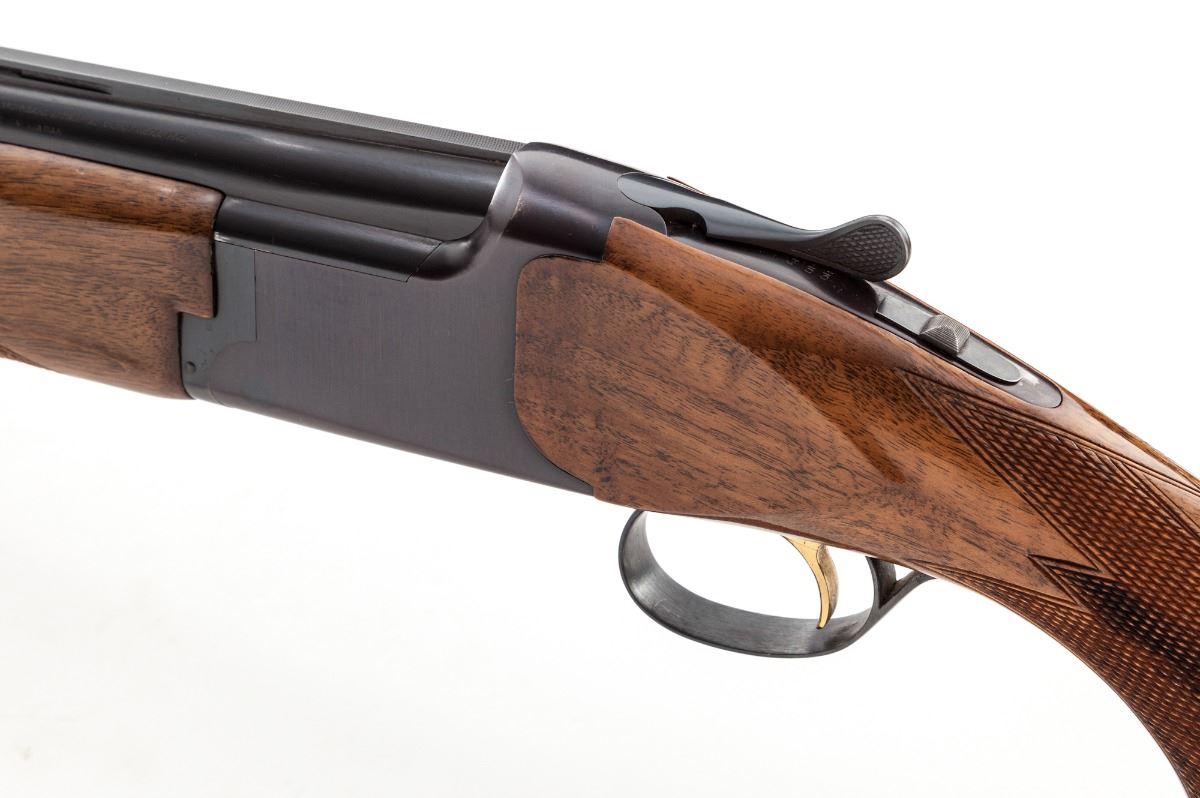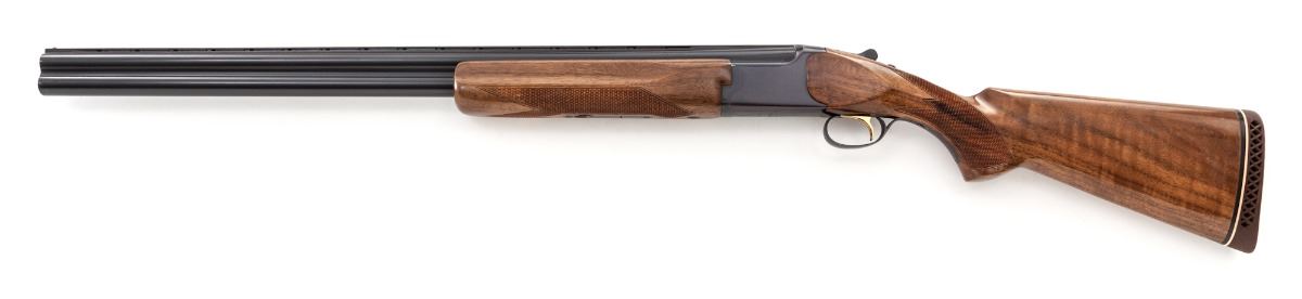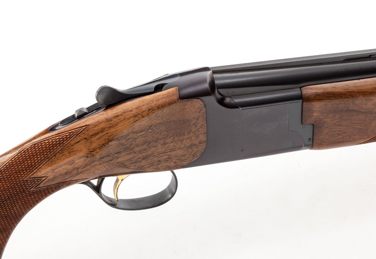 Browning Citori Hunting Model Over/Under Shotgun, #05491RTJ53, 12 ga., 3'' chs., blue finish, 28'' barrels with matted 5/16'' ventilated rib and front silver bead, Full/Mod. chokes, gold-plated inertia trigger, ejectors and a combination manual top-tang safety with barrel selector; early production Citori frame without engraving; checkered pistol-grip stock and beavertail forend are straight-grain walnut with 14-1/8'' length of pull over a ventilated 1'' Browning Whiteline recoil pad; weight is 7-3/4 lbs. Overall condition is 97% with indications of light use. Frame interior and barrel lugs have light oxidation and assembly wear. Muzzles have light residue and staining and the lower tang has blue loss. Frame has beginning plum toning. Stock has a few handling marks. Action is tight with bright bores and strong ejectors. Est.: $600-$800. (Modern)