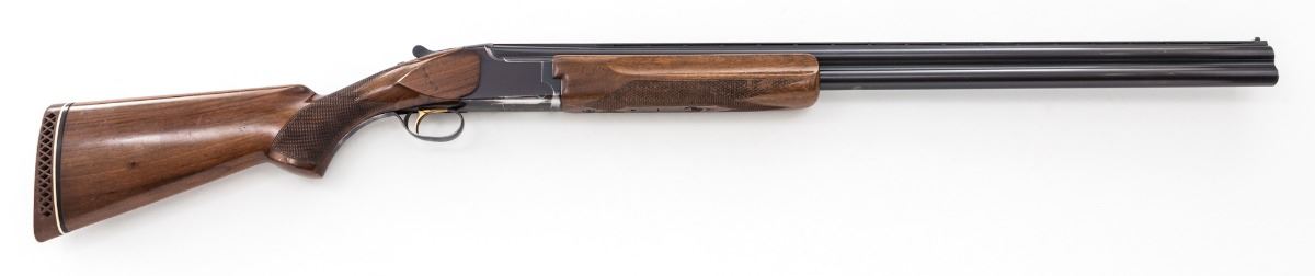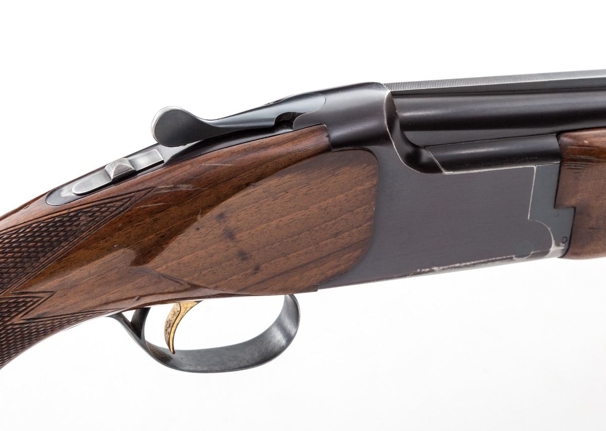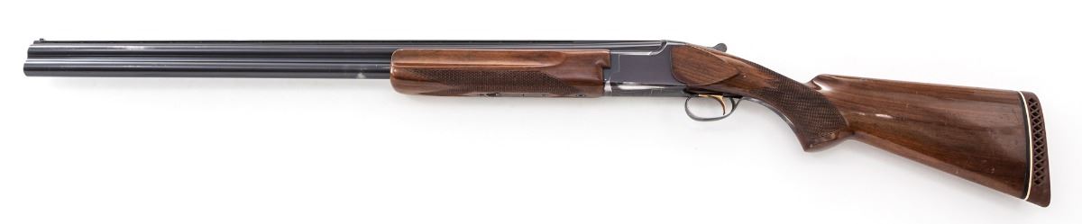 Early Browning Citori Hunting Model Grade I Over/Under Shotgun, #30597H57, 12 ga., 3'' chs., blue finish, 30'' barrels with matted 5/16'' ventilated rib, front and middle white beads, chokes marked Full/Mod., with ejectors; early style plain frame has a gold-plated inertia trigger and combination top-tang manual safety with barrel selector; checkered pistol-grip stock and beavertail forend are straight-grain walnut with a gloss finish. Length of pull is 14-1/8'' over a factory Browning ventilated recoil pad; weight is 8-1/8 lbs. Mfg'd ca. 1975. Overall condition is very good with indications of moderate field use. Blue finish is 80% with most losses on the underside of the frame and sides of the barrels with chafing on the rib; trigger has plating wear. Wood has overall scuffs and scratches. Action is tight, bores are bright. Est.: $450-$600. (Modern)