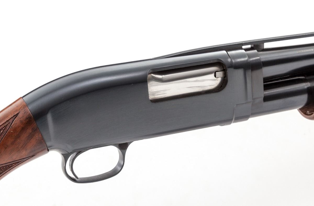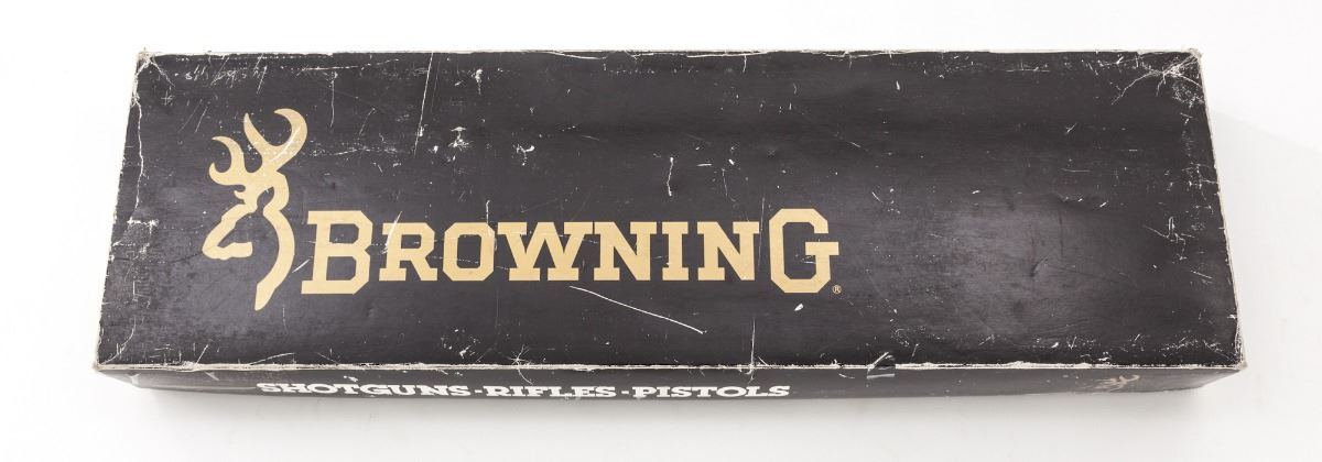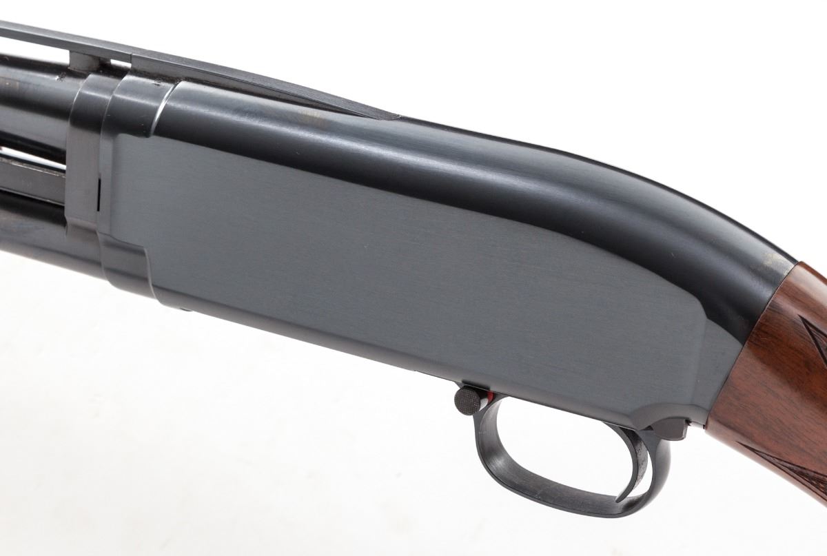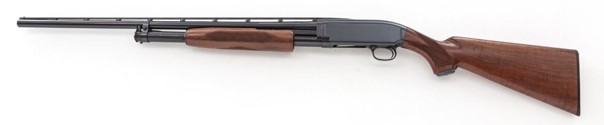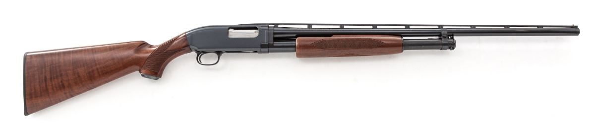 002 Limited Edition Browning Model 12 Grade I Slide-Action Shotgun, #03955PN832, 20 ga., 2-3/4'' ch., blue finish, 26'' barrel with matted 5/16'' ventilated floating rib, front silver bead and Modified choke, with triggerguard mounted push-button safety; checkered pistol-grip stock and handle are semi-gloss finished walnut with a 13-3/4'' length of pull to a black plastic Browning buttplate; weight is 7-1/8 lbs. Mfg'd ca. 1989, in original box with papers. Condition is excellent, appearing near new, with a few cycling and assembly marks. Est.: $700-$900. (Modern)