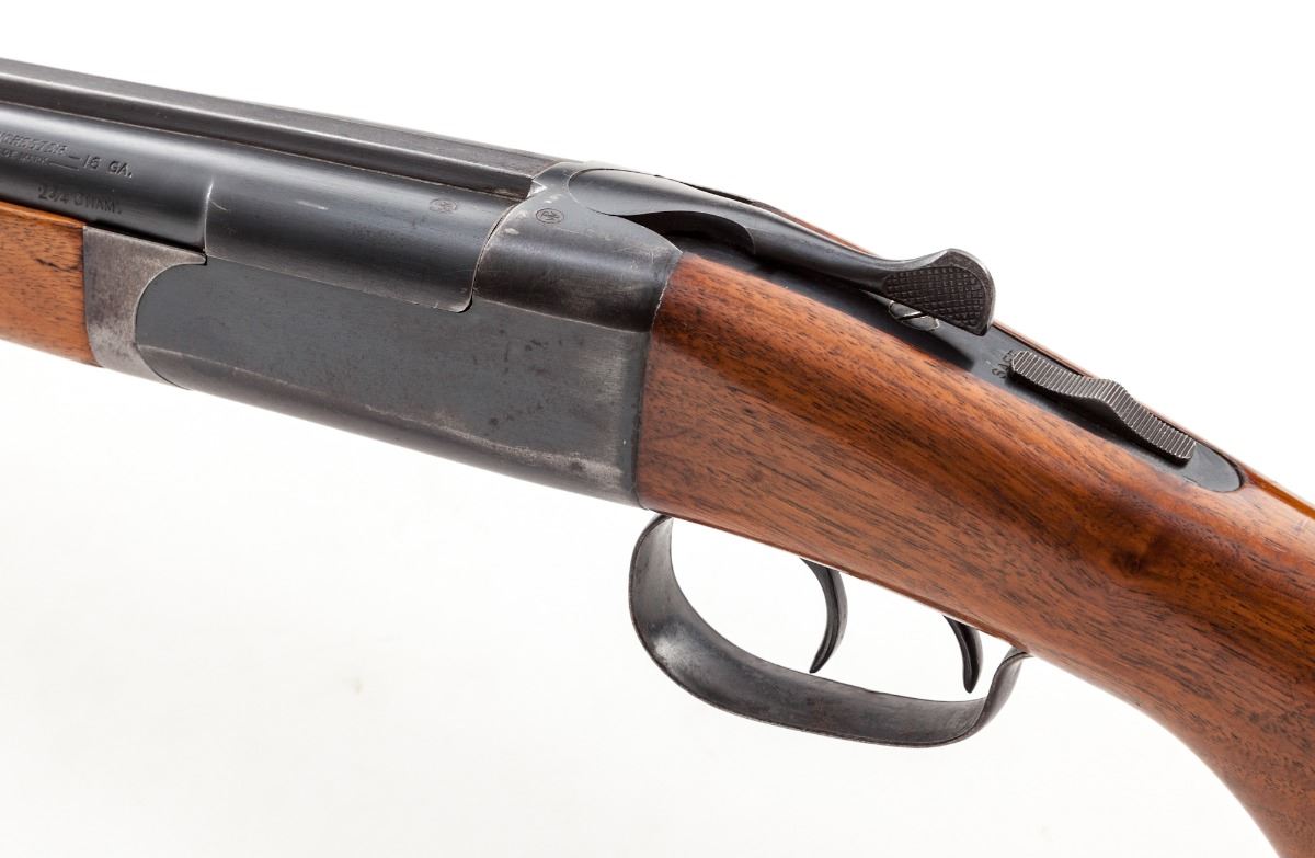 Winchester Model 24 Side-by-Side Shotgun, #43429, 16 ga., 28'' game rib barrels choked Full/Mod., blue finish, walnut stock and forend. Mfg'd 1945. Condition is near fine retaining approx. 90% blue with thinning at balance point and general high edgewear. Stock shows light wear from handling. Toe of hard rubber butt pad is missing. Action is tight, bores are bright. Est.: $500-$750. (C&R)