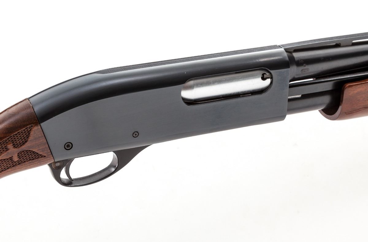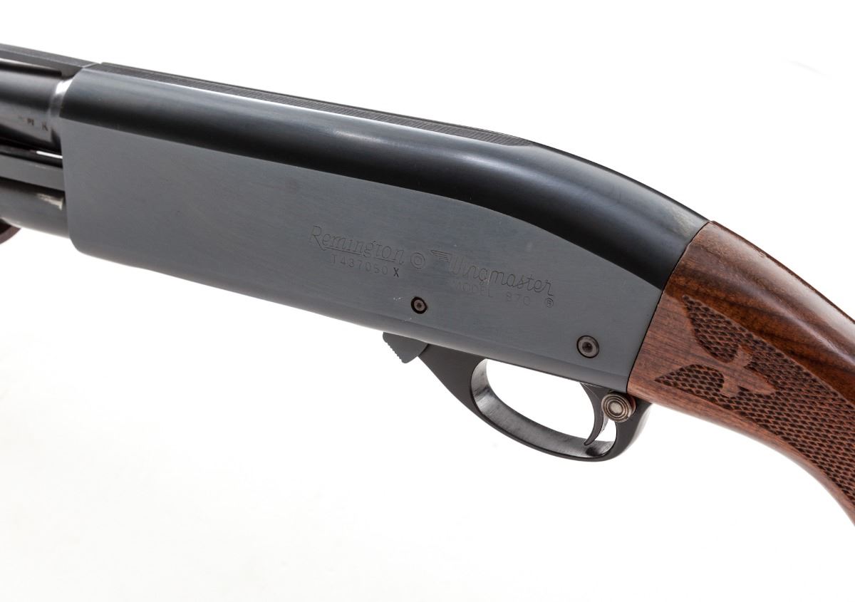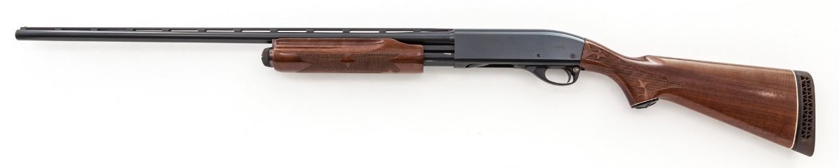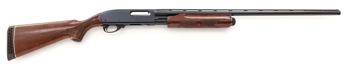 Remington Wingmaster Model 870 Pump Action Shotgun, #T437050X, 20 ga., 28'' vent rib barrel choked Mod., blue finish, pressed checkered mahogany stock, with Remington rubber butt pad. Condition is fine showing light field use as minor scuffs to stock and light scratching to flat sides of frame. Action and bore are good. Est.: $400-$600. (Modern)