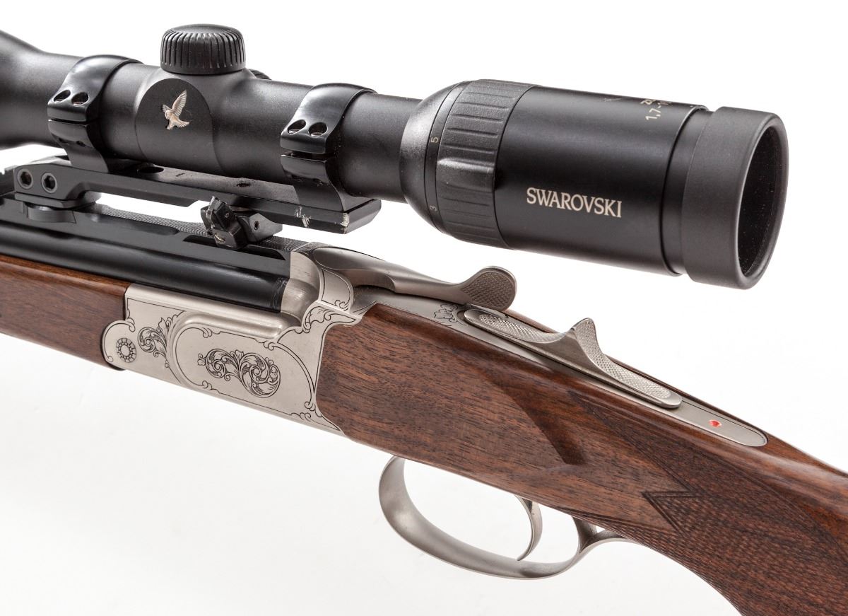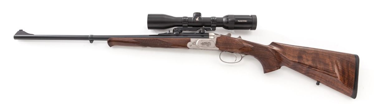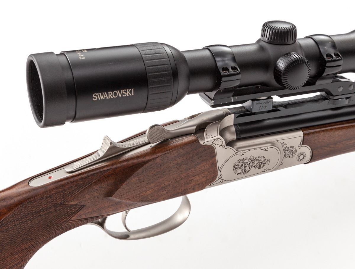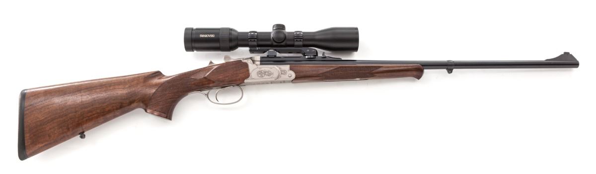 Krieghoff Hubertus Single Shot Rifle, #081738, .243 cal., 23-1/2'' blue barrel, boxlock action, lightly engraved coin finished frame, checkered cheekpiece stock and Schnauble forend, with single leaf iron sights. Topped with a Swarovski Z6 1.7-10x42 scope on quick-detachable mounts. Condition is excellent showing little use; however, aluminum scope base shows some scratches and discoloration. Stock and action are excellent, bore is bright, scope optics are clear. Est.: $3,500-$5,000. (Modern)