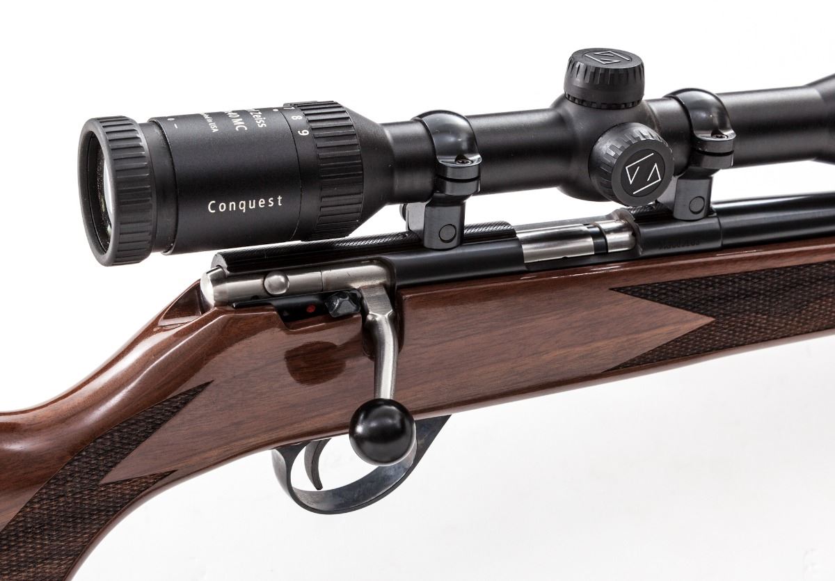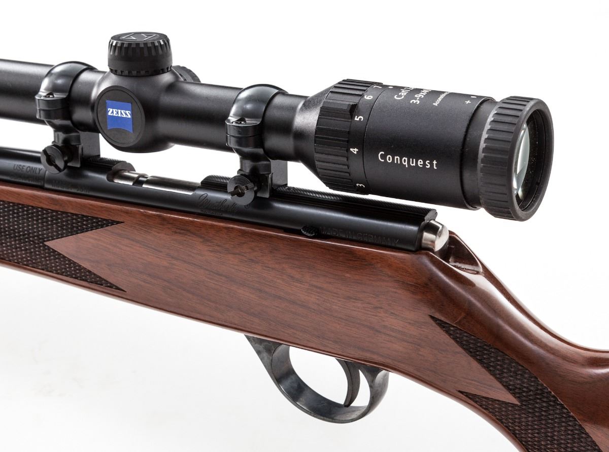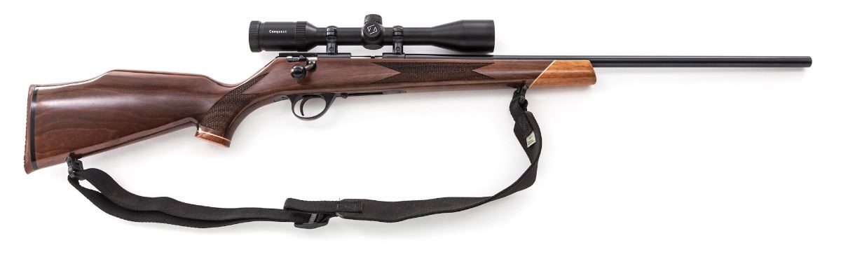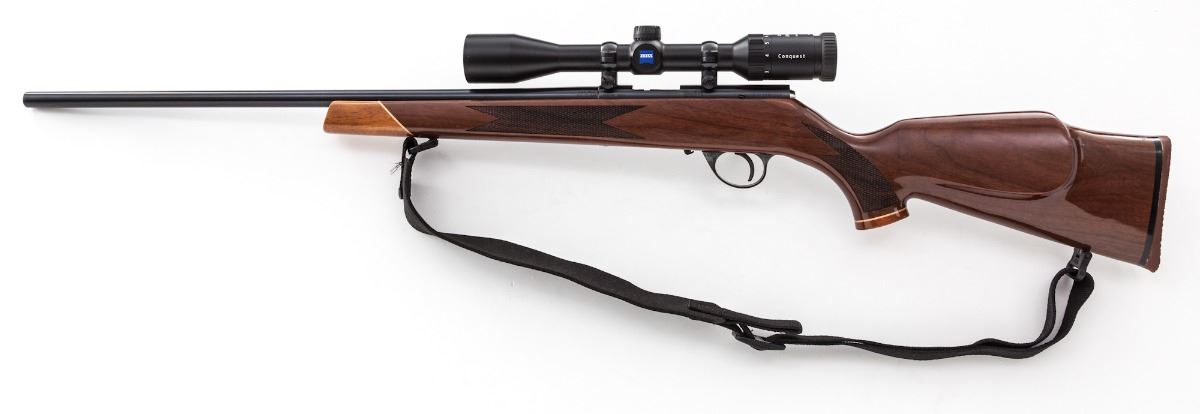 Weatherby MK XXII Bolt Action Rifle, #AS005963, .17 HMR cal., 23'' barrel, blue finish, factory checkered walnut stock with cheekpiece, rosewood forend, pistol-grip cap and maple spacers. Topped with a Carl Zeiss 3-9x40 MC Conquest scope on Weaver style mounts. No mag. Includes original box. Condition is excellent showing little use but some very light marks to stock from handling. Action is crisp, bore is bright, scope optics with duplex reticle are bright. Est.: $800-$1,200. (Modern)