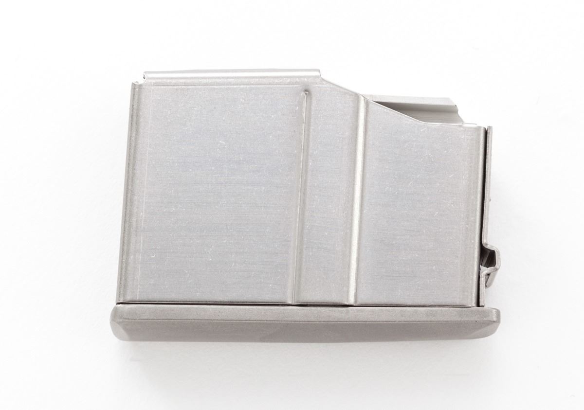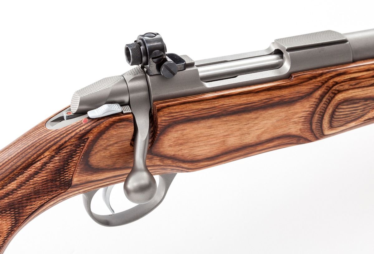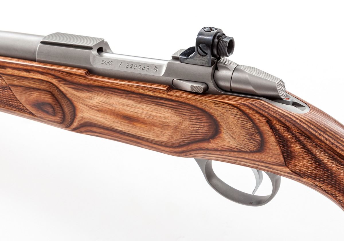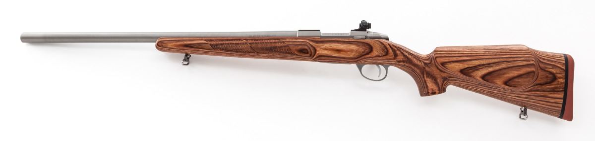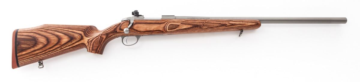 Sako Model 75 Stainless Varmint Bolt Action Rifle, #299529, .223 cal., 23-5/8'' heavy barrel, matte stainless finish, checkered pistol-grip laminated stock, stainless sling swivel eyelets and sling swivels, with unmarked red rubber recoil pad and two (2) factory magazines. Rear peep sight included, no front sight. Pistol grip cap with inlaid Sako medallion. Includes original owner's manual. Condition is excellent. Matte surfaces with just light marks from handling. Stock with vivid colors and remains like new. Action is crisp, bore is bright. Rifle appears to have seen little use. Est.: $900-$1,200. (Modern)