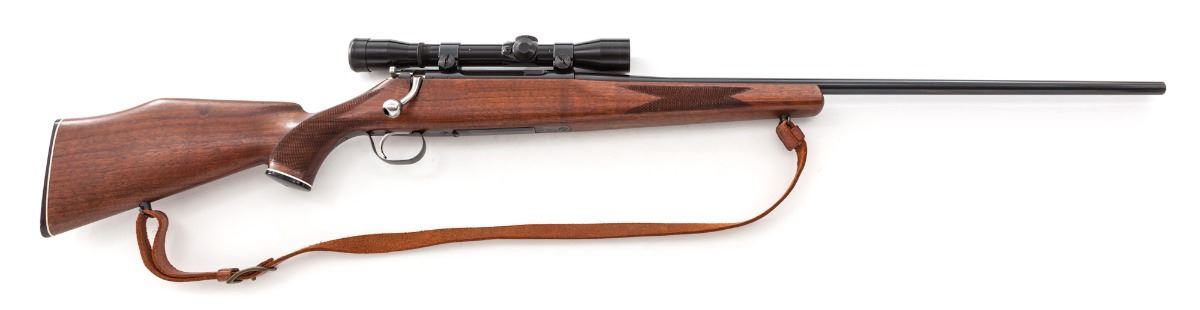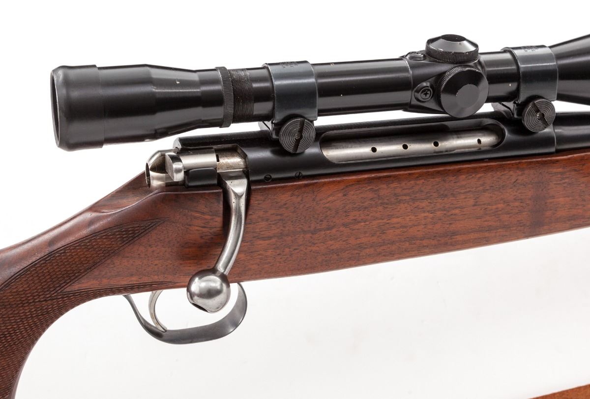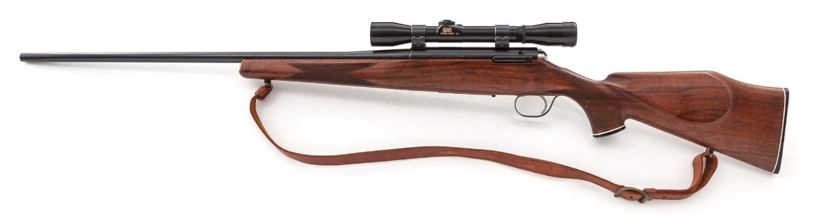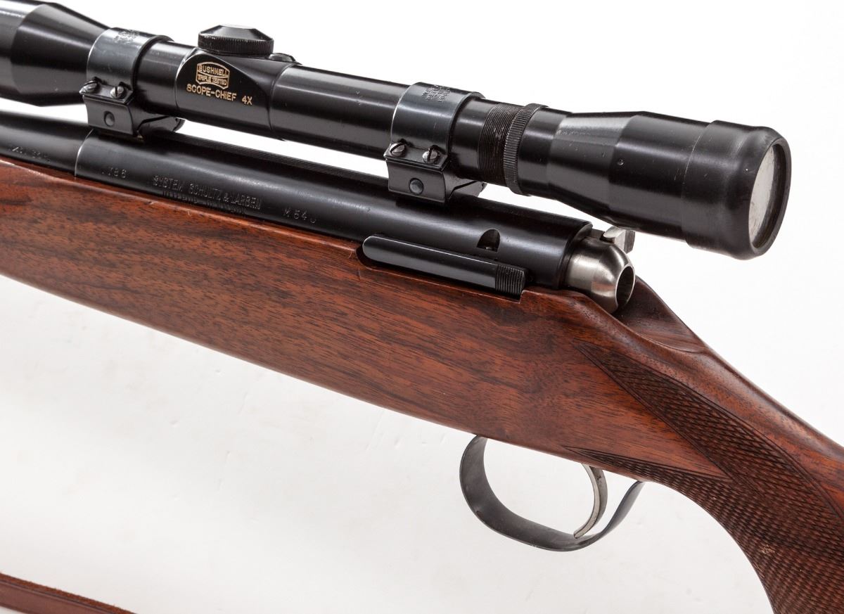 Schultz & Larsen M54J Bolt Action Rifle, #1786, 7x6lmm Sharpe & Hart cartridge, 25-1/2'' barrel, blue finish, checkered cheekpiece walnut stock, with commercial leather sling. Topped with a Bushnell 4x Scope Chief scope on Weaver rings and mounts. Condition is excellent as mfg'd in the 1950s in Denmark. Metal surfaces retain approx. 98% original factory blue. Stock with small impressions, crisp checkering, and nice even factory finish. Action is crisp, bore is bright, scope optics are clear with some discoloration to body of scope. Est.: $800-$1,200. (C&R)