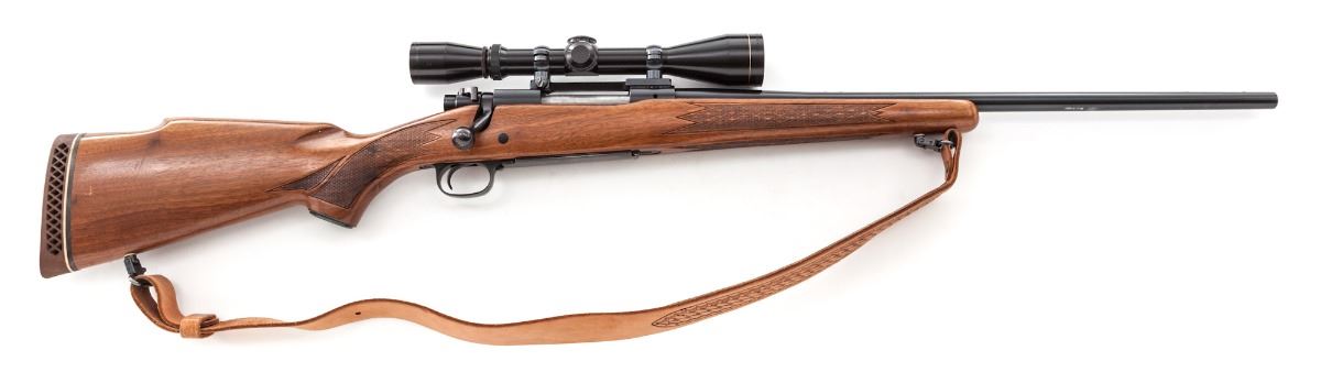 Post-64 Winchester Model 70 Bolt Action Rifle, #G974747, .30-06 cal., 22'' barrel, blue finish, pressed checkered cheekpiece walnut stock, with commercial leather sling. Topped with a Leupold 3x9 Vari-X II scope on Leupold rings and mounts. Condition is about fine showing light to moderate field use, with thinning to finish on barrel, floorplate and triggerguard. Stock with moderate flattening to pressed checkering. Action is good, bore is very good and should clean to fine, scope optics are clear. Est.: $450-$650. (Modern)