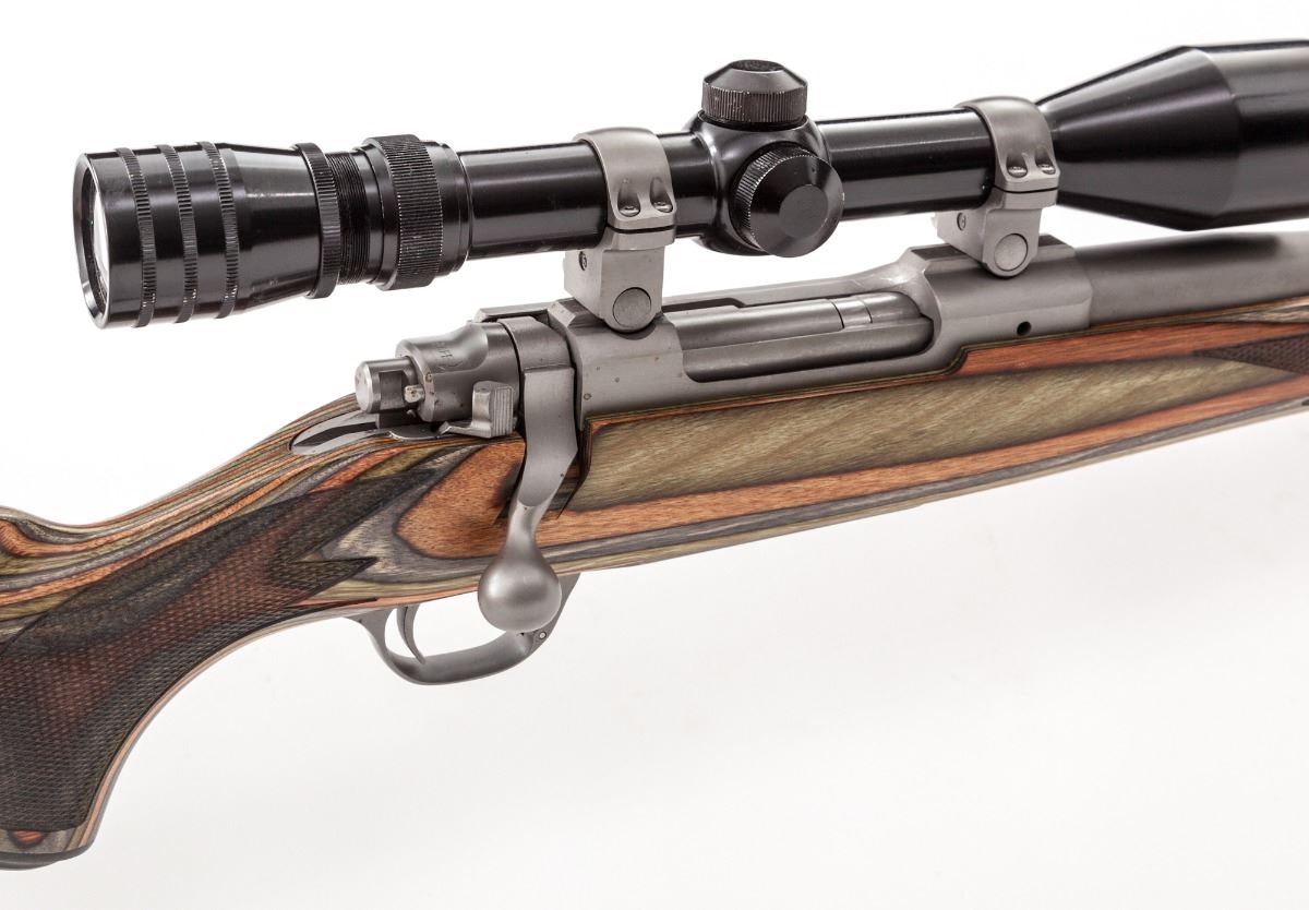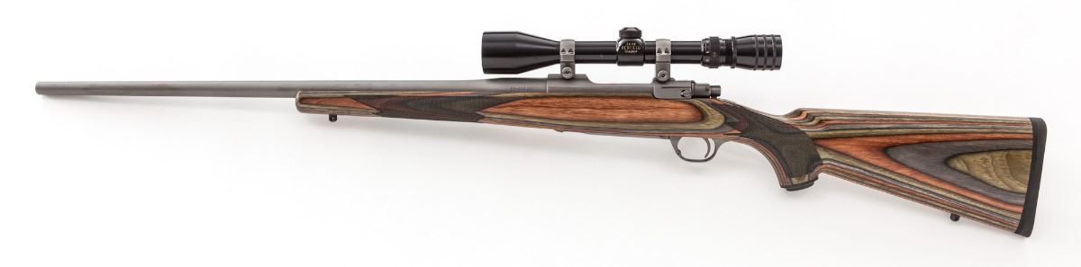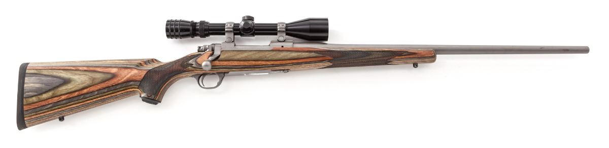 Ruger M77 Hawkeye Bolt Action Rifle, #711-10028, .22-250 cal., 24'' barrel, stainless steel, checkered laminated pistol-grip hardwood stock. Topped with a Redfield 3-9x Tracker scope. Condition is excellent showing light marks from handling to right cheekpiece area of stock. Action and bore are good, scope optics are bright. Est.: $500-$750. (Modern)