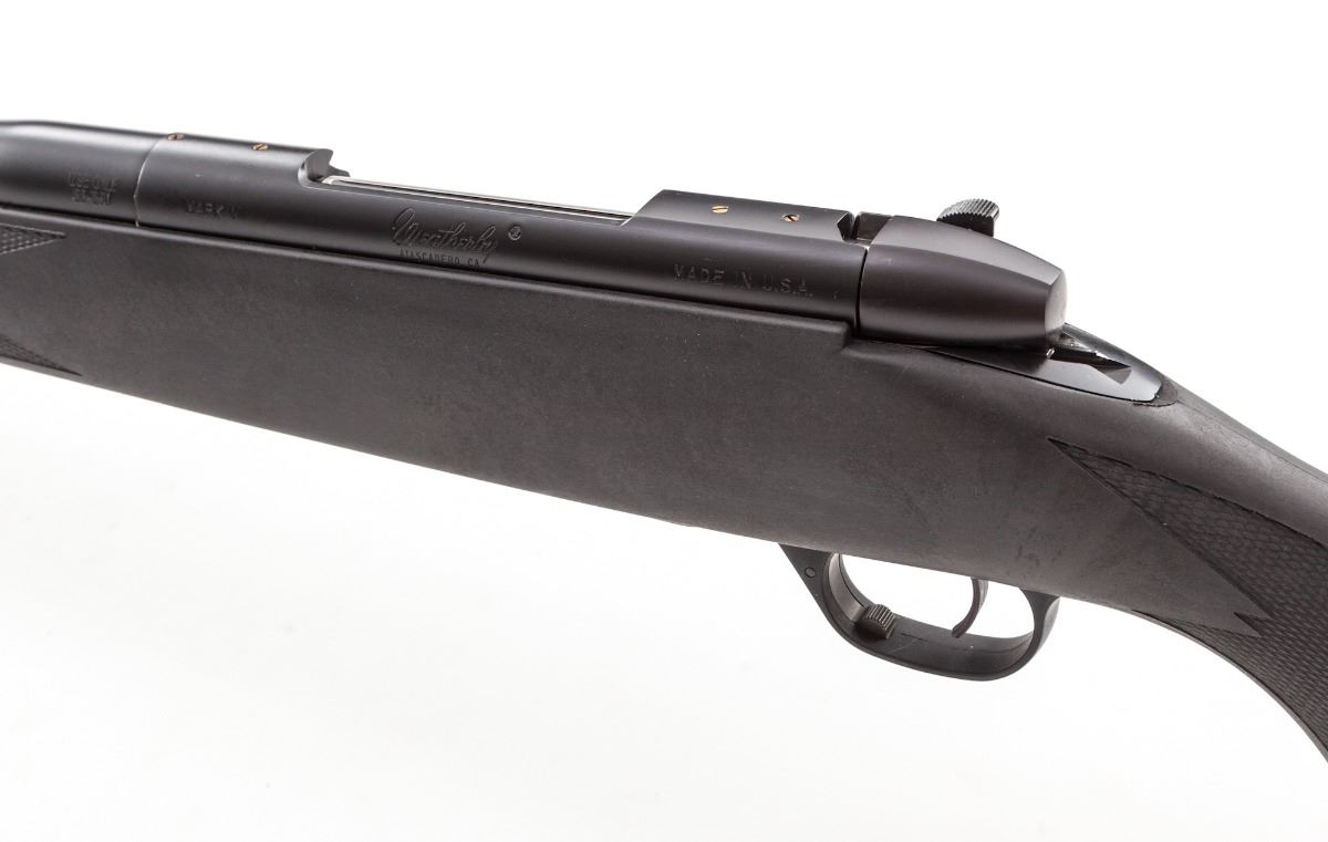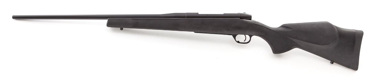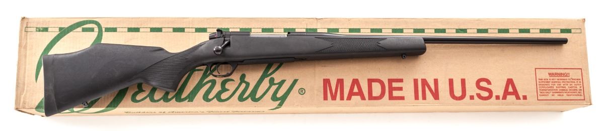 Weatherby MK V Bolt Action Rifle, #WB012395, .22-250 Rem. cal., 24'' barrel, blue finish, black checkered synthetic stock with sling swivel studs. Condition is excellent, appearing as new and unfired, in original box with paperwork. Est.: $800-$1,200. (Modern)