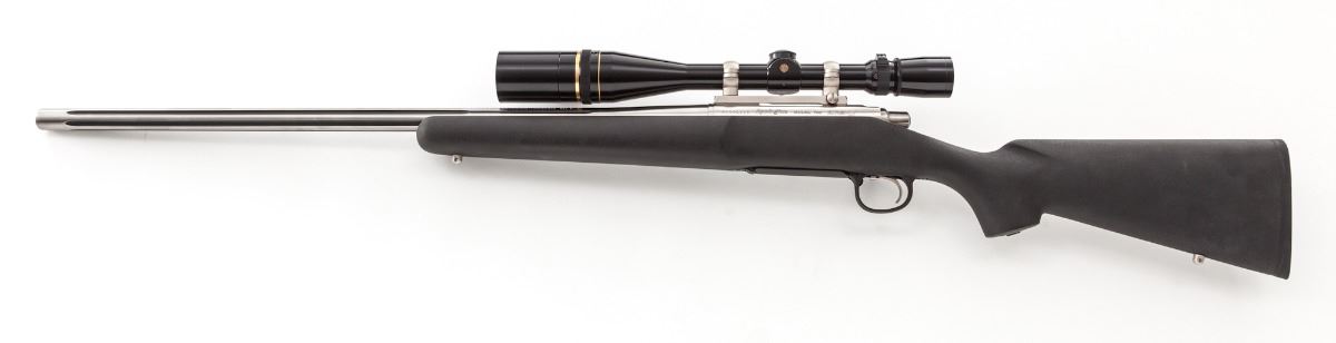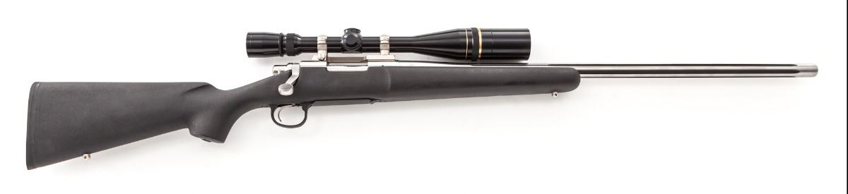 Remington Model 700 EtronX Bolt Action Rifle, #EG000115, .220 Swift cal., 26'' fluted barrel, stainless steel, black composite stock. Topped with a Leupold 6.5-20x40 scope. This rifle features a unique electric ignition system. The cartridges need special primers. The ammunition is fired via an electronic spark instead of a firing pin. This reduces lock time and, in theory, increase accuracy. Condition is excellent. Est.: $600-$800. (Modern)