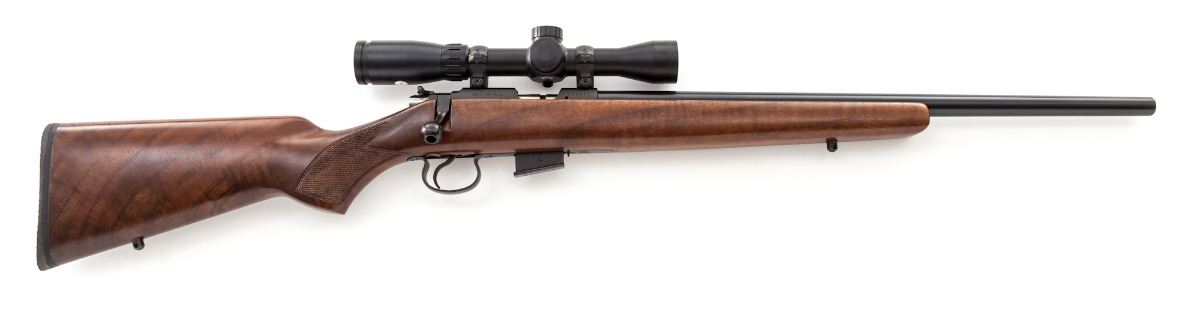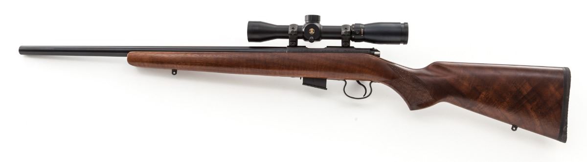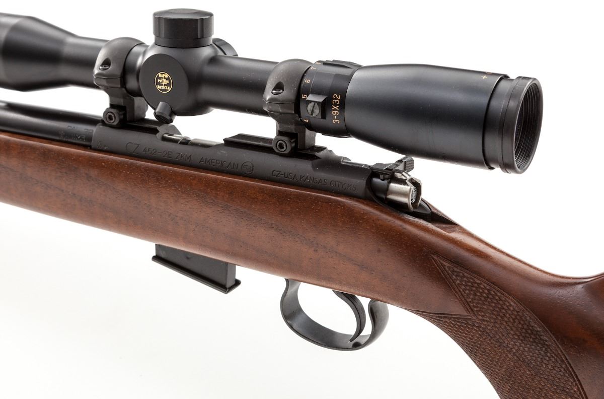 CZ 452-2E VKM American Bolt Action Rifle, #AO63251, .22 WMR cal., 21'' barrel, blue finish, factory checkered walnut stock, with one magazine. Topped with a 3-9x32 PFI scope with range finder reticle. Condition is excellent showing only the lightest marks from handling, but appearing overall as new. Est.: $350-$500. (Modern)