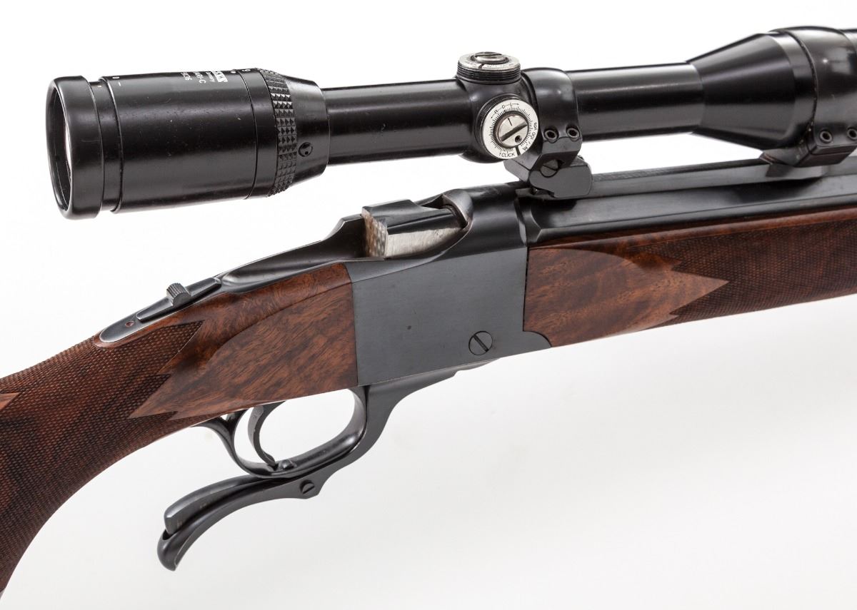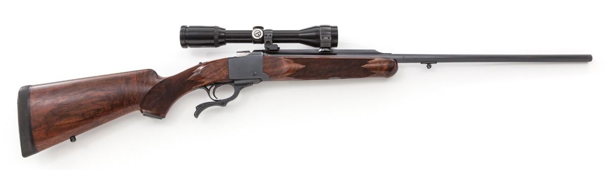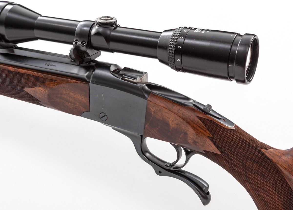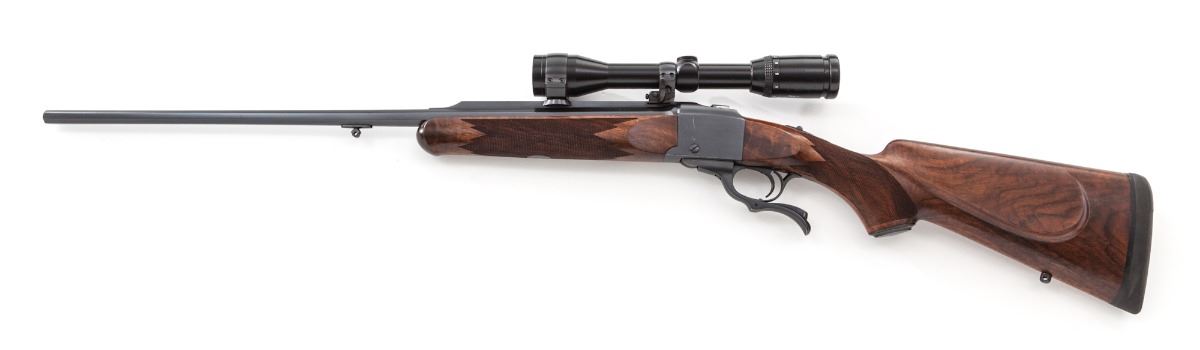 Custom Built Ruger No. 1 Single Shot Rifle, #132-84856, .300 Win. mag. cal., 23-1/2'' octagonal barrel by Friedrich Heym, rust blue finish, custom built checkered cheekpiece Mediterranean walnut stock, with engine-turned breechblock and sling swivel eyelets. Topped with a Zeiss Diavari-C 3-9x36 scope on German mounts. Condition is fine as modified showing light general use and in need of a thorough cleaning. Scratch to left side of frame. Scope body shows discoloration, which would probably clean, and is missing adjustment covers. Stock is excellent with only minor impressions. Action is good, bore is bright, scope optics are clear. Est.: $1,800-$2,400. (Modern) (Consecutive to next lot.)