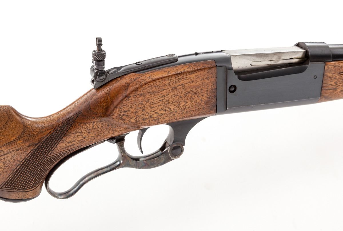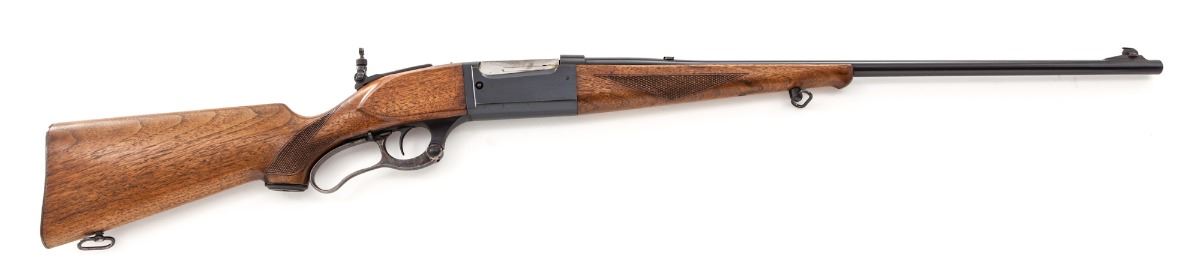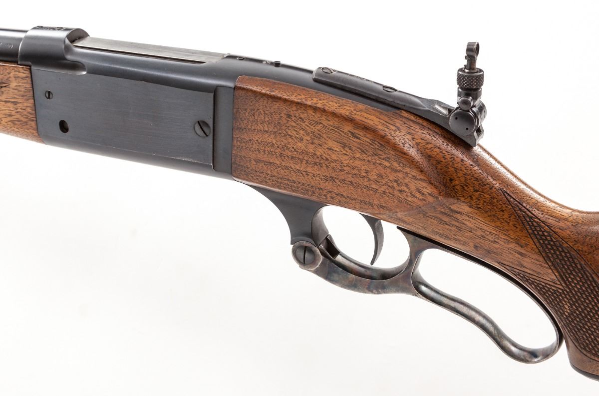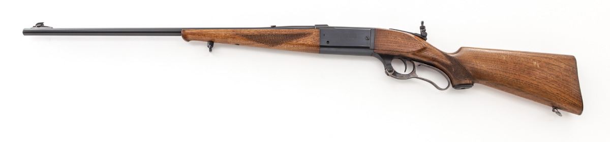 Savage Model 99 Lever Action Rifle, #423381, .300 Sav. cal., 24'' barrel, blue finish, checkered walnut stock with sling swivels, Lyman peep sight and copper bead front sight. Mfg'd 1947. Condition is very good showing light scuffs and marks to stock from field use, with plug screws where old scope mount was removed. Action is crisp, bore is bright. Est.: $500-$750. (C&R)