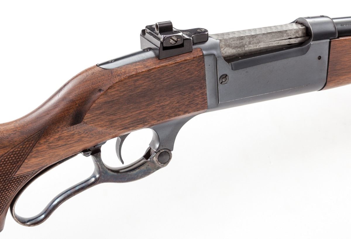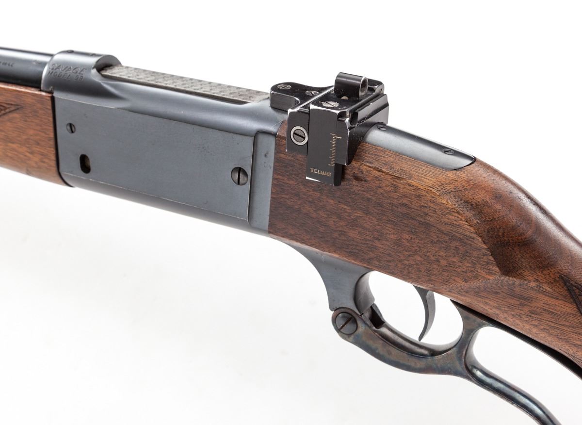 Savage Model 99EG Lever Action Rifle, #752374, .300 Sav. cal., 24'' barrel, blue finish, checkered walnut stock and forend, with Williams peep rear sight and ramp bead front sight. Condition is excellent showing some thinning at balance point, as well as high edges. Stock with minor marks. Action is good, bore is mirror bright. Est.: $600-$800. (C&R)