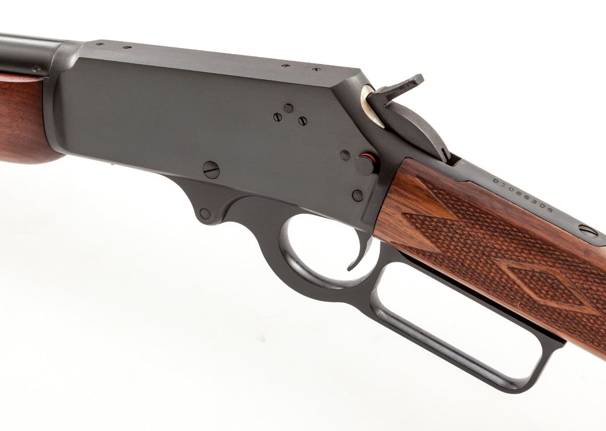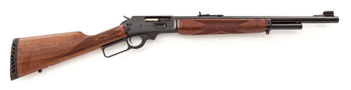 Marlin Model 1895G Guide Gun Lever Action Rifle, #01066306, .45-70 cal., 18-1/2'' ported barrel, dark blue finish, checkered straight-grip walnut stock and forend, original Marlin hard rubber recoil pad, hooded brass bead front sight, folding semi-buckhorn rear sight, with sling swivel eyelets. Condition is excellent retaining approx. 98%-99% blue. Stock with crisp checkering. Rifle shows signs of very little use. Action is crisp, bore is bright. Est.: $500-$800. (Modern)