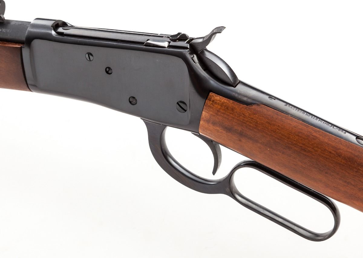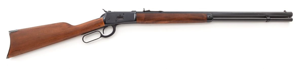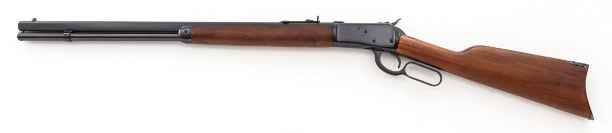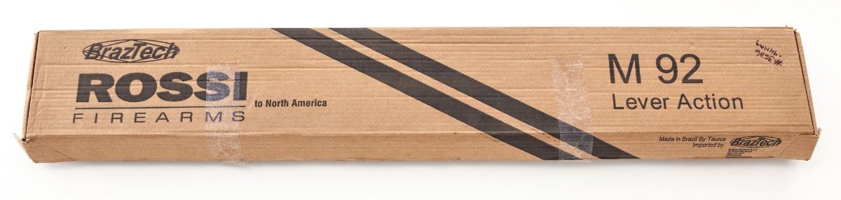 Rossi Model 92 Lever Action Rifle, #M163820, .44 mag. cal., 24'' octagonal barrel, blue finish, straight hardwood stock and forend, with blade brass bead front sight and buckhorn rear sight. In original box with matching end label and owner's manual. Condition is excellent, appearing as new. Bottom portion of frame with a small patch of fine micro-scratching near serial number. Action is crisp, bore is bright. Est.: $450-$600. (Modern)