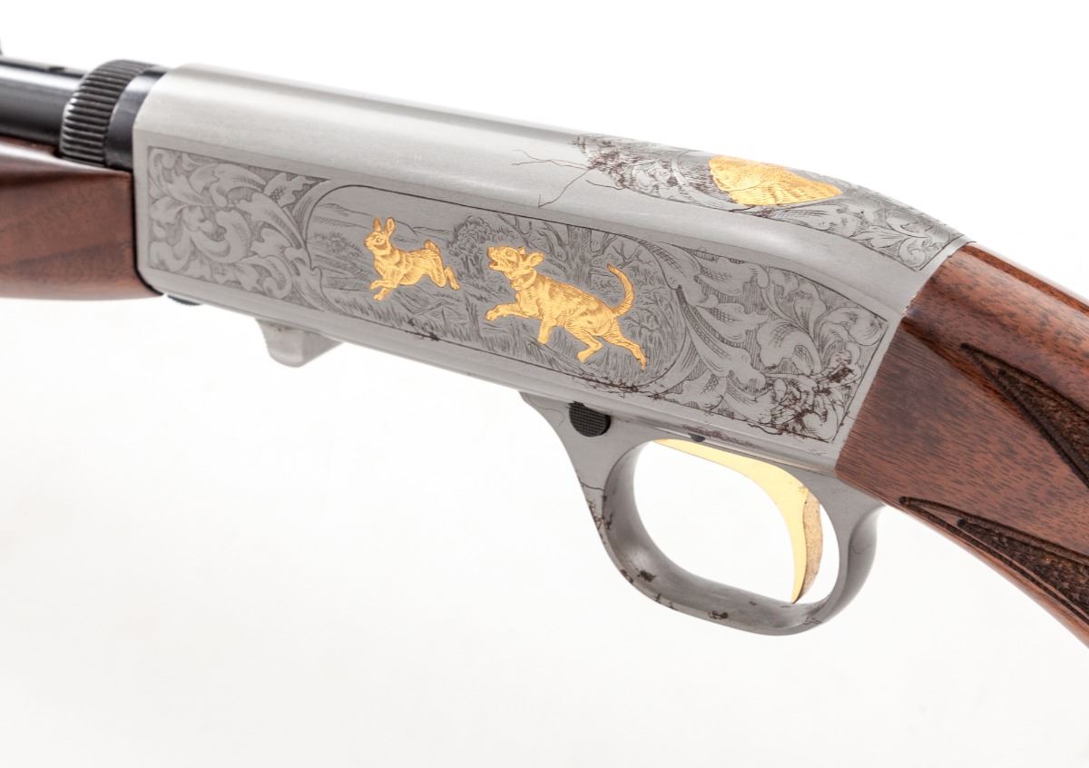Browning SA-22 Grade VI Semi-Automatic Rifle, #01323MN212, .22 LR cal., 19-1/4'' blue finish barrel with folding leaf rear sight and gold front bead, drilled and tapped for scope mount; receiver has a satin-grey finish with floral scroll engraving bordering gold-applied game scenes and a gold-plated trigger with triggerguard mounted push-button safety; checkered pistol-grip stock and forend are dark figured walnut with a high-gloss finish. Mfg'd ca. 2009. Original box and safety lock are included. Condition is good as affected by damp storage. Receiver has scattered brown oxidation and crazing from below the finish; bolt has corrosion and pitting. Barrel has light oxidation. Wood has a few handling marks. Est.: $750-$1,000. (Modern)