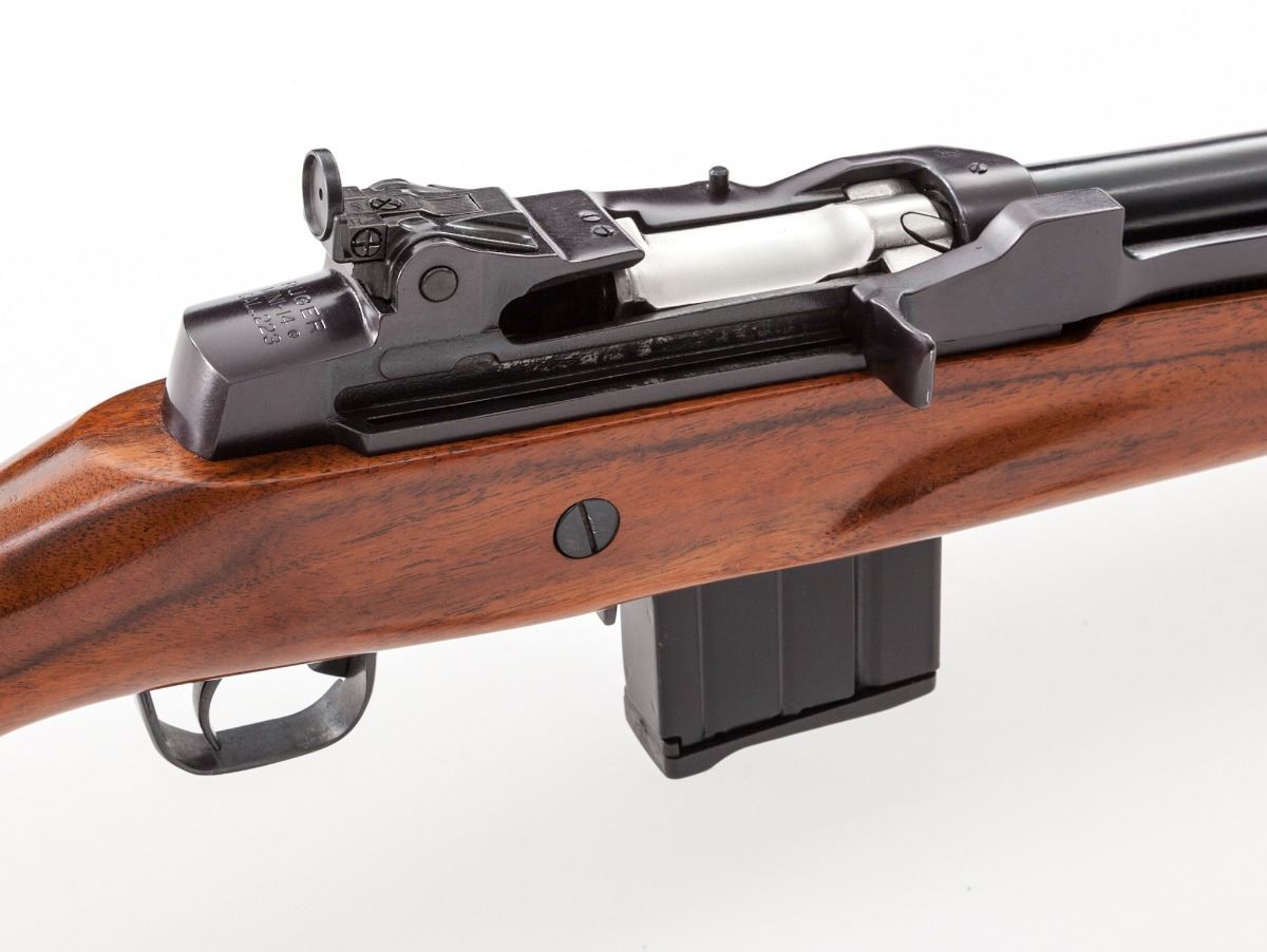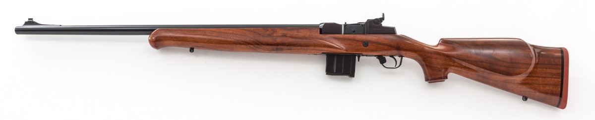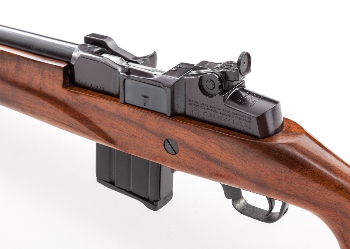 Heavy Barreled Custom Ruger Mini-14 Semi-Automatic Rifle, #186-41273, .223 cal., 26'' medium-weight barrel, non-factory blue finish, custom cheekpiece pistol-grip walnut stock, with Ruger red butt pad and one 10-round magazine. Rifle features ramped front sight with brass bead and Millett rear peep sight. Condition is excellent as modified retaining approx. 98% immersion blue. Custom stock is well executed with light marks from handling. Action is crisp with tuned trigger, bore is very good and should clean. Est.: $500-$750. (Modern)