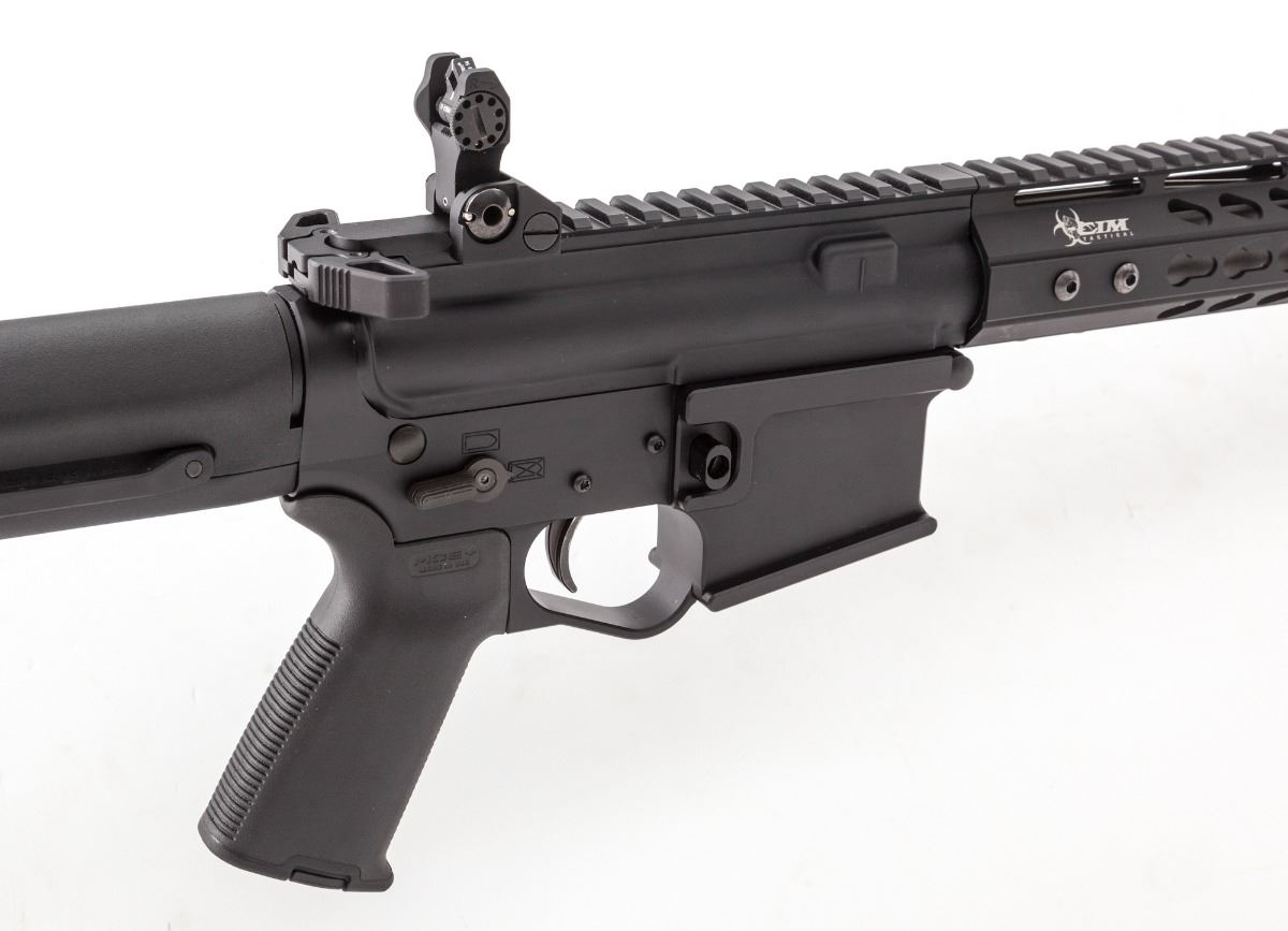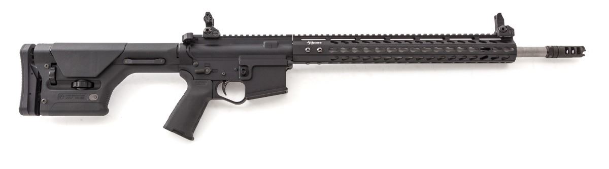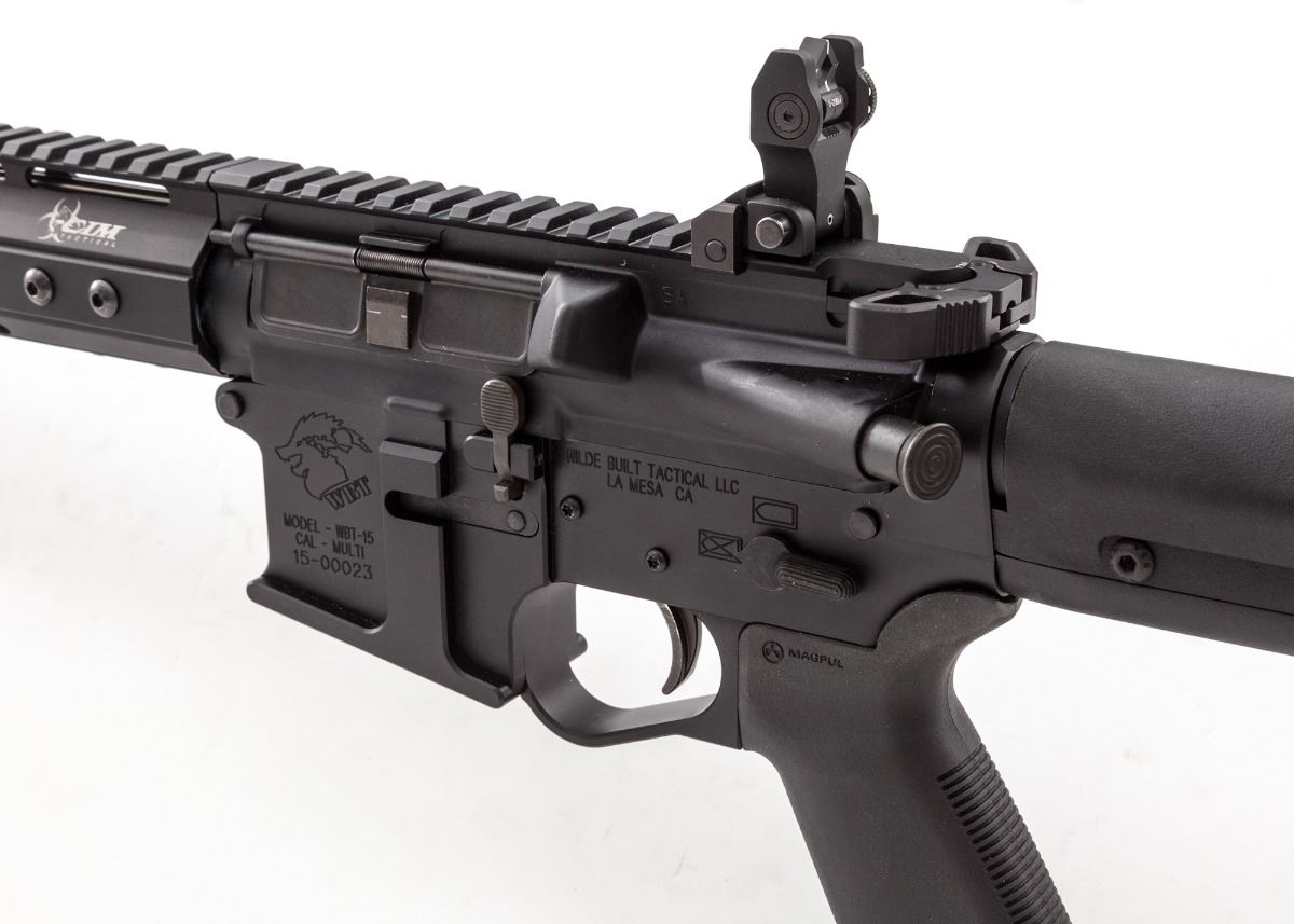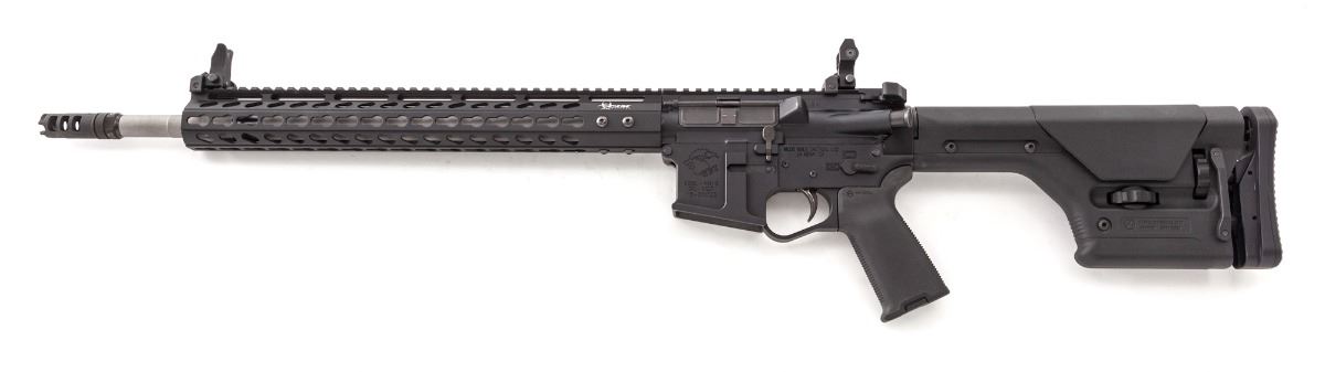 Wilde Model WBT-15 Left-Hand Semi-Automatic Rifle, #15-00023, .223 cal., 18-1/2'' stainless steel barrel, matte finish, MagPul PRS adjustable rear stock, Troy folding battle sights, Lantac muzzlebrake, with custom single stage trigger. Condition is excellent, appearing near new and possibly unfired. Est.: $1,800-$2,400. (Modern)