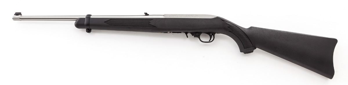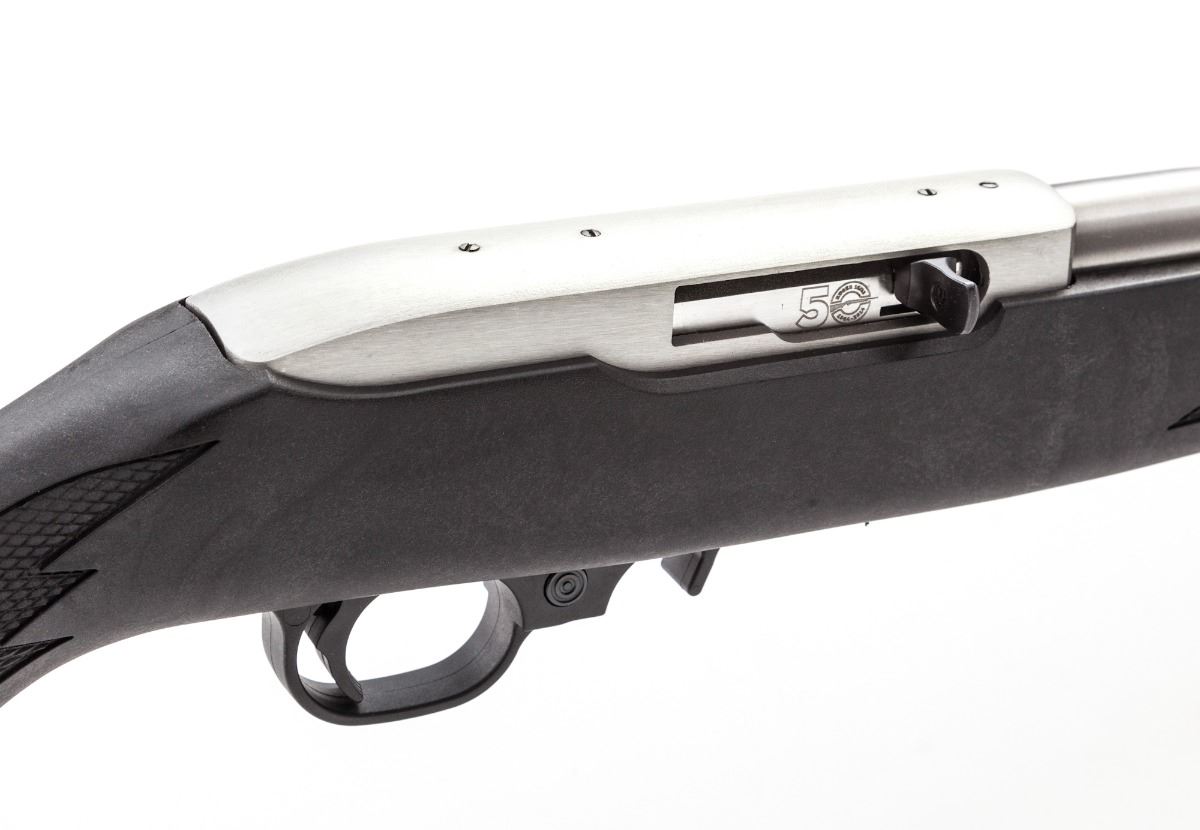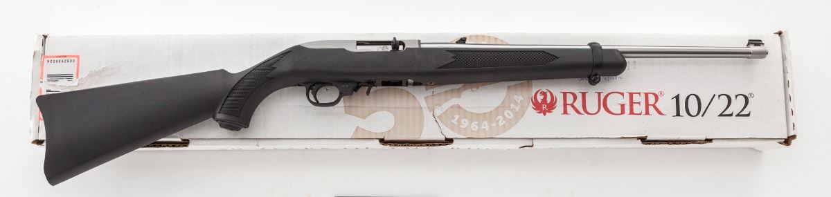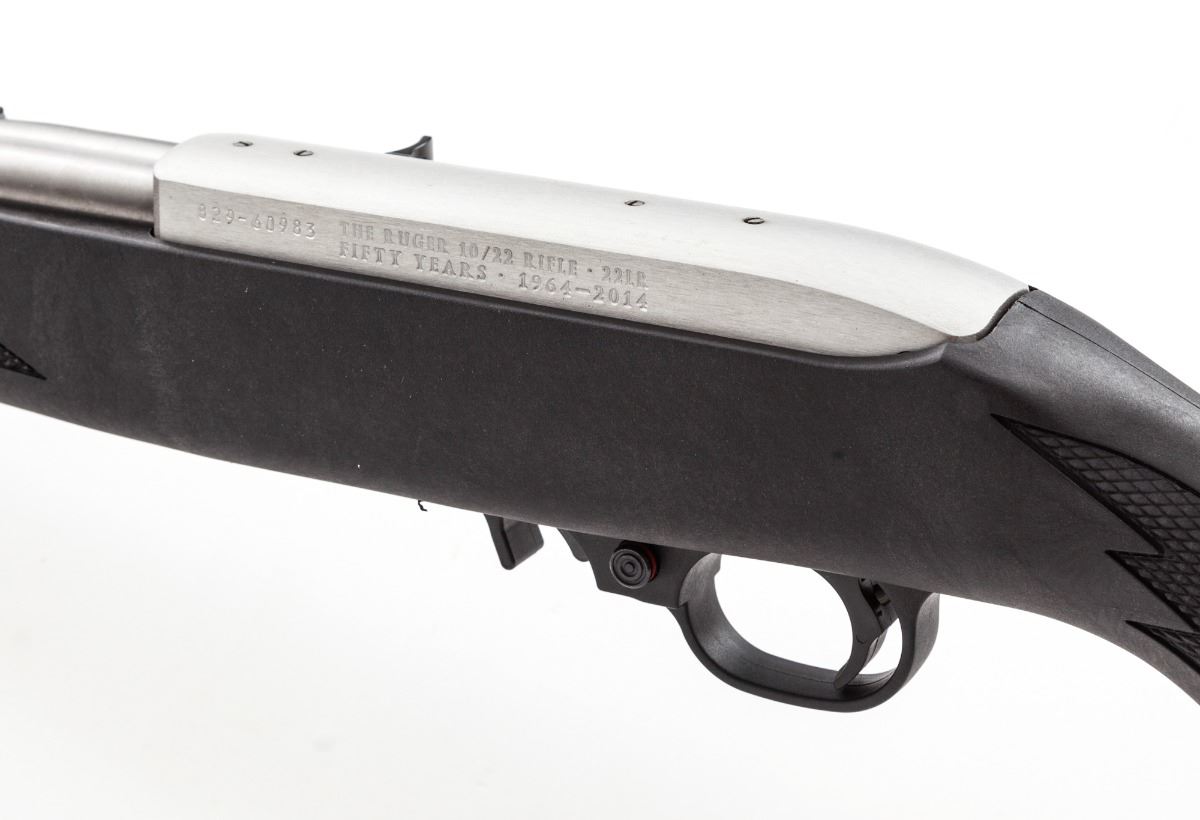 Ruger 50th Anniversary (1964-2014) 10/22 Semi-Automatic Carbine, #829-60983, .22 LR cal., 18-1/2'' barrel, stainless steel, factory checkered black nylon stock, with one magazine, scope mount base, and accessories. Condition is excellent, appearing as new and unfired. $300-$450. (Modern)