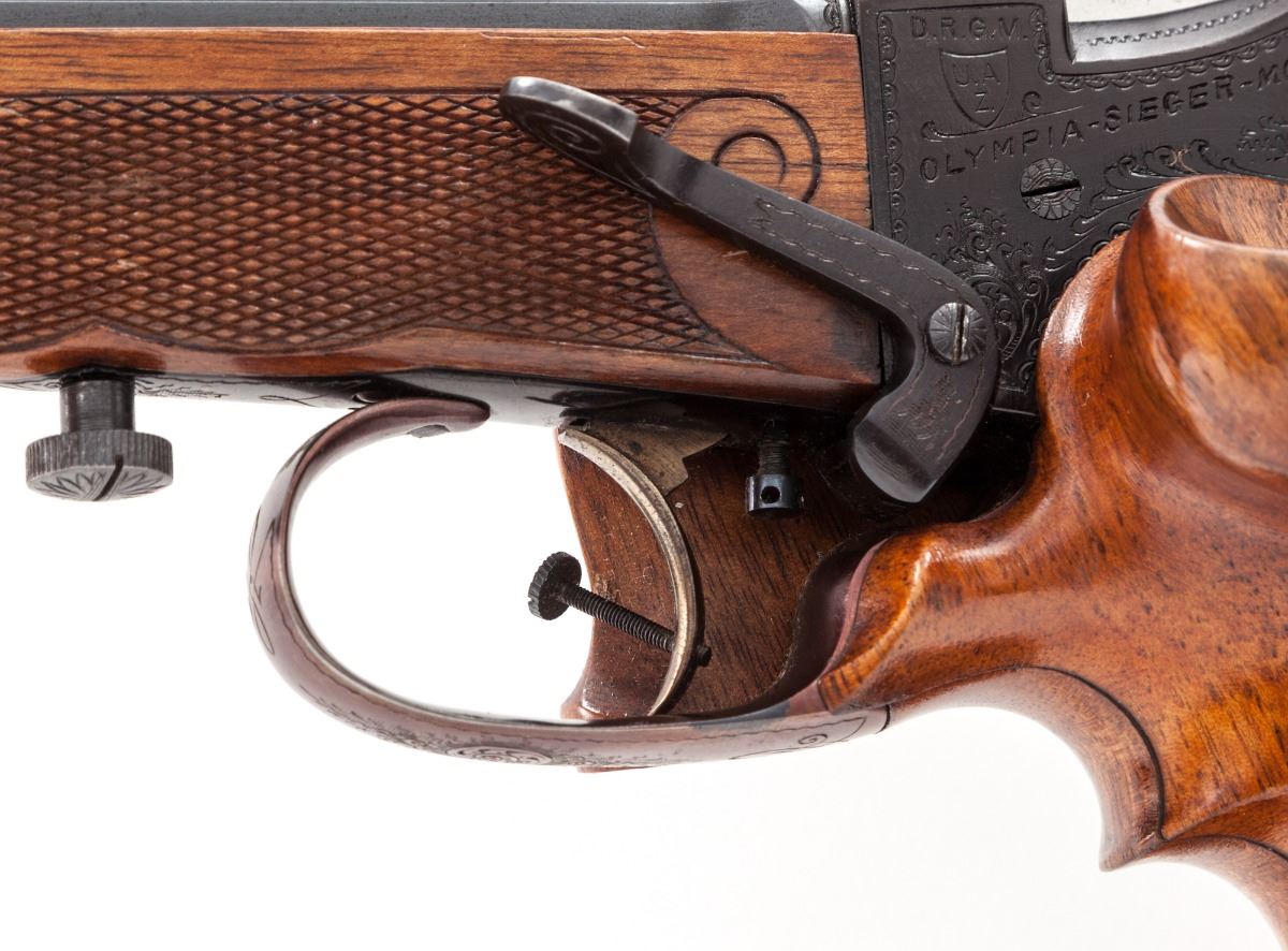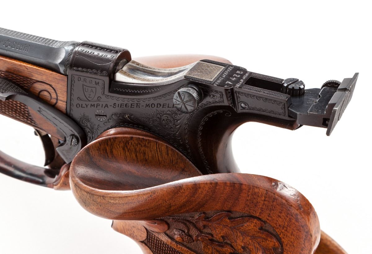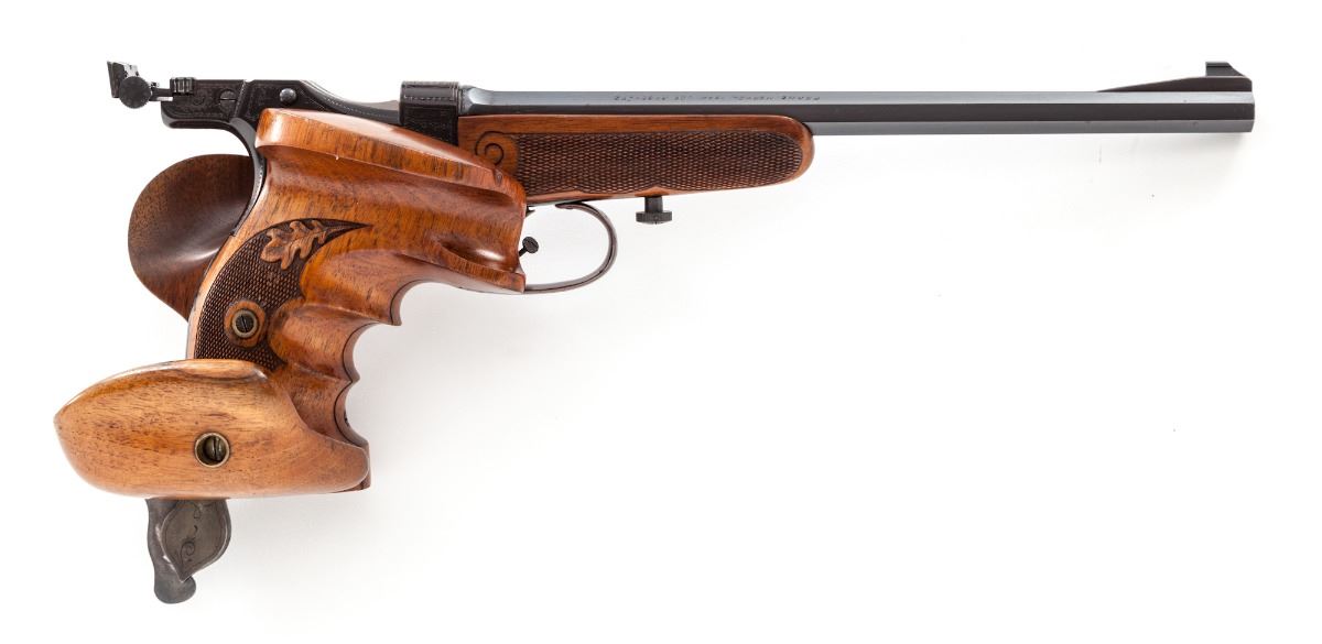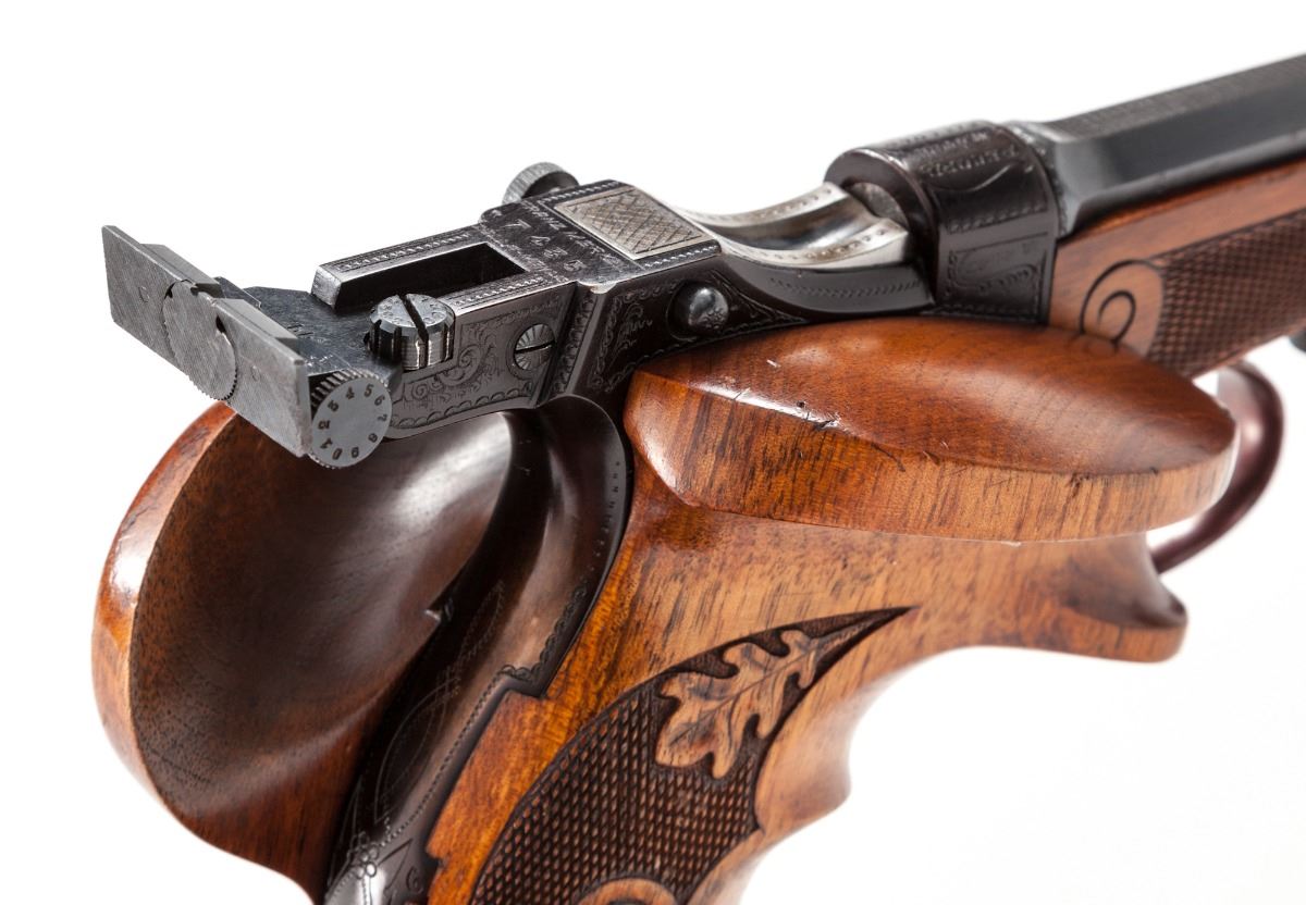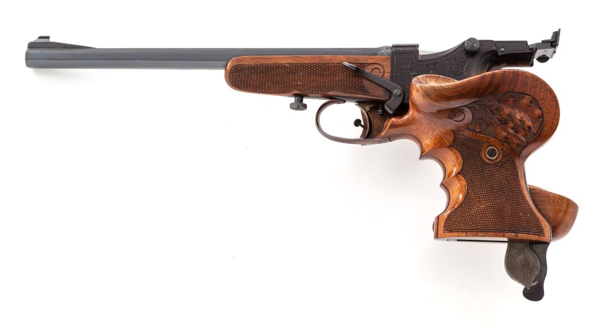 Pre-War Franz Merkel marked Model 210A Record Match Single Shot Free Pistole, #7435, .22 LR cal., 11'' octagonal barrel, blue finish, scroll engraved frame and cocking lever, inscribed ''Olympia-Sieger-Modell'', as well as ''D.R.G.M.'' and ''U.A.Z.'' in shield motif; ''(crown)/BUN'' proofmarks, both barrel and frame marked ''Zella-Mehlis''. Barrel marked near breech ''Bonler Stahl'', with beautifully carved and decorated checkered walnut target grips with acorn and oakleaf motifs. Condition is excellent showing only light marks from range use as some discoloring to grips, as well as minor wear at forward edges. Action is crisp with super-light trigger and bright bore. Est.: $1,200-$1,800. (C&R)