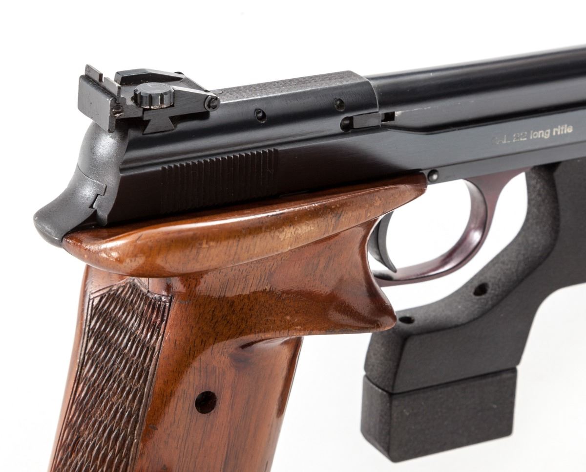 Hammerli Walther Olympia- Pistole, #0-5683, .22 LR cal., 7'' barrel with factory compensator, blue finish, checkered thumbrest, adjustable walnut grips, with factory two-piece barrel weights and one magazine. Condition is near excellent retaining approx. 90%-92% original finish, with thinning to front strap and at forward edges of slide. Grips show some finish loss in hand stop and upper portion of right panel, but remain crisp. Action is good, bore is bright. Est.: $600-$800. (C&R)