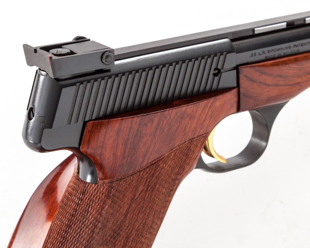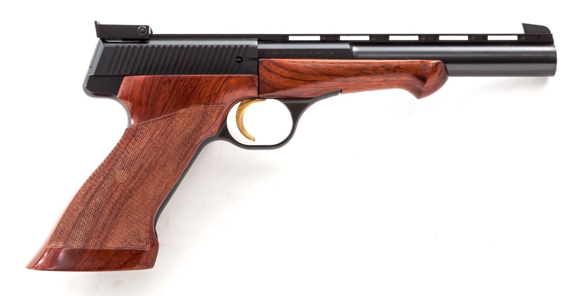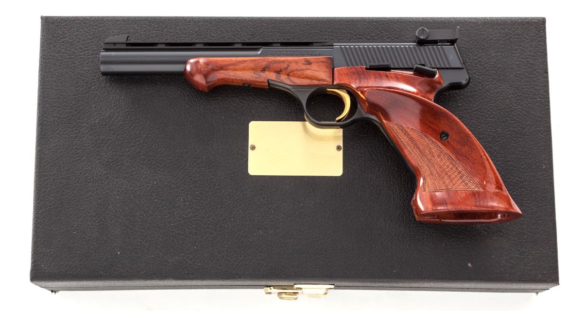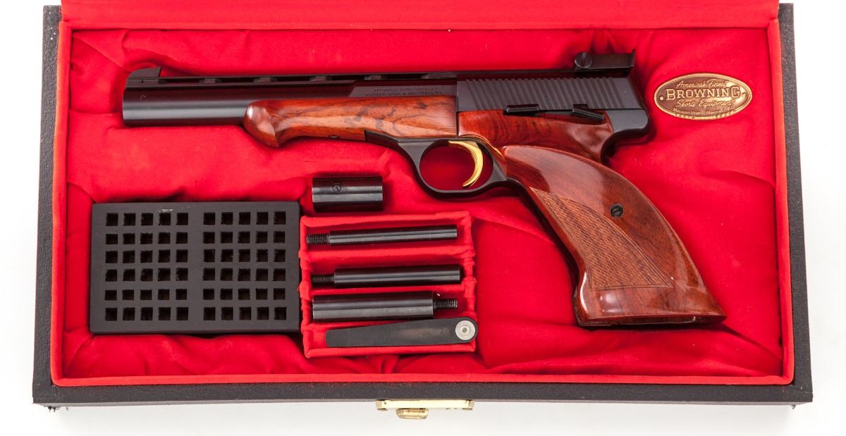 Browning Medalist Semi-Automatic Target Pistol, #70570T74, .22 LR cal., 6-3/4'' barrel, blue finish, factory checkered thumbrest mahogany grips and forend, gold-plated trigger, standard adjustable sight, with combination tool, four barrel weights and cartridge block. In red-lined faux leather Browning presentation case, with keys. Pistol lacks only the small removable brass deflector pin. Condition is excellent showing little use and appearing as new. Est.: $1,000-$1,500. (Modern)
