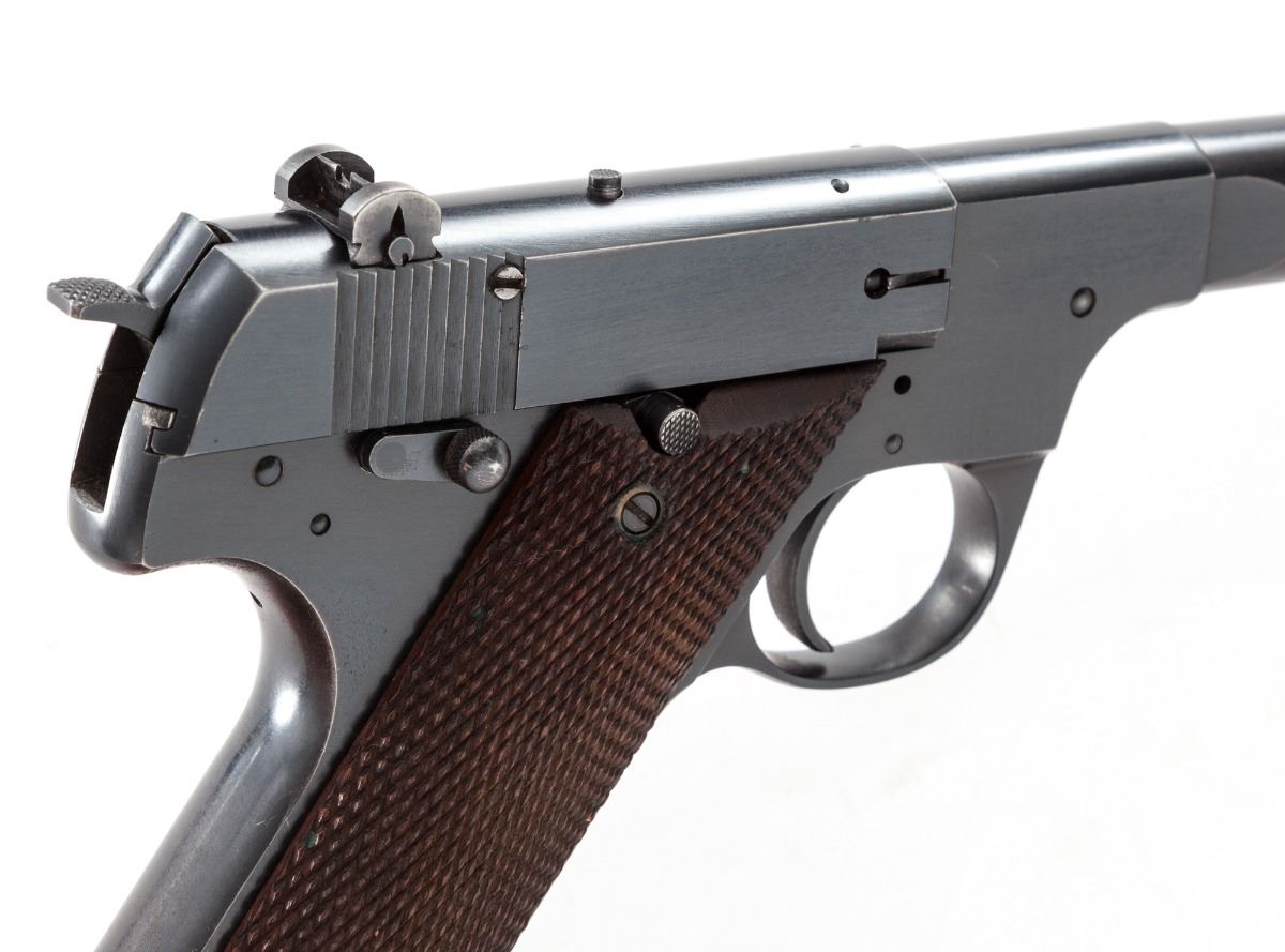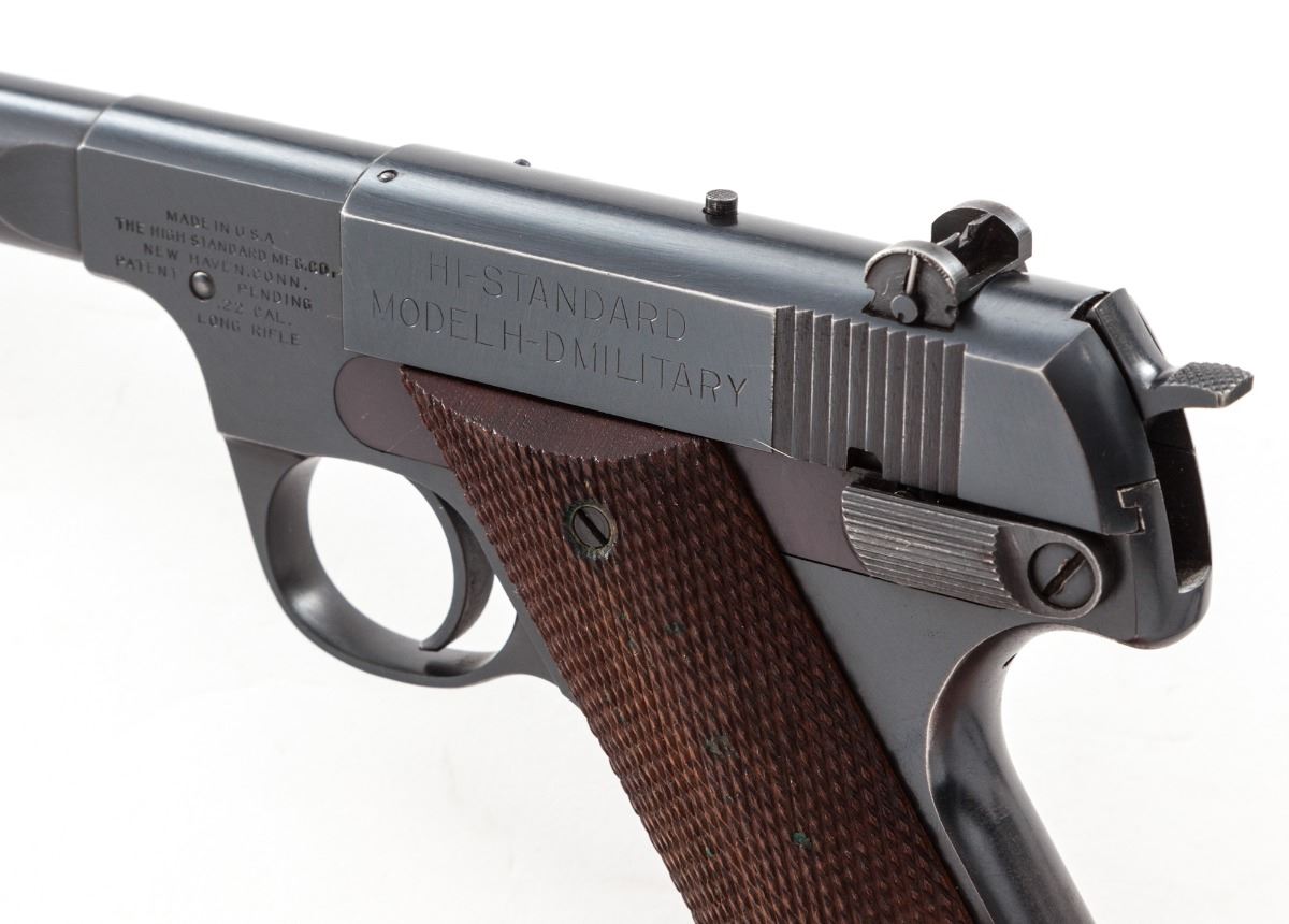Hi-Standard Model H-D Military Semi-Automatic Pistol, #169513, .22 LR cal., 6-3/4'' barrel, blue finish, factory checkered walnut grips, with one unmarked factory two-tone magazine. Condition is excellent retaining approx. 95% blue. Grips show only the lightest flattening to checks. Action is good, bore is bright. Est.: $500-$750. (C&R/PPT)