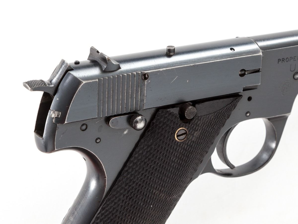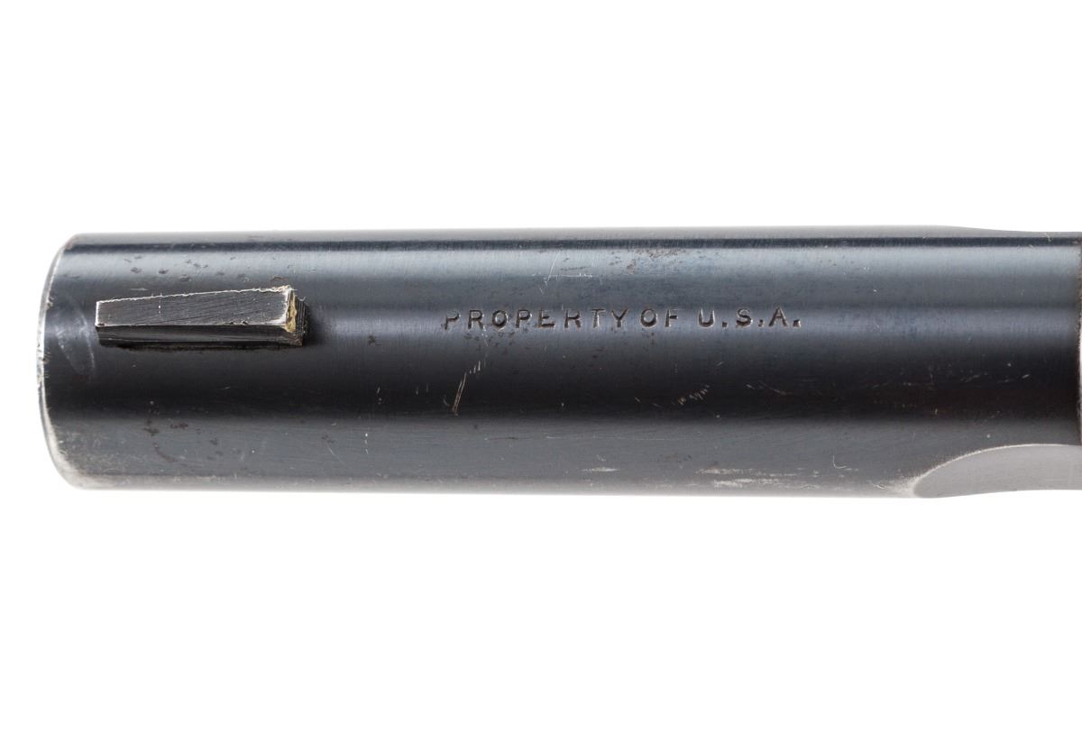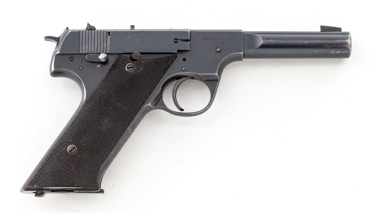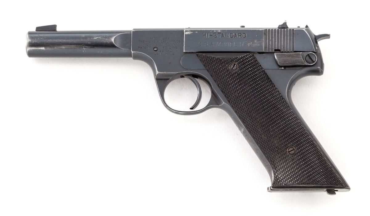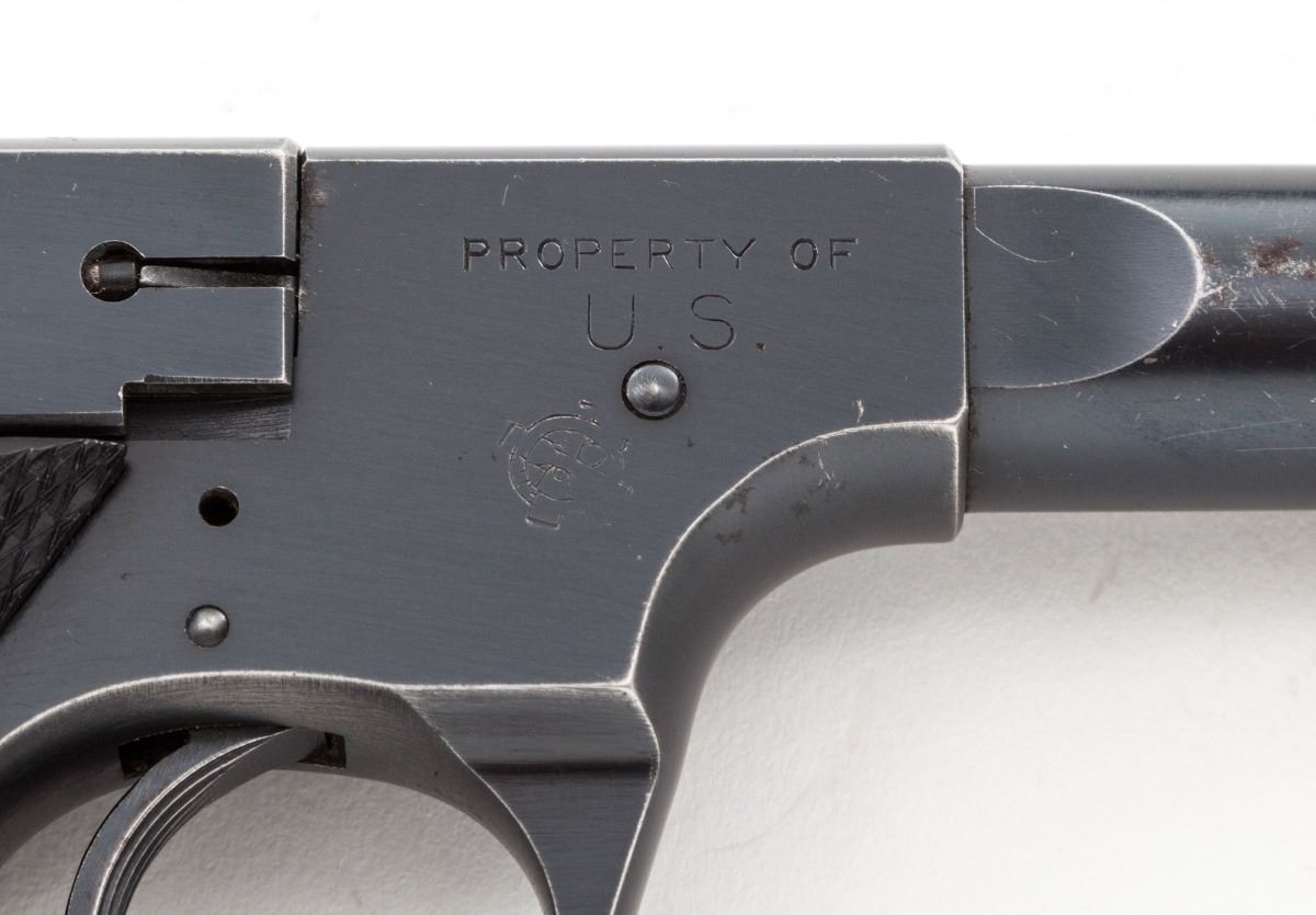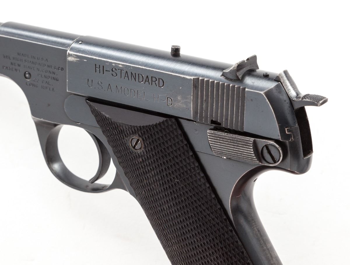 U.S. Property marked Hi-Standard USA Model H-D Semi-Automatic Pistol, #118362, .22 LR cal., 4-1/2'' barrel, blue finish, factory checkered hard rubber grips, with one unmarked magazine. Right side of frame marked ''Property of U.S.'' with ordnance wheel stamped thru the finish. Condition is very good retaining approx. 85%-90% original blue, with thinning to highpoints of heavy barrel and high edges. Grips with mild to just moderate flattening. Front and backstrap are mostly strong with about 85% blue showing. Action and bore are good. Est.: $500-$750. (C&R/PPT)