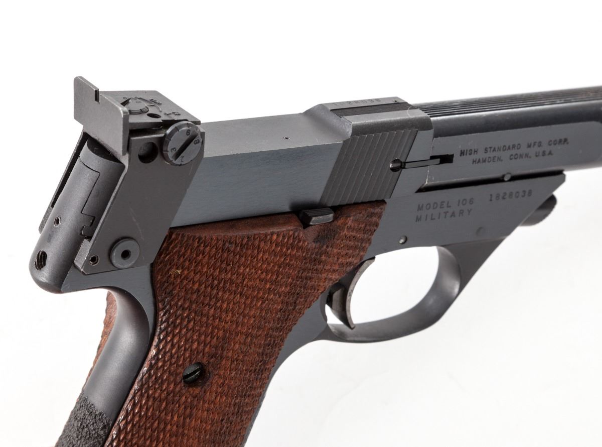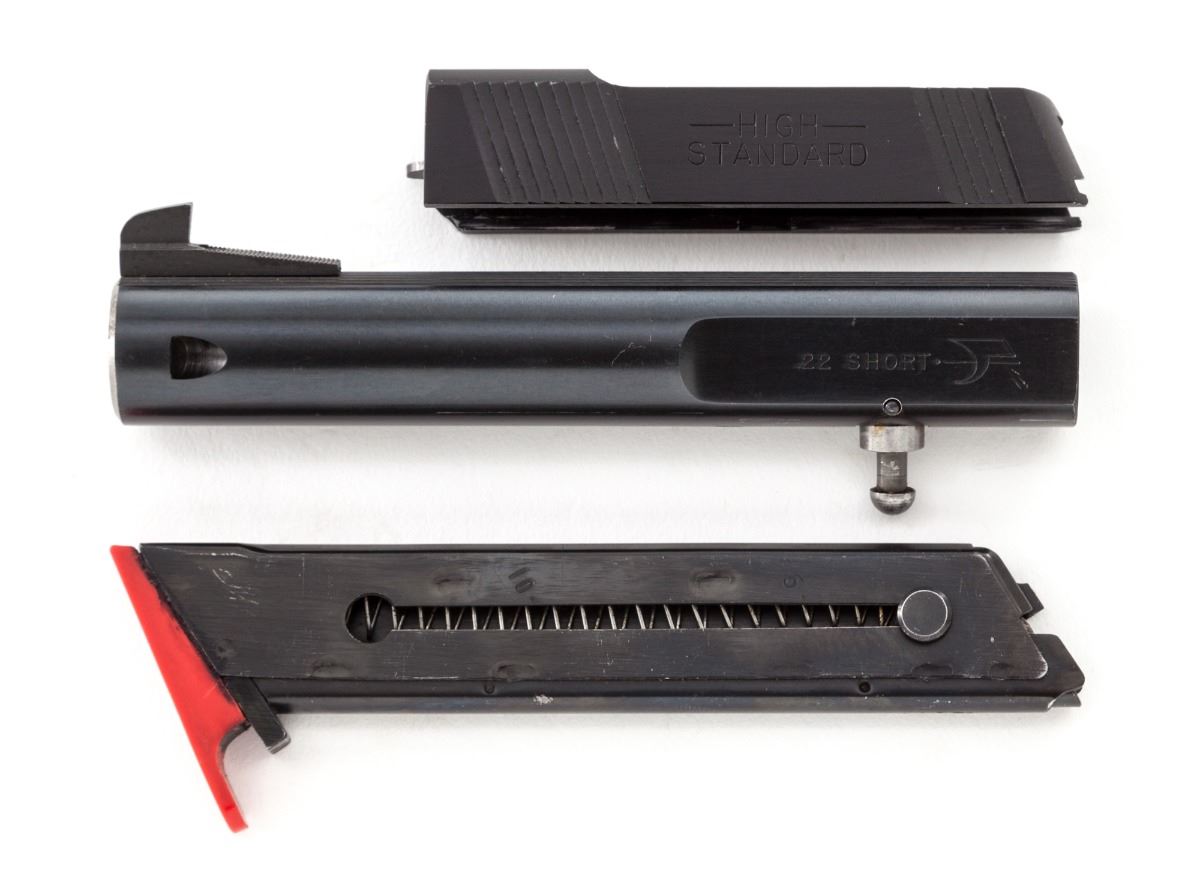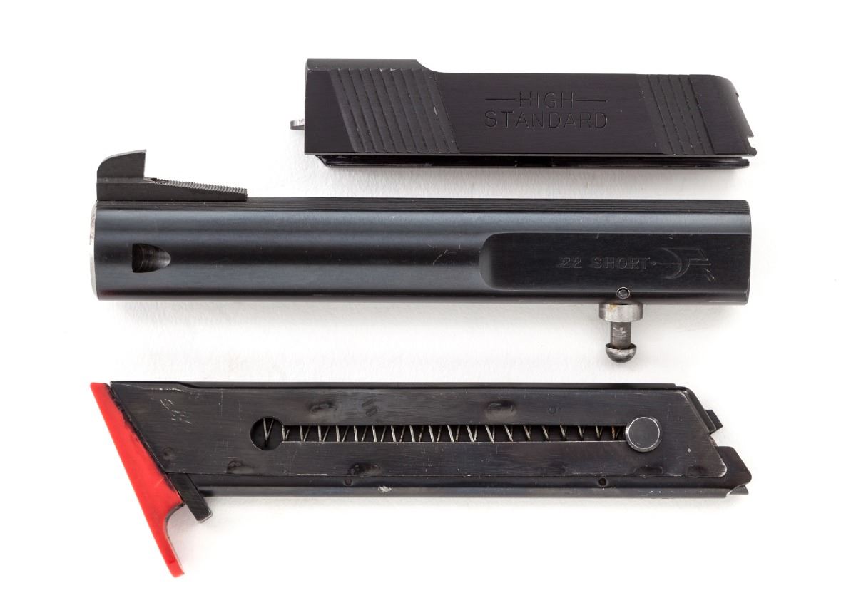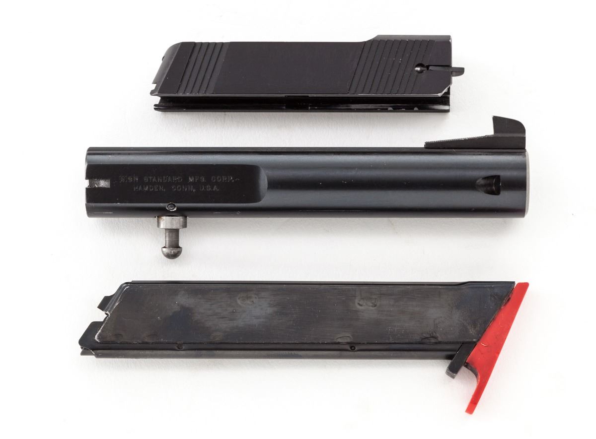 High Standard Supermatic Citation Semi-Automatic Target Pistol, Series 106, #1828038, .22 LR/.22 Short cal., 5-1/2'' barrel, blue finish, factory checkered walnut grips, with three (3) magazines, as well as a .22 Short conversion kit, consisting of a complete aluminum slide, 5-1/2'' barrel, and one .22 Short magazine. All are in excellent condition showing very little use. Est.: $800-$1,200. (Modern/PPT)
