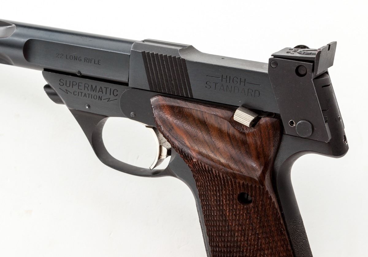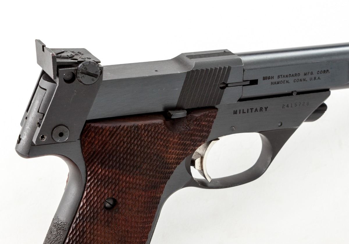High Standard Military Supermatic Citation Semi-Automatic Target Pistol, #2415728, .22 LR cal., 7-1/4'' fluted barrel, blue finish, bright safety, trigger and mag release; receiver bridge rear sight, factory checkered thumbrest military style grips, with one blue-bodied magazine. Condition is excellent showing only light marks from handling. Est.: $500-$750. (Modern/PPT)