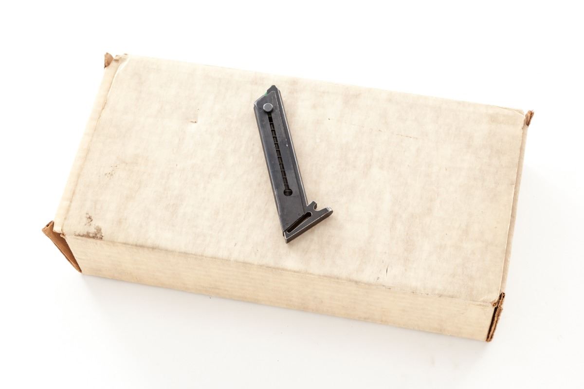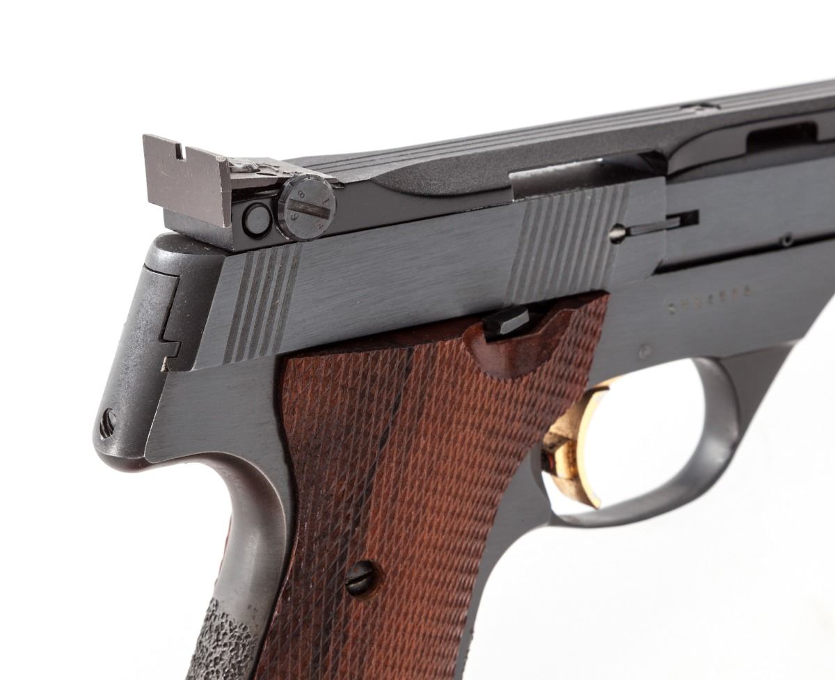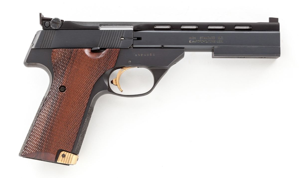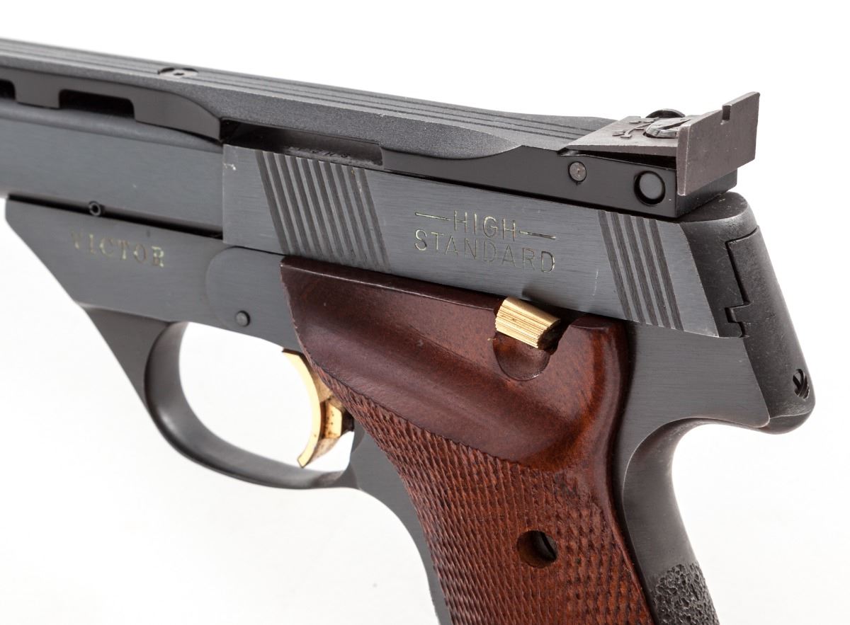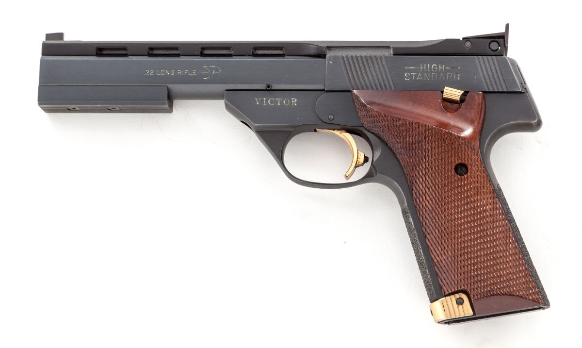 High Standard Victor Semi-Automatic Target Pistol, #SH24556, .22 LR cal., 5-1/2'' vent rib barrel, blue finish, gold trigger and mag release, checkered walnut grips, with two (2) magazines and barrel weight, in original kraft box with Styrofoam insert. Condition is excellent, appearing as new and unfired. Est.: $600-$800. (Modern)(Olympic exempt.)