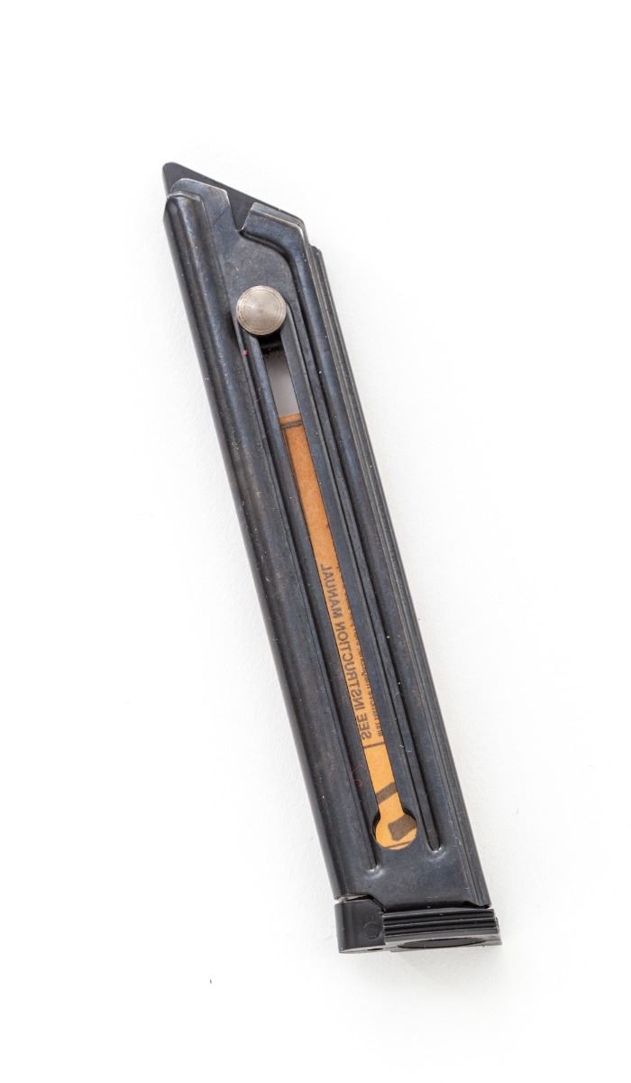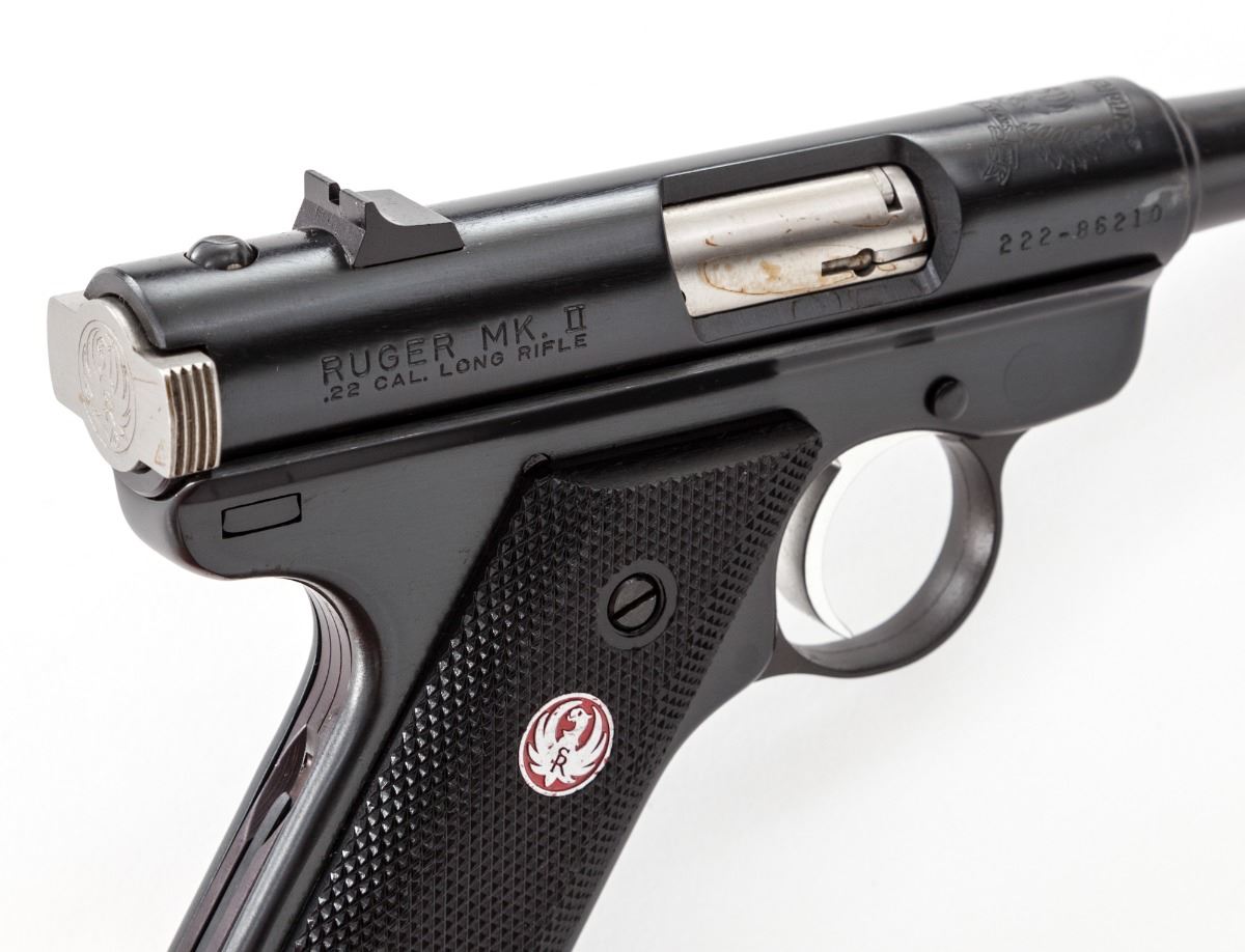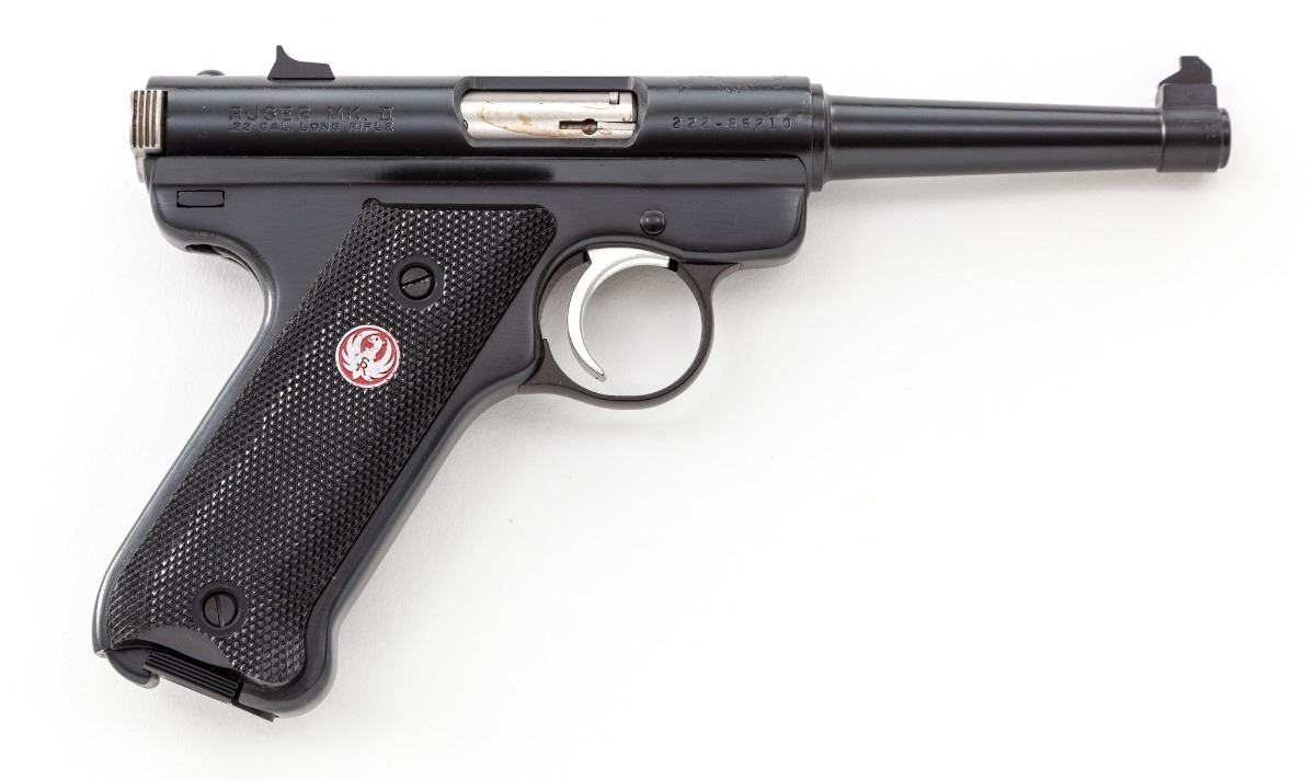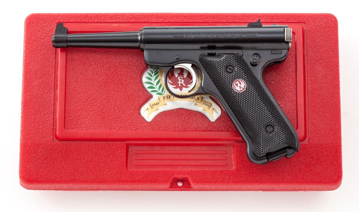 Ruger 50th Anniversary MK II Semi-Automatic Pistol, #222-86210, .22 cal., 4-3/4'' barrel, blue finish, black plastic grips with red Ruger medallions, in original Ruger red hard plastic case marked with Ruger 50 Years commemorative label (1949-1999), two (2) factory mags and associated paperwork. Condition is excellent showing only light handling marks. Est.: $300-$450. (Modern/PPT)