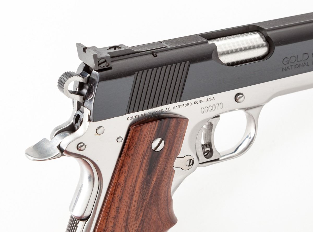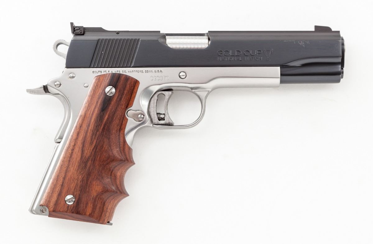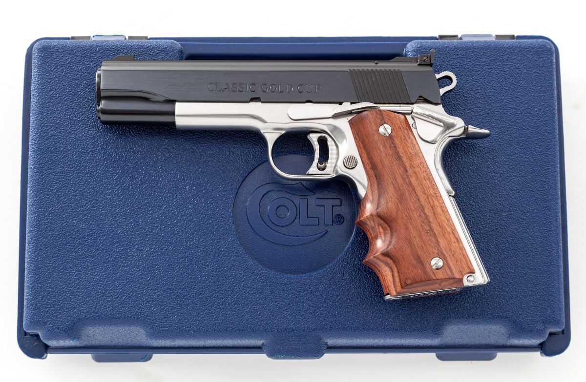 Colt National Match Classic Gold Cup Semi-Automatic Pistol, #CGC070, .45 ACP cal., 5'' barrel, blue slide, bright frame, wraparound smooth walnut grips, with Series 80 firing pin safety, flat mainspring housing, jeweled trigger, extended slide release, with two (2) Colt factory magazines. Condition is excellent, appearing as new, in original hard case with slipcover. Est.: $1,000-$1,500. (Modern)