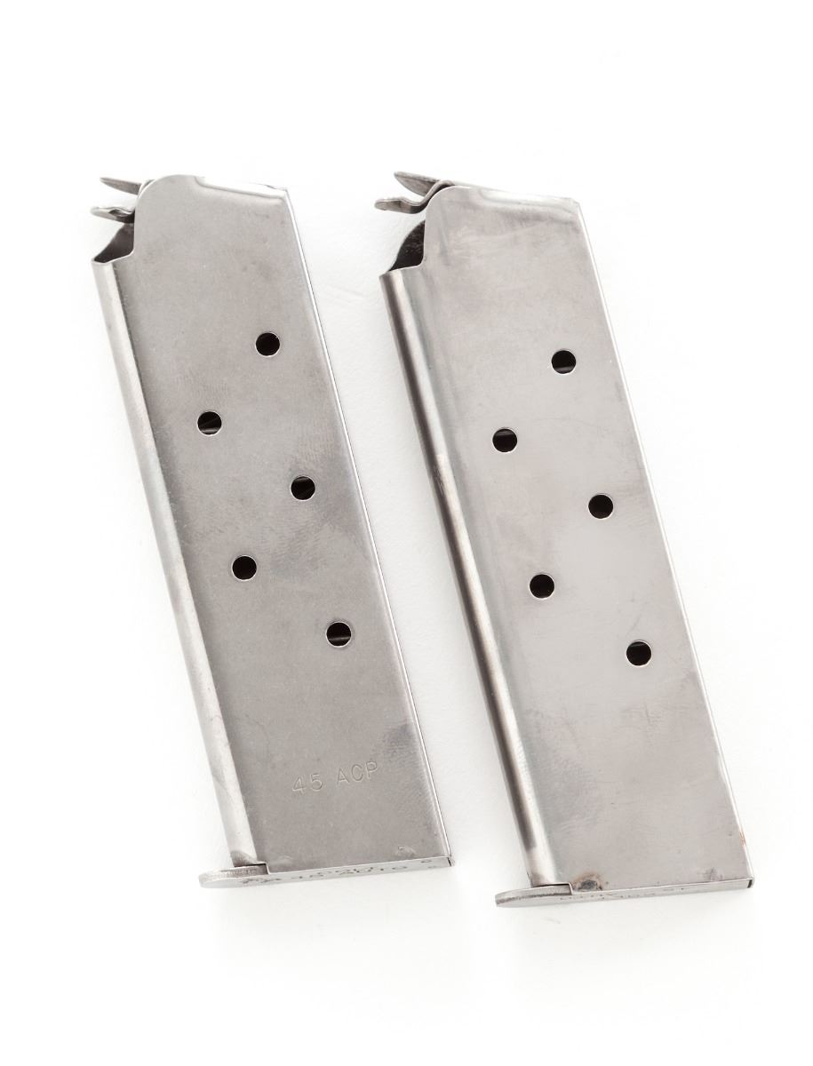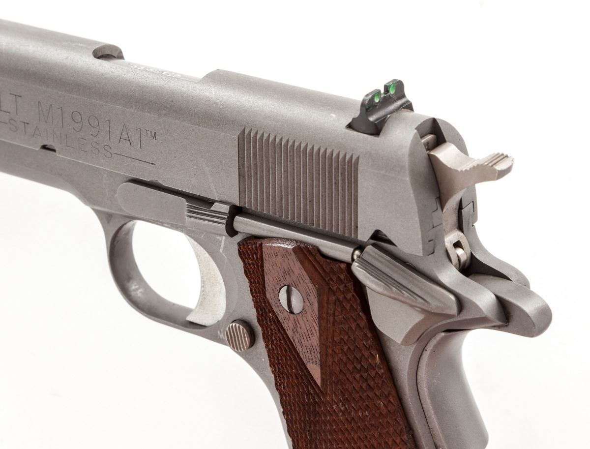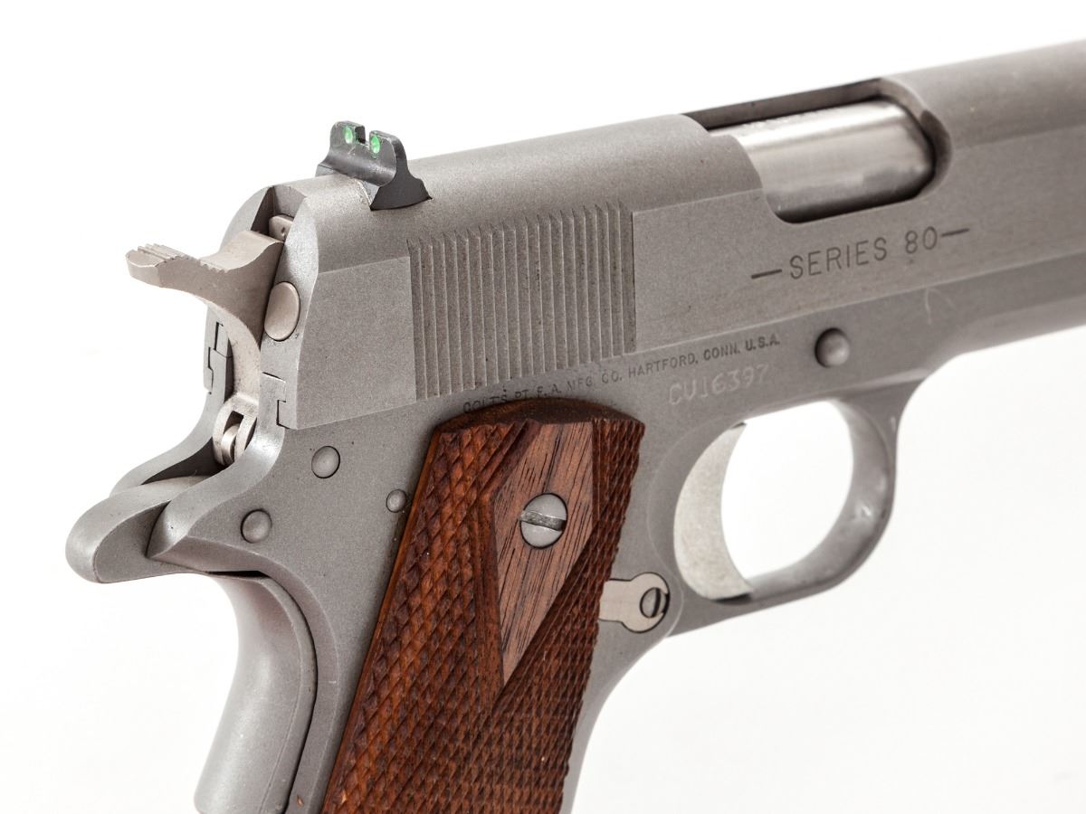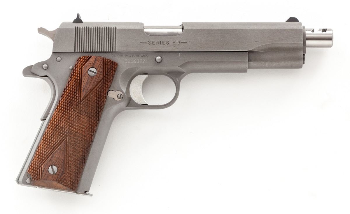 Colt M1991-A1 Series 80 Semi-Automatic Pistol, #CV16397, .45 ACP cal., 5-3/4'' compensated barrel by EFK, matte stainless steel finish, checkered large diamond walnut grips, with two (2) Colt factory stainless steel magazines and one aftermarket magazine. Condition is excellent as modified showing just light use. Est.: $600-$800. (Modern/PPT)