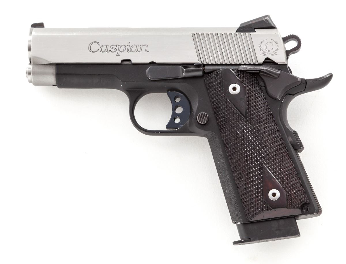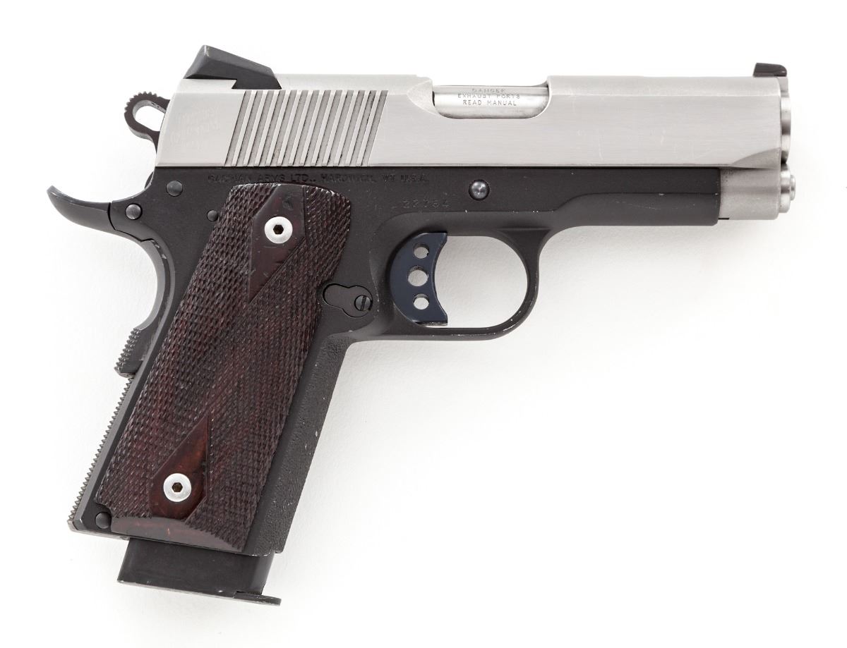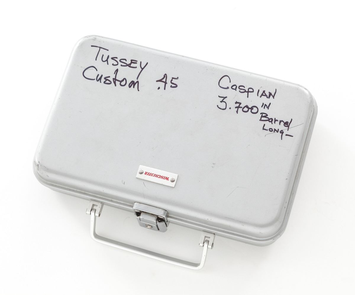 Lightweight Tussey Junior Custom Semi-Automatic Pistol, #22764, .45 ACP cal., ported 3-1/2'' barrel, stainless steel slide, lightweight alloy frame, checkered walnut grips, with one 8-round Colt magazine. Custom built by Terry Tussey, Carson City, NV, using a Caspian slide and frame, flat checkered mainspring housing, extended beavertail safety, Novak's sights, spring guide tube, with tuned action. Condition is very good to fine showing moderate carry and field use as light scratches to frame and slide, and losses to varnish on grips. Good action and bore. Tussey guns of this type start at $4,000 with a back log of 3- to 6-months waiting time. Est.: $1,800-$2,400. (Modern/PPT)