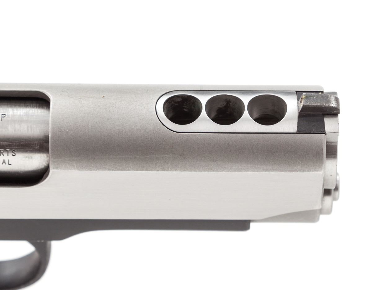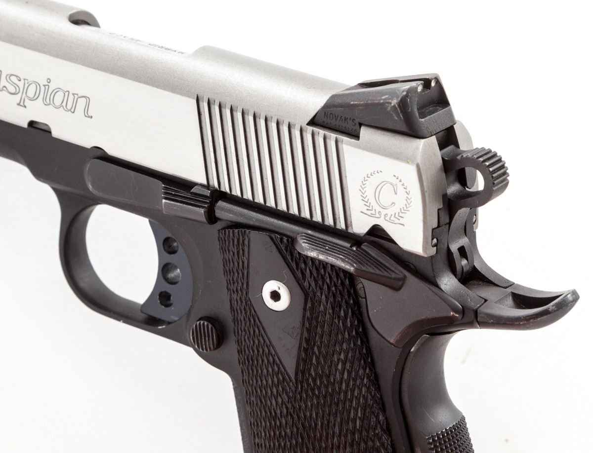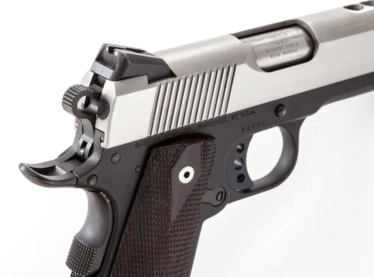 Lightweight Tussey Junior Custom Semi-Automatic Pistol, #22764, .45 ACP cal., ported 3-1/2'' barrel, stainless steel slide, lightweight alloy frame, checkered walnut grips, with one 8-round Colt magazine. Custom built by Terry Tussey, Carson City, NV, using a Caspian slide and frame, flat checkered mainspring housing, extended beavertail safety, Novak's sights, spring guide tube, with tuned action. Condition is very good to fine showing moderate carry and field use as light scratches to frame and slide, and losses to varnish on grips. Good action and bore. Tussey guns of this type start at $4,000 with a back log of 3- to 6-months waiting time. Est.: $1,800-$2,400. (Modern/PPT)