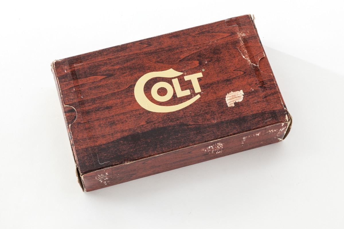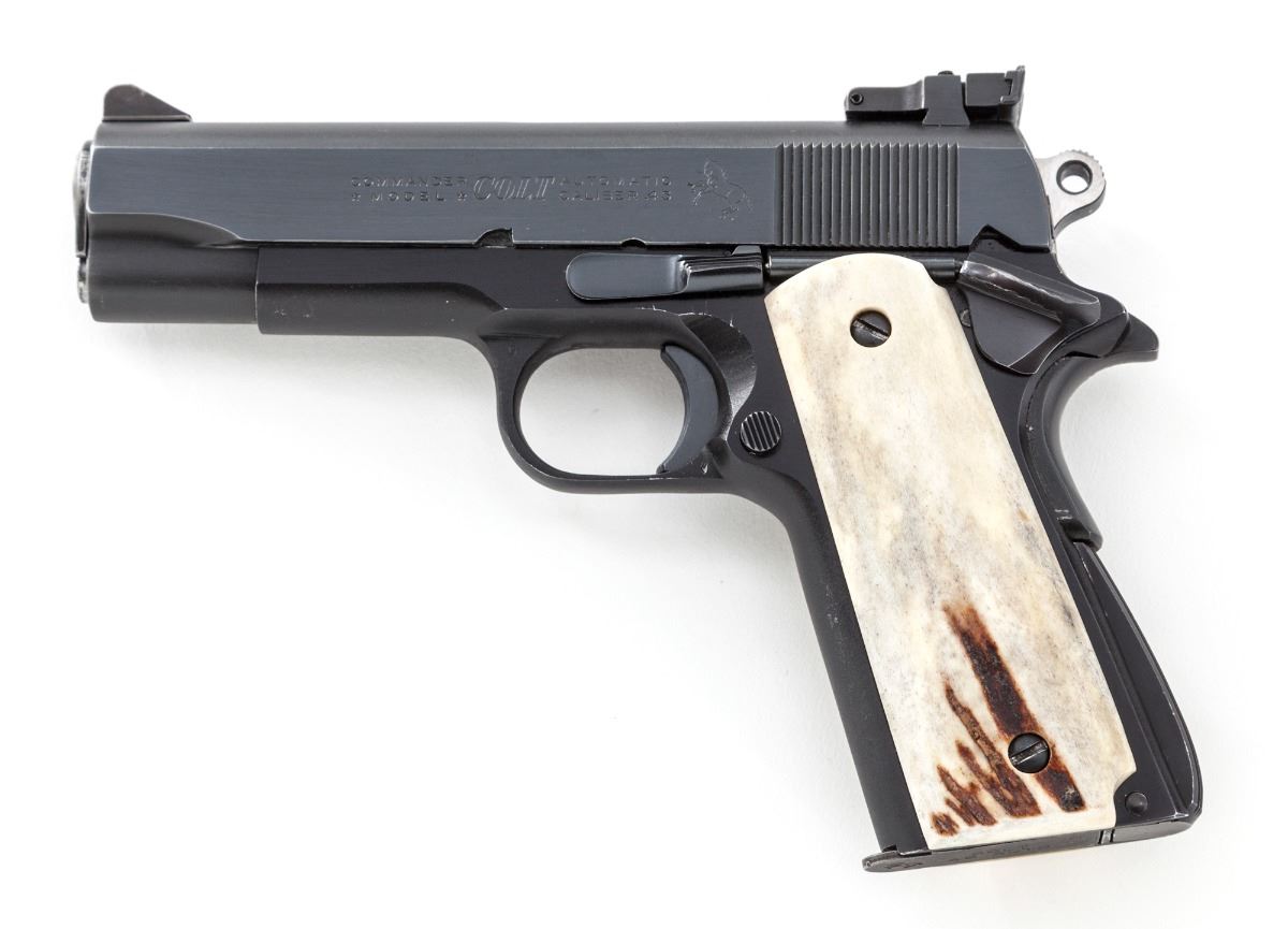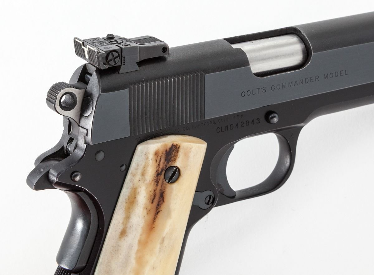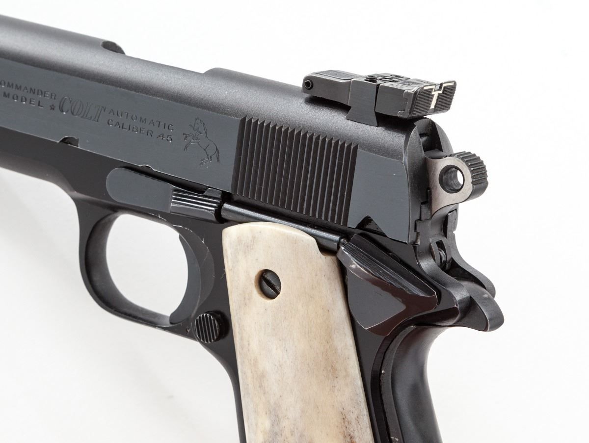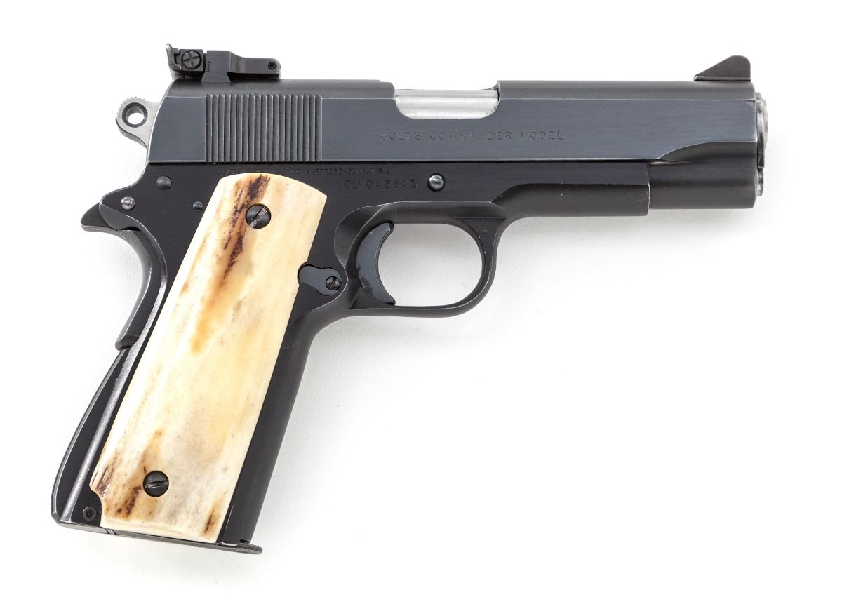 Colt Lightweight Combat Commander Semi-Automatic Pistol, #CLW042843, .45 ACP cal., 4-1/4'' barrel, blue finish, Millett sights, stag grips, one magazine, in somewhat later Combat Commander woodgrain box. Condition is near excellent as modified, retaining approx. 96% blue. Grips and action are good, bore is bright. Box with some minor losses. Est.: $600-$800. (Modern/PPT)