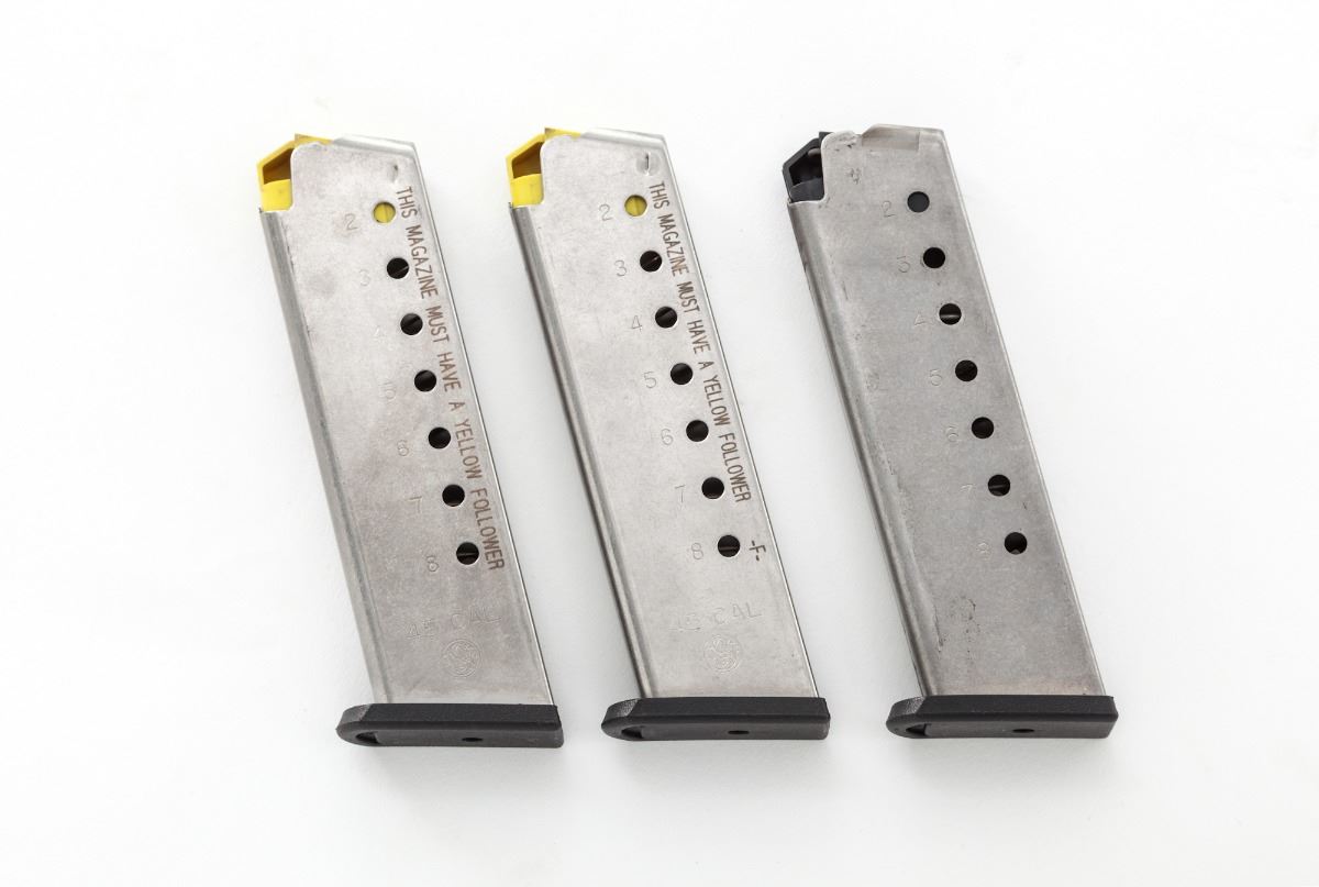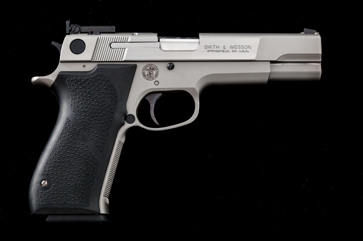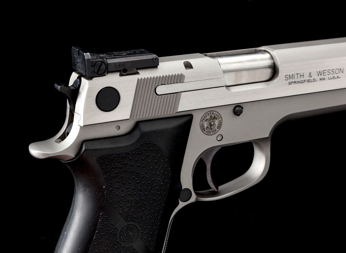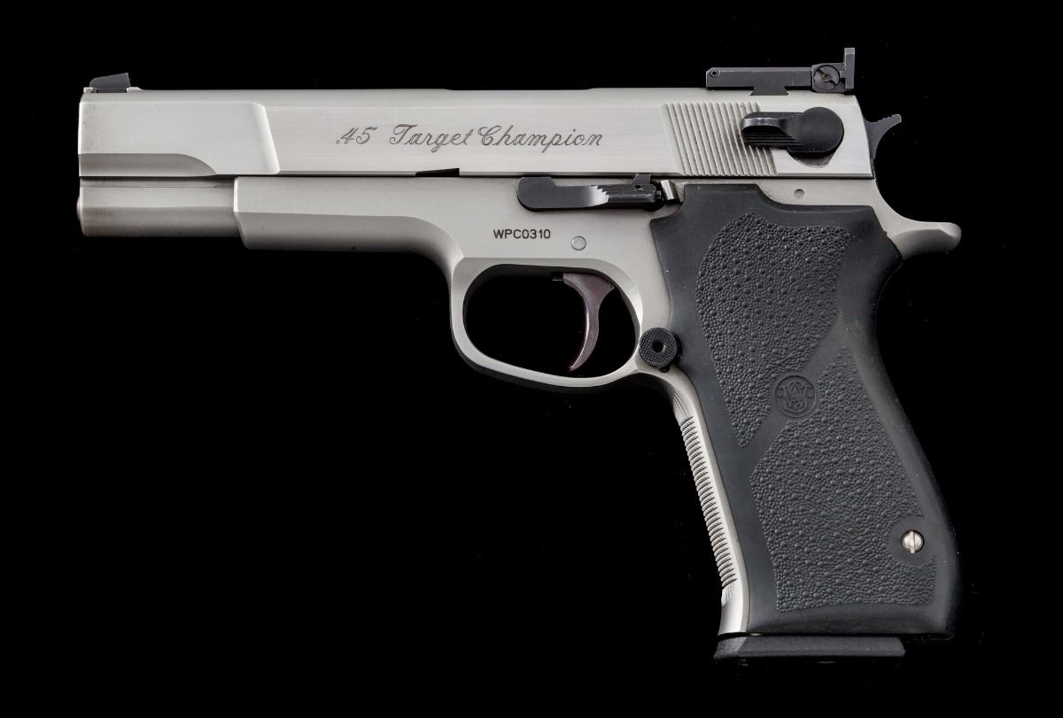 Scarce Smith & Wesson Performance Center Model 0845 Target Champion Semi-Automatic Pistol, #WPC0310, .45 ACP cal., 5'' bronze bushed barrel, LPA rear sight, stainless steel, S&W/Hogue grips, four (4) magazines, additional recoil spring and sight adjustment tool, as well as all associated paperwork. In original black plastic hard case. Considered rare with only two mfg'd in this exact configuration -- one an NRA banquet prize, and this and IPSC shooting prize from the early 1990s. Condition is excellent showing just light range use. Est.: $1,800-$2,400. (Modern/PPT)
