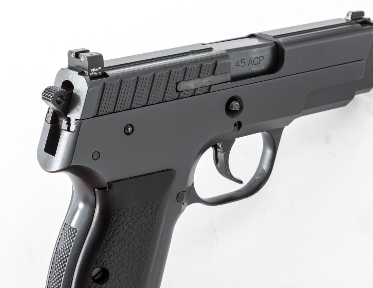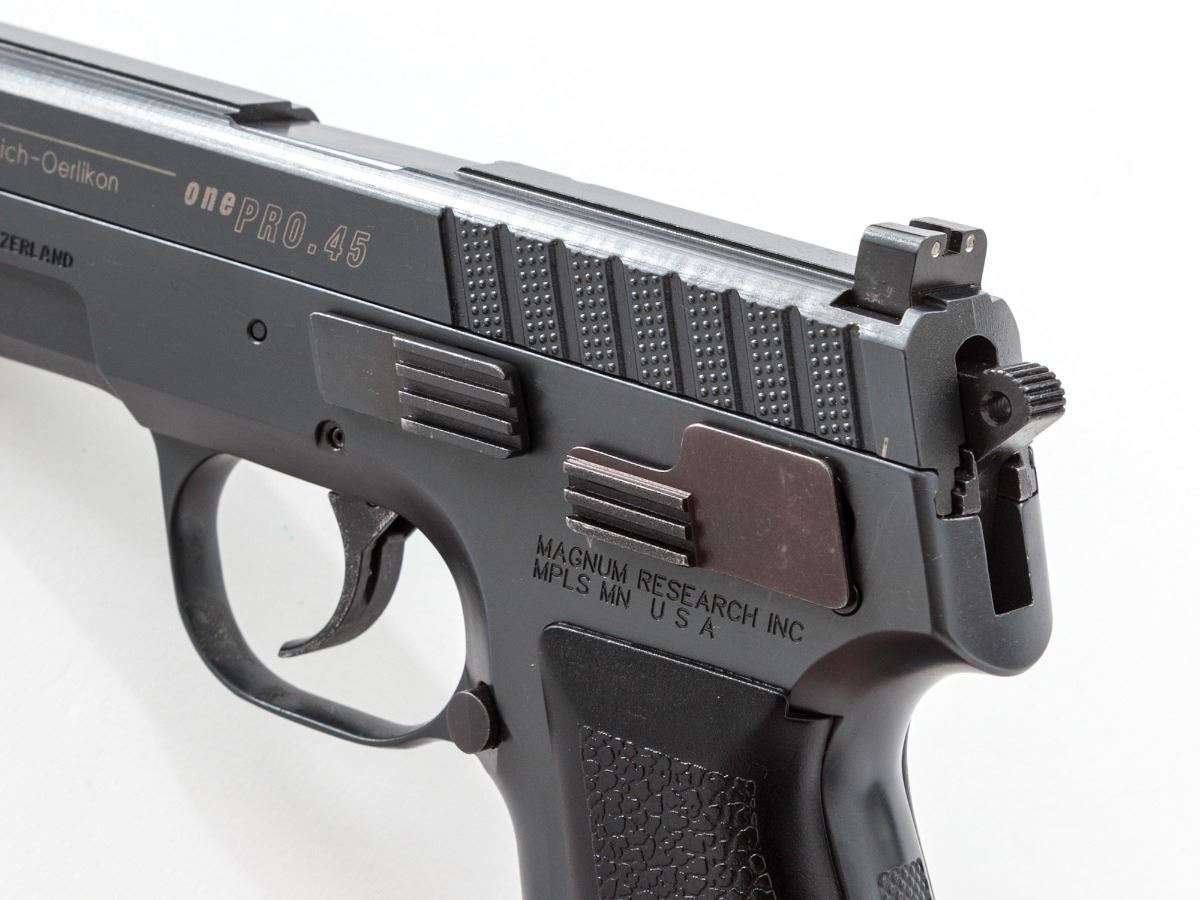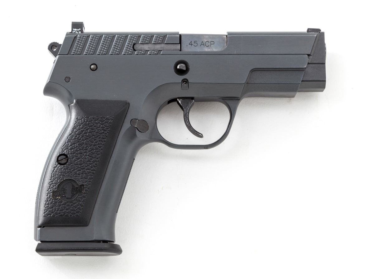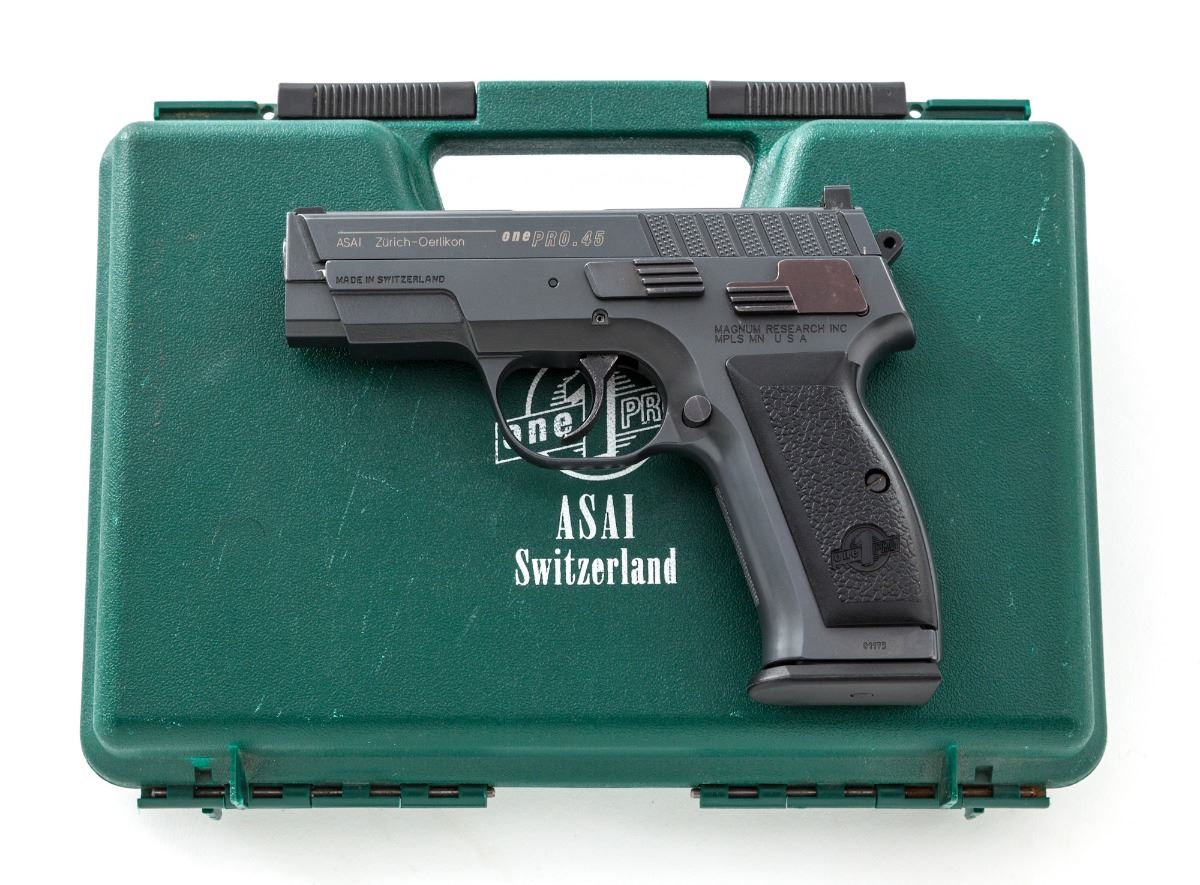ASAI 1Pro Semi-Automatic Pistol (Swiss), #01173, .45 ACP cal., 3.5'' barrel, semi-matte non-reflective blue finish, pebblegrain black polymer grips, with one 10-round magazine. Designed by Martin Tuma in Solothurn, Switzerland, and mfg'd by Oerlikon, with approx. 1000 imported by Magnum Research in the late 1990s and seldom seen today. Condition is excellent showing just light range use, appearing as new, in its original box. Action has slight delay in decocking mechanism while firing and should be returned to Magnum Research for repair. Trijicon sights have been added, original sights are present. Est.: $1,000-$1,500. (Modern/PPT)