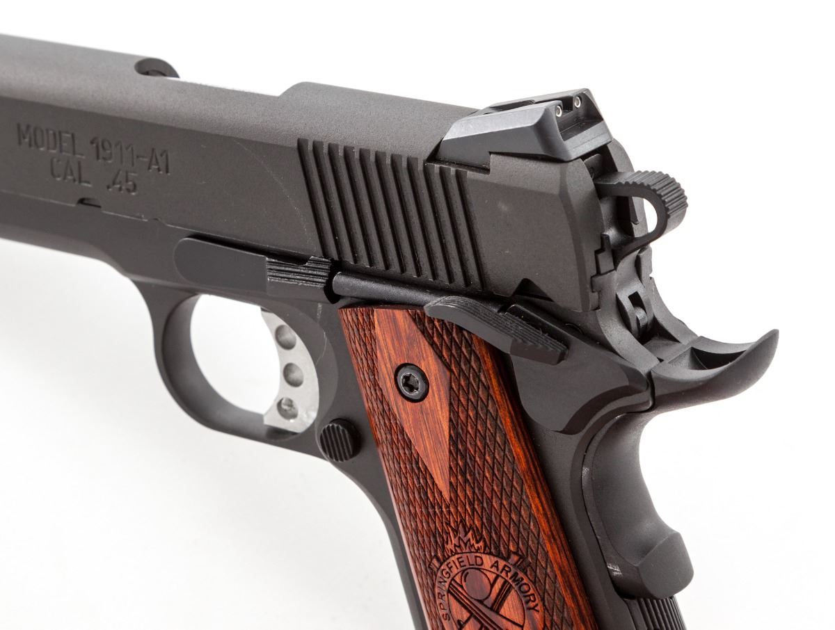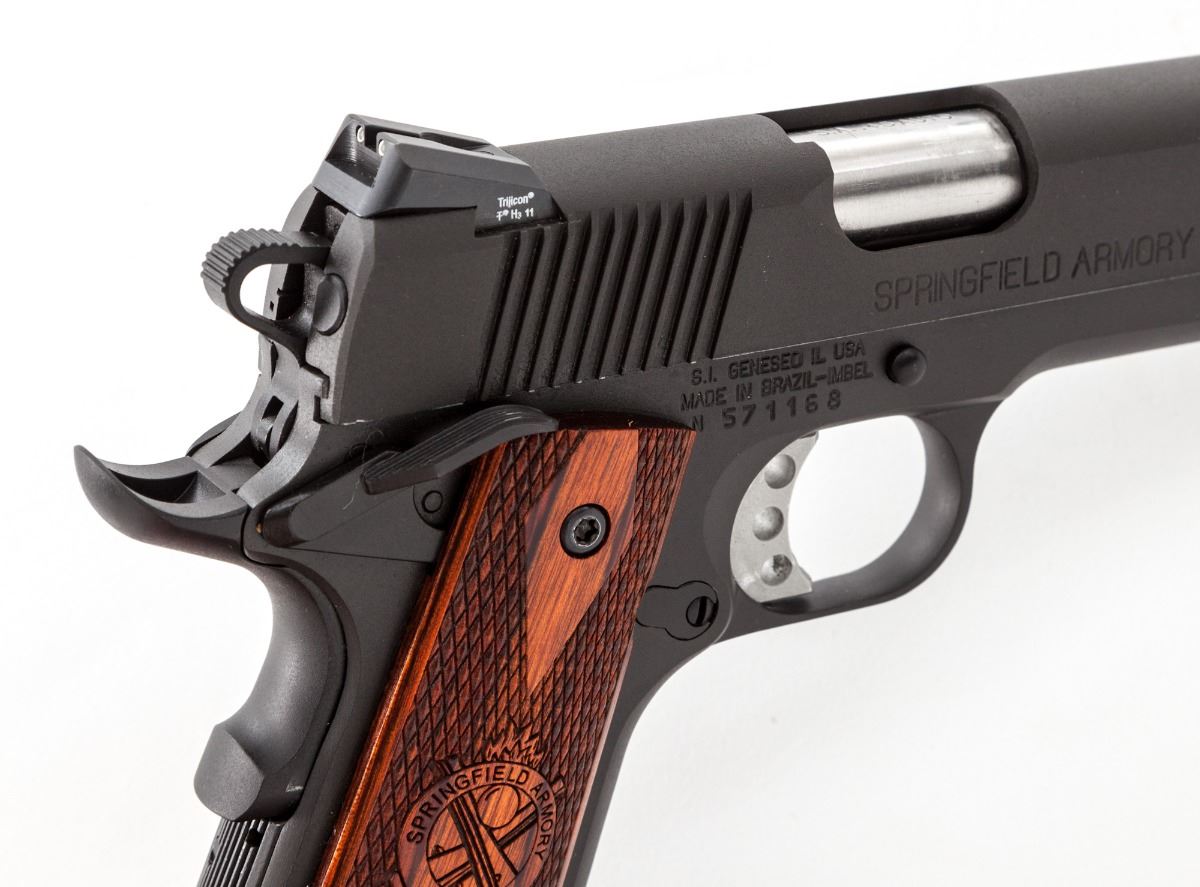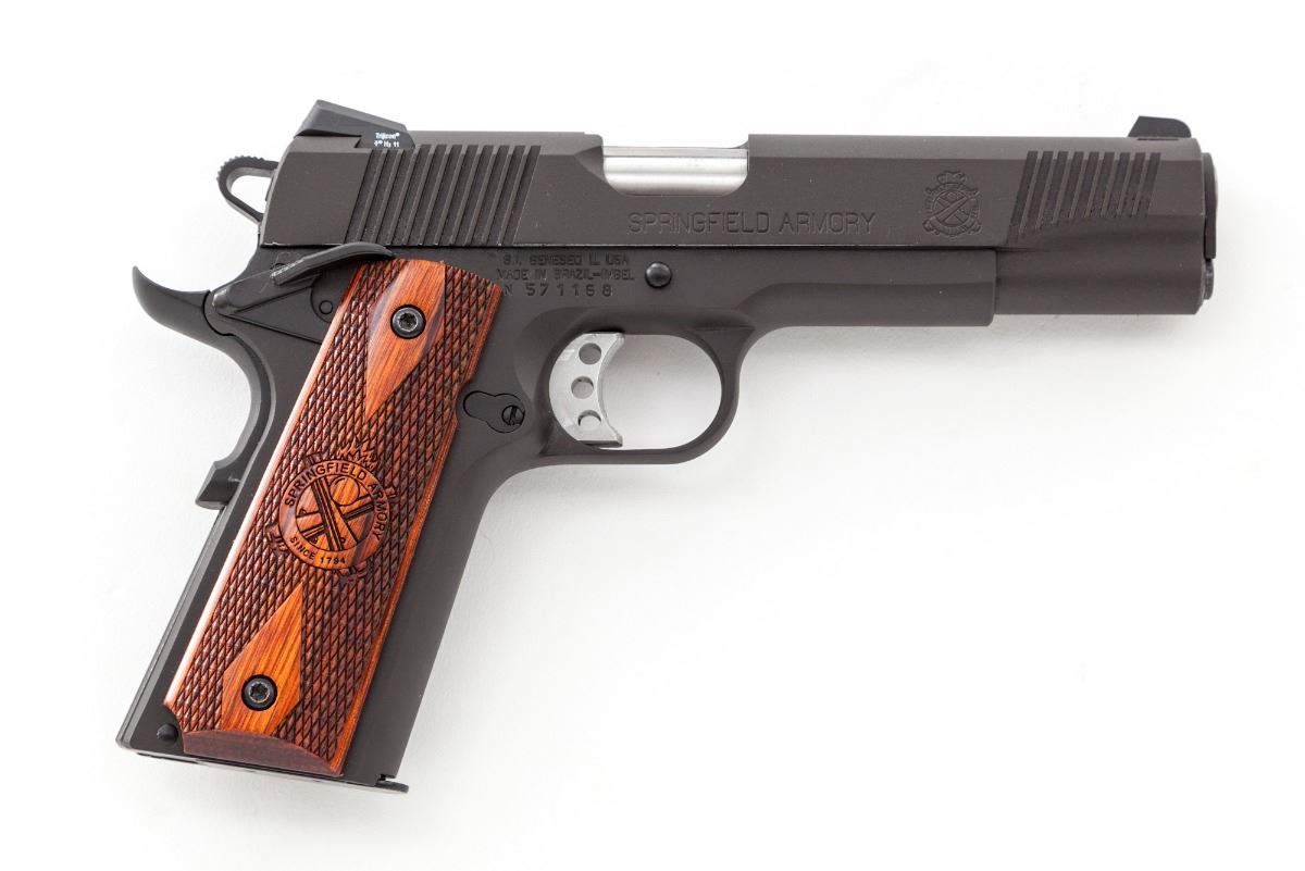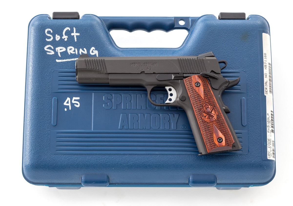 Springfield Model 1911-A1 Semi-Automatic Pistol, #N571168, .45 ACP cal., 5'' barrel, matte finish, laser-cut hardwood Springfield Armory grips, with factory Novak style night sights, molded plastic holster and magazine pouche. Condition is excellent, appearing as new and unfired, in original hard case. Est.: $450-$650. (Modern/PPT)