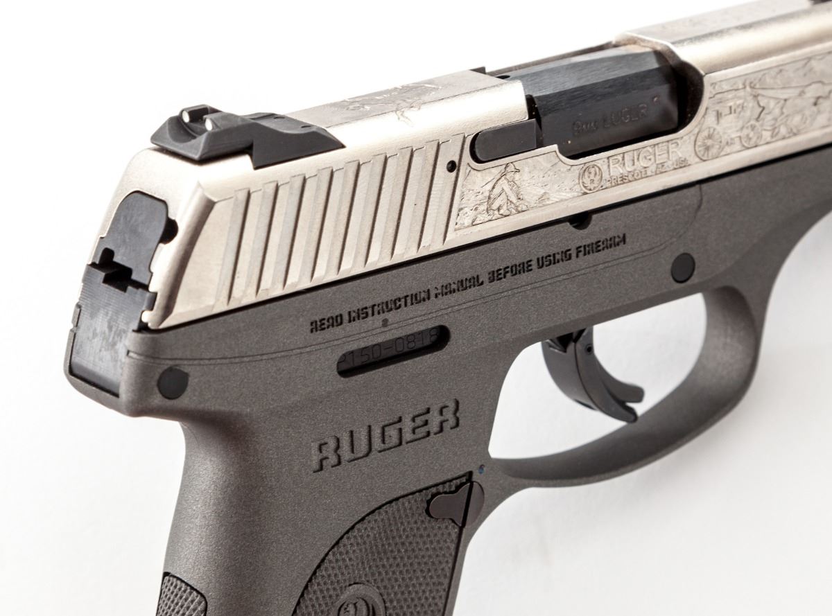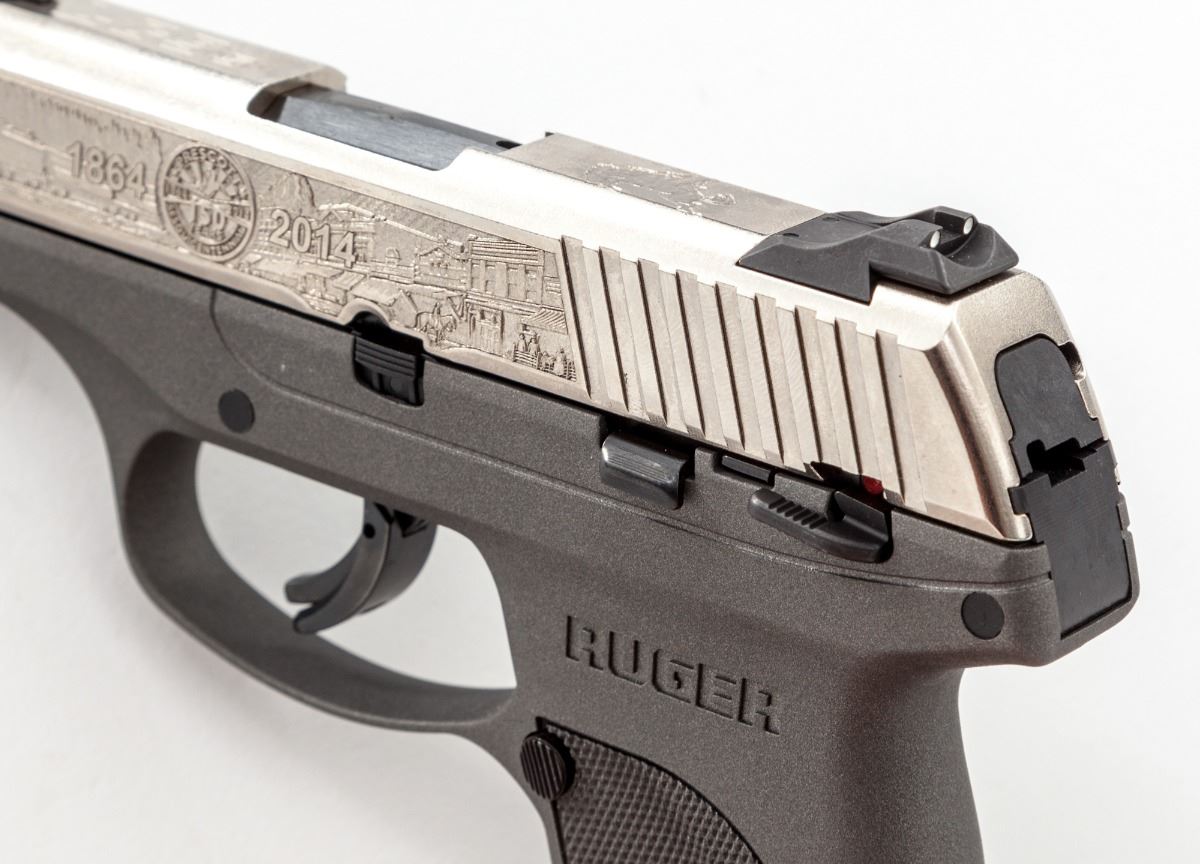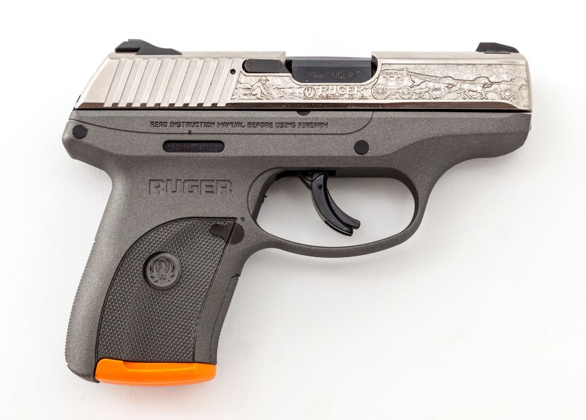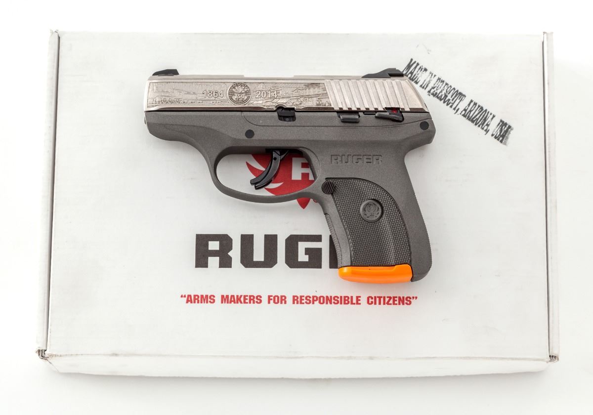 Ruger LC9S, Prescott, Arizona Commemorative Semi-Automatic Pistol, #P150-0818, 9mm, 3'' barrel, gray nylon frame, roll-engraved bright slide, with factory pistol rug, one magazine and instructions, in original box. Condition is excellent, appearing as new and unfired. Est.: $350-$500. (Modern)(Not available to Calif. residents.)