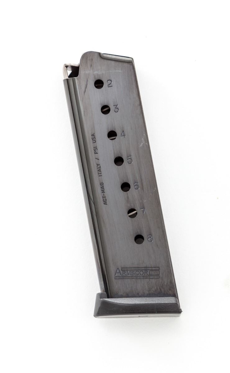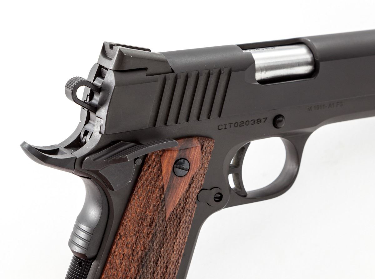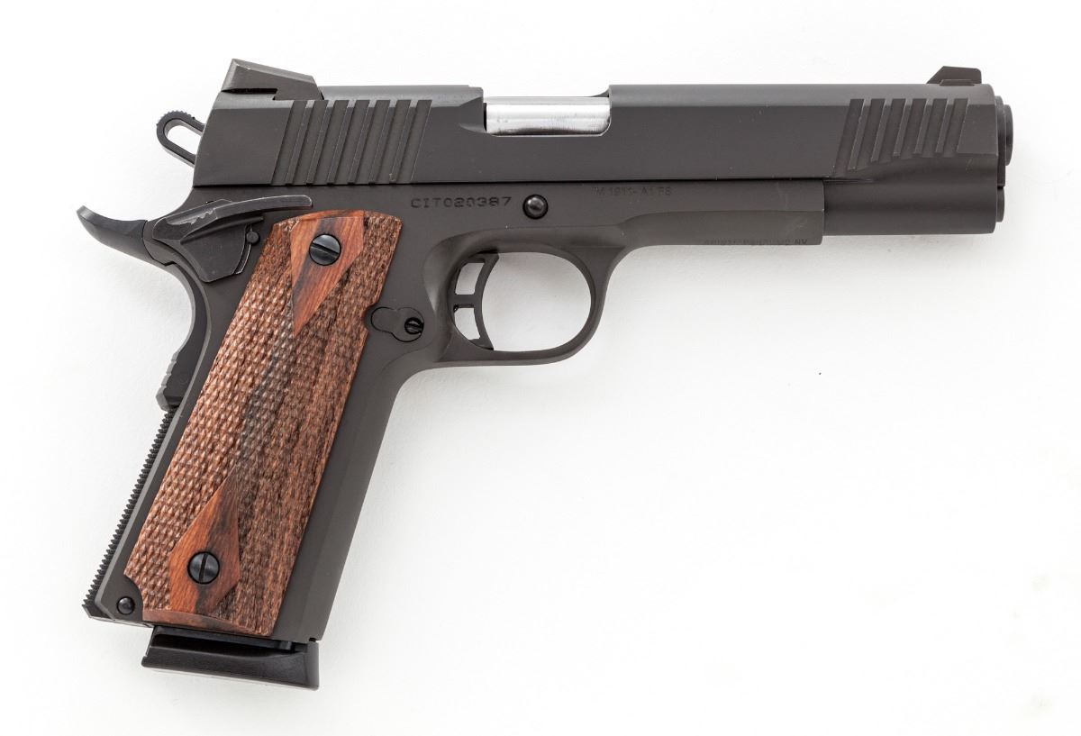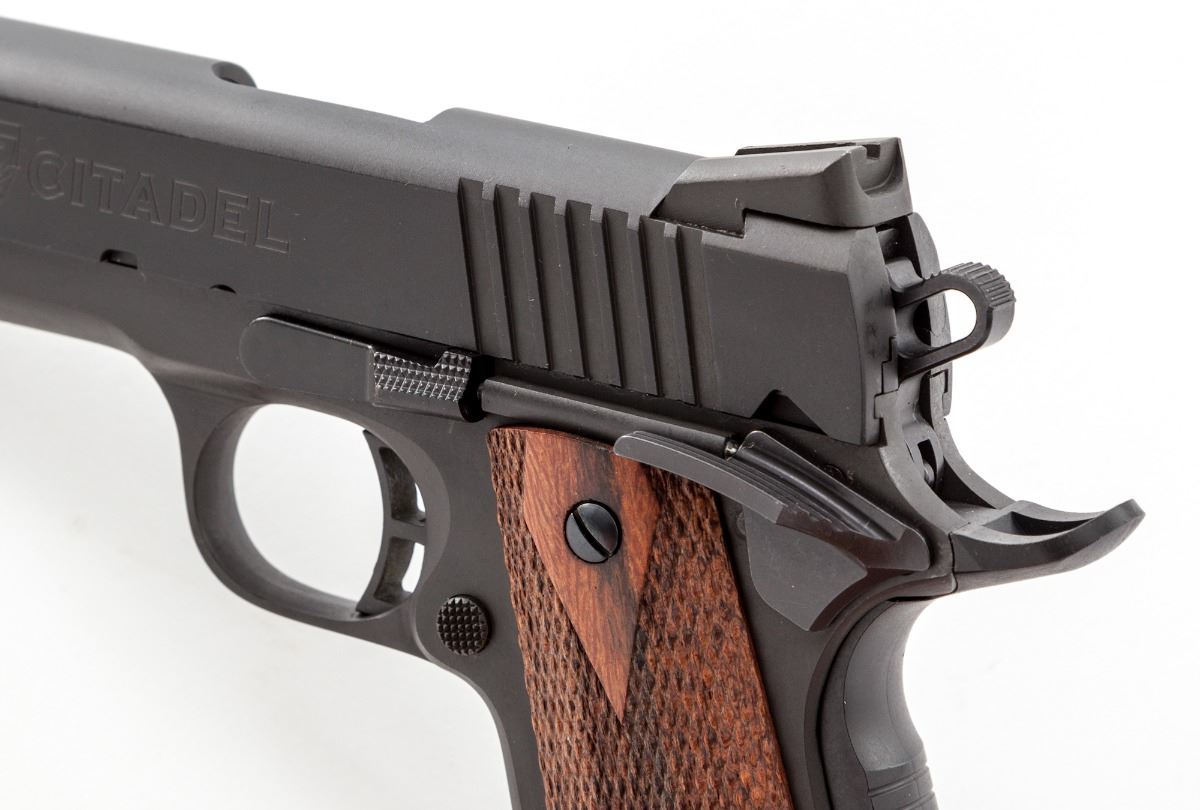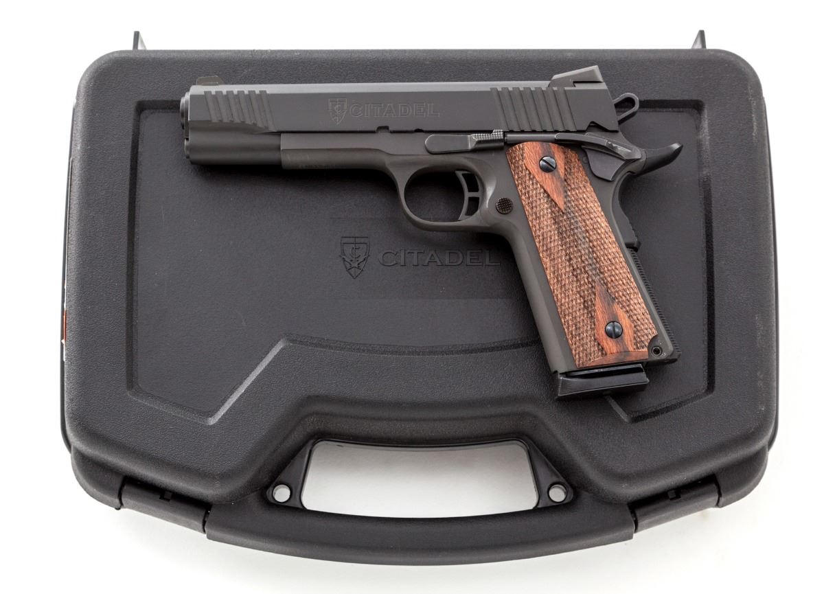 Legacy Sports Int'l Citadel 1911-A1 Semi-Automatic Pistol, #CIT020387, .45 ACP cal., 5'' barrel, parkerized finish, factory checkered large diamond walnut grips, with Novak style sights, ambidextrous safety, flat checkered mainspring, skeletonized hammer and trigger, spring guide tube, and two (2) 8-round Armscorp magazines. Condition is excellent, appearing as new and unfired, in original box. Est.: $450-$650. (Modern)