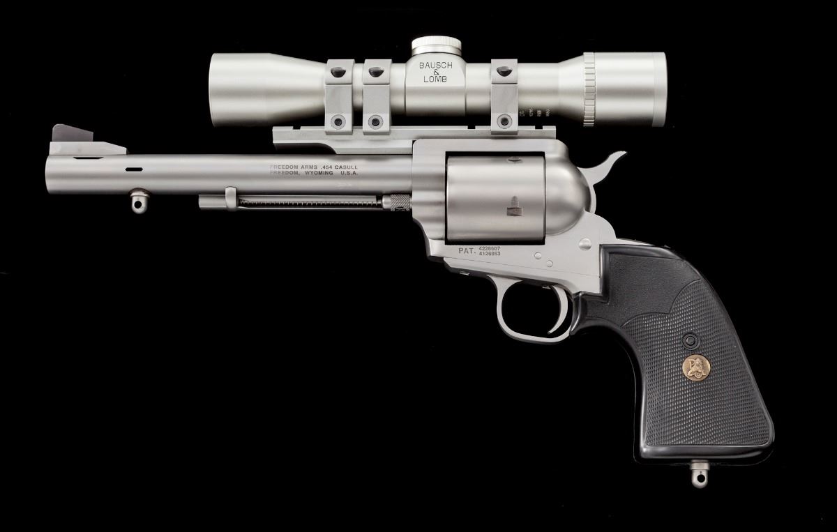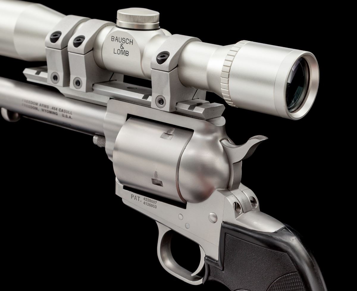 Freedom Arms Model 83 ''Field Grade'' Single Action Revolver, #DF1694, .454 Casull, 5-shot, 7-1/2'' factory magna-ported barrel, stainless steel, non-fluted cylinder, checkered black rubber grips with Pachmayr medallions, with fixed front sight, sling swivels and adjustable nylon strap. Topped with a Bausch & Lomb 2x28 scope. Condition is excellent, appearing as new. Est.: $1,000-$1,500. (Modern/PPT)