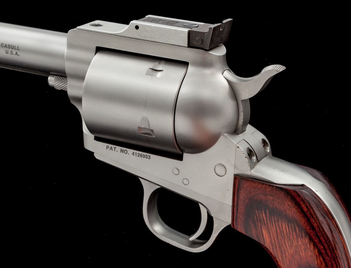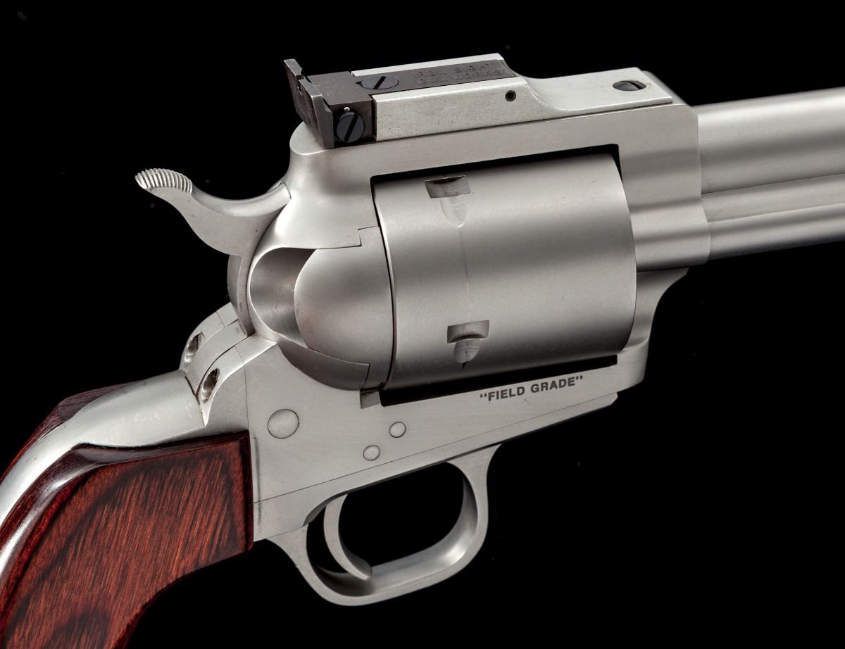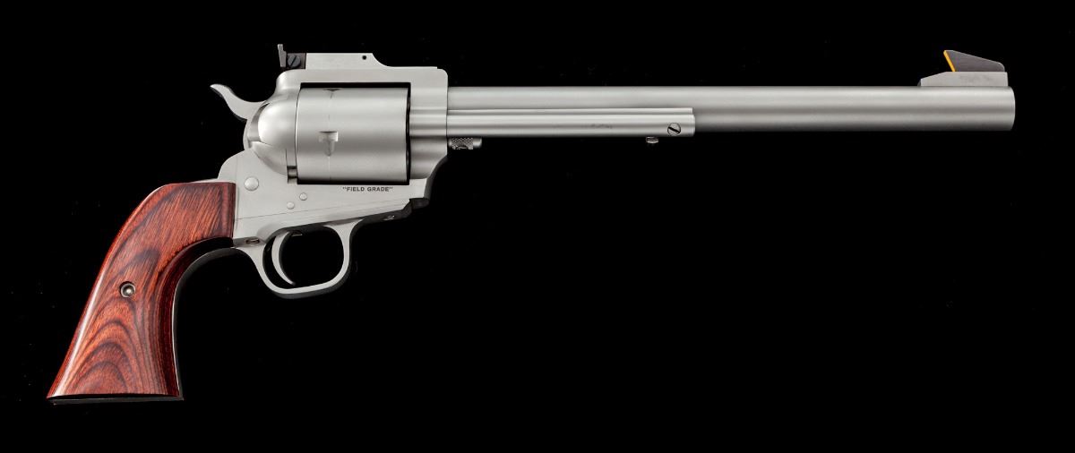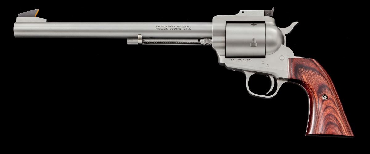 Freedom Arms Field Grade Single Action Revolver, #DF4442, .454 Casull/.45 Colt cal., 10'' barrel, stainless steel, laminated hardwood grips, with Iron Sight Gun Works front and rear sights. Condition is excellent showing only minor use as thin index line to cylinder. Good grips and action, bright bore. Est.: $1,200-$1,800. (Modern/PPT)