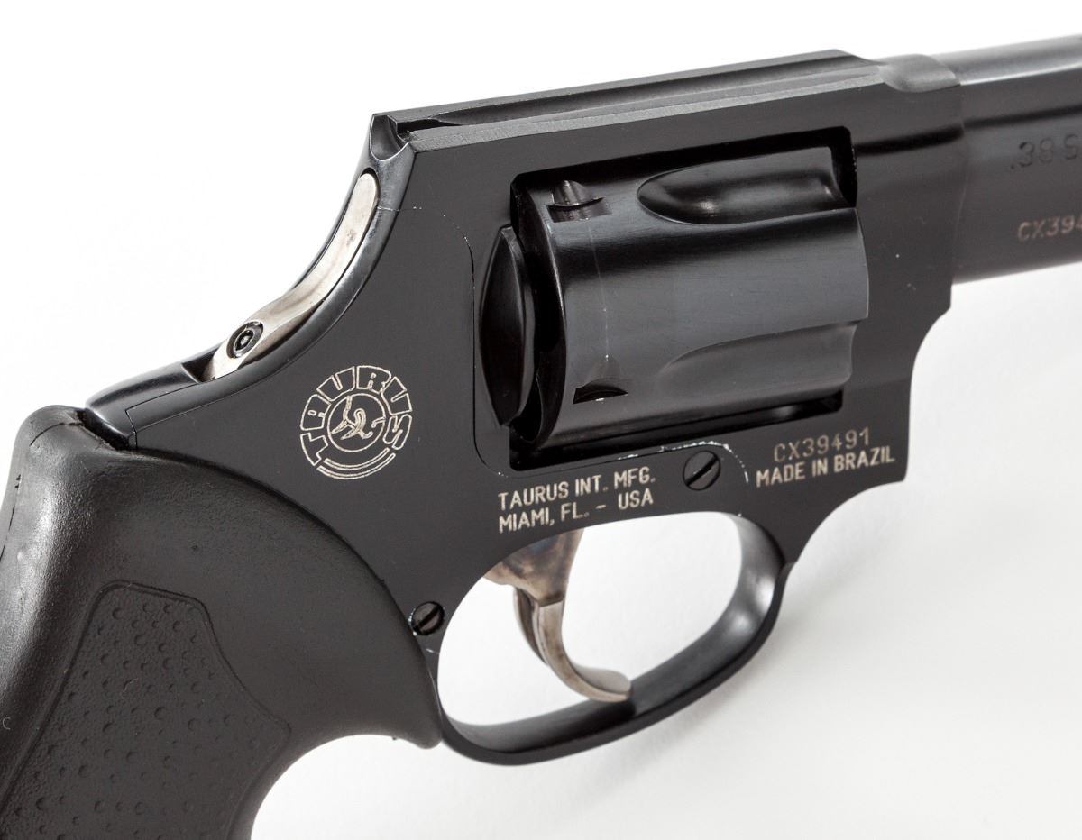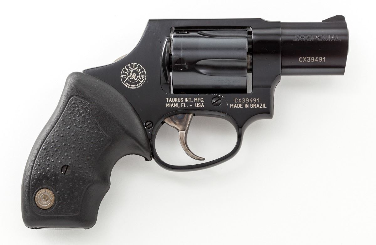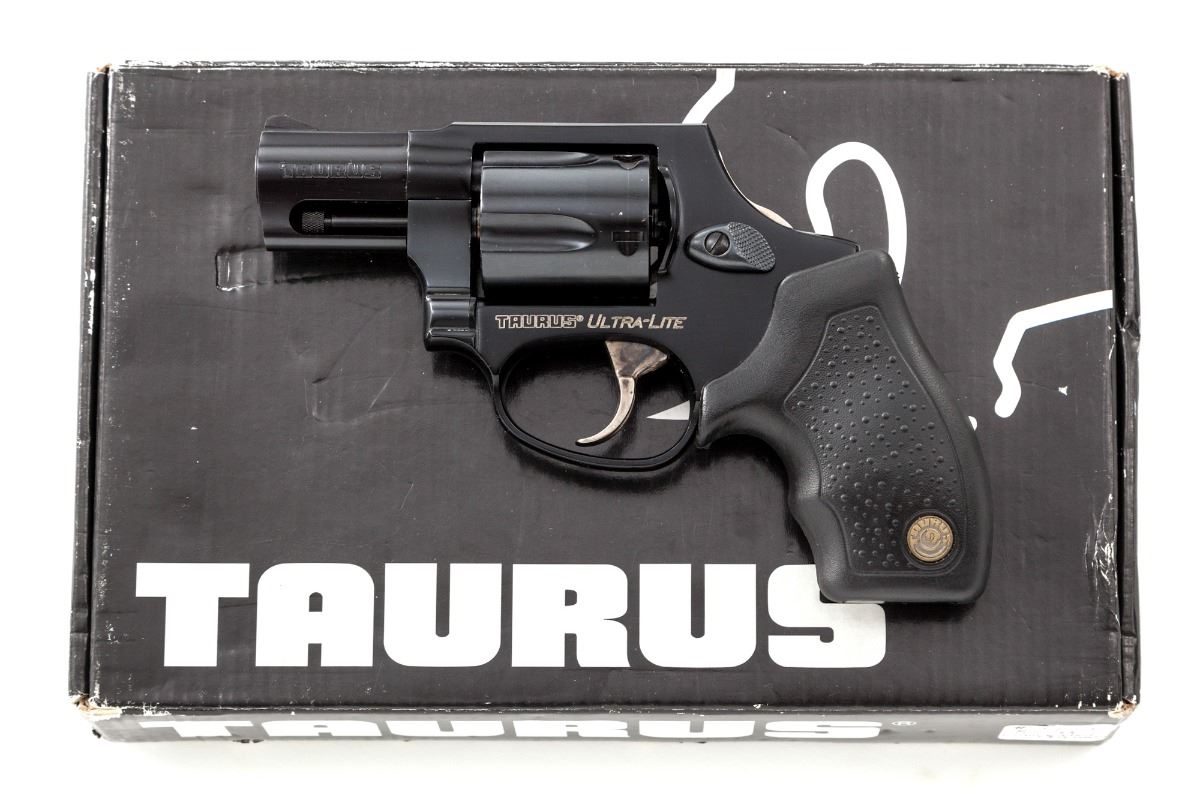 Taurus Model 85 Ultralite Double Action Revolver, #CX39491, .38 Spec. cal., 2'' barrel, dark blue finish, stainless steel concealed hammer, stainless case colored trigger, factory textured Taurus rubber grips, fixed blade front sight, integral frame rear sight, in original box with matching end label, safety keys and owner's manual. Condition is excellent. Metal surfaces with general fine micro-scratching and cylinder with light dragline. Action is crisp, bore is fine. Est.: $250-$350. (Modern) (Not available to Calif. residents.)