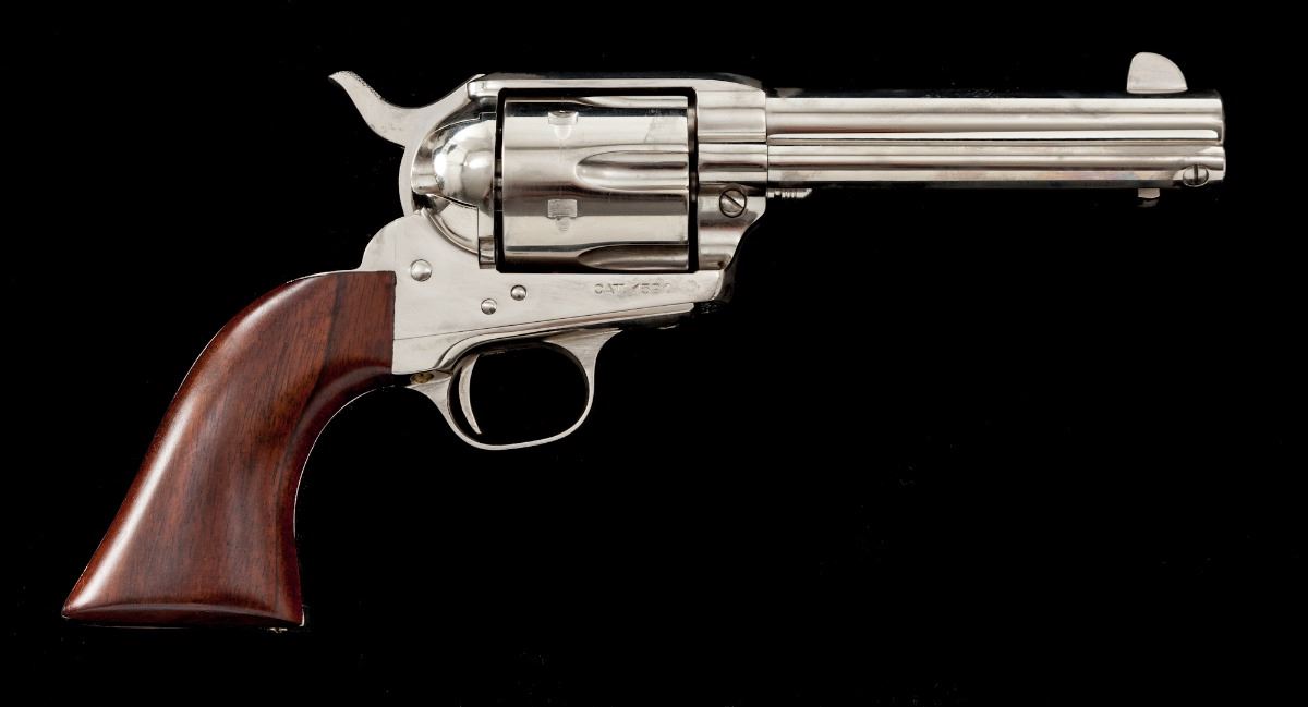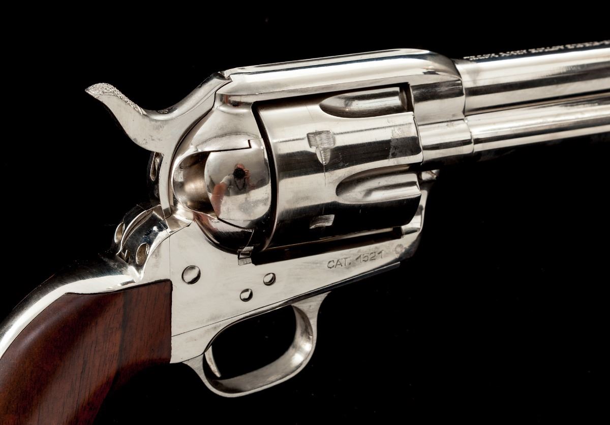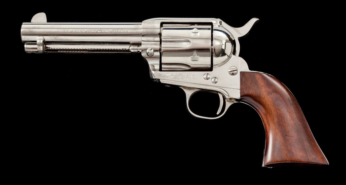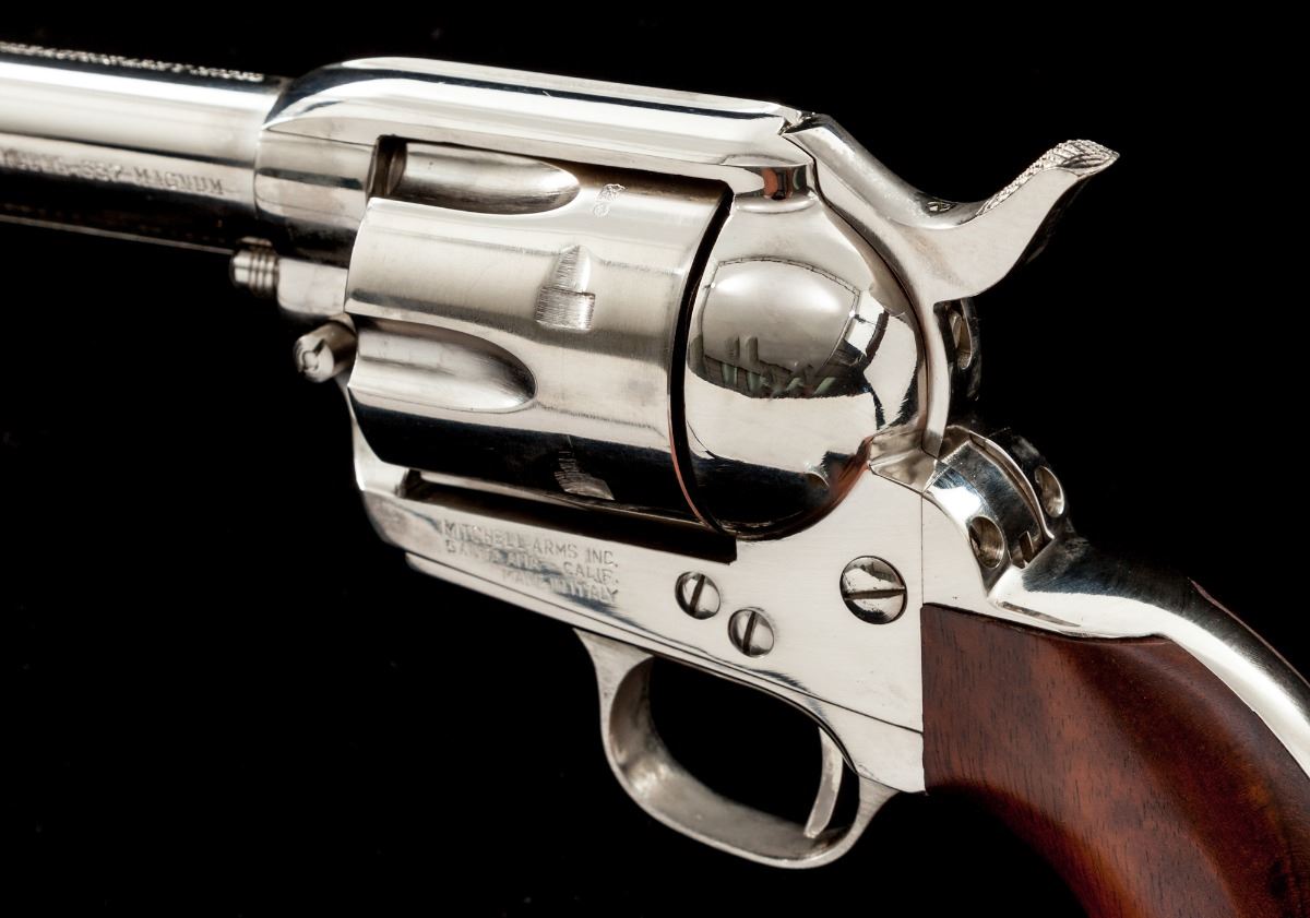 Mitchell Arms Single Action Army Revolver, #97521, .357 mag. cal., 4-3/4'' barrel, nickel finish, one-piece hardwood grips. Made in Italy for Mitchell Arms by Uberti. Condition is excellent, appearing as new and unfired, with minor clouding from dried grease. In original box. Est.: $450-$600. (Modern)