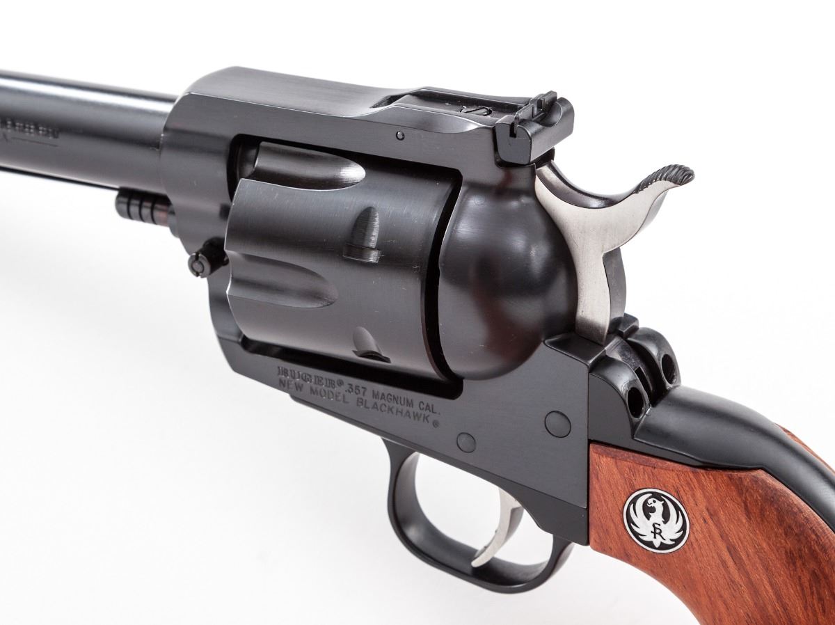 Ruger New Model Blackhawk Convertible Single Action Revolver, #37-57643, .357 mag. & 9mm cal. extra cylinder, 6-1/2'' barrel, blue finish, smooth hardwood grips with inlaid Ruger medallions, stainless steel trigger and hammer, raised ramp front sight, adjustable notched rear sight, in original Ruger hard case with matching end label and owner's manual. Condition is excellent, appearing near new. Metal surfaces with scattered minor marks from handling. Both cylinders with faint draglines and the last three digits of the serial numbers electro-penciled to the face. Grips with insignificant marks from handling. Action is crisp, bore is bright with the exception of a ring of moderate corrosion approx. 1'' from muzzle. Est.: $400-$600. (Modern)