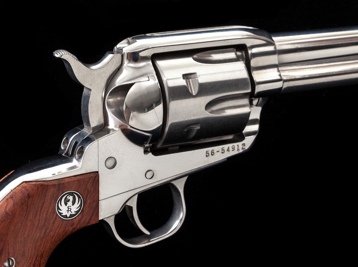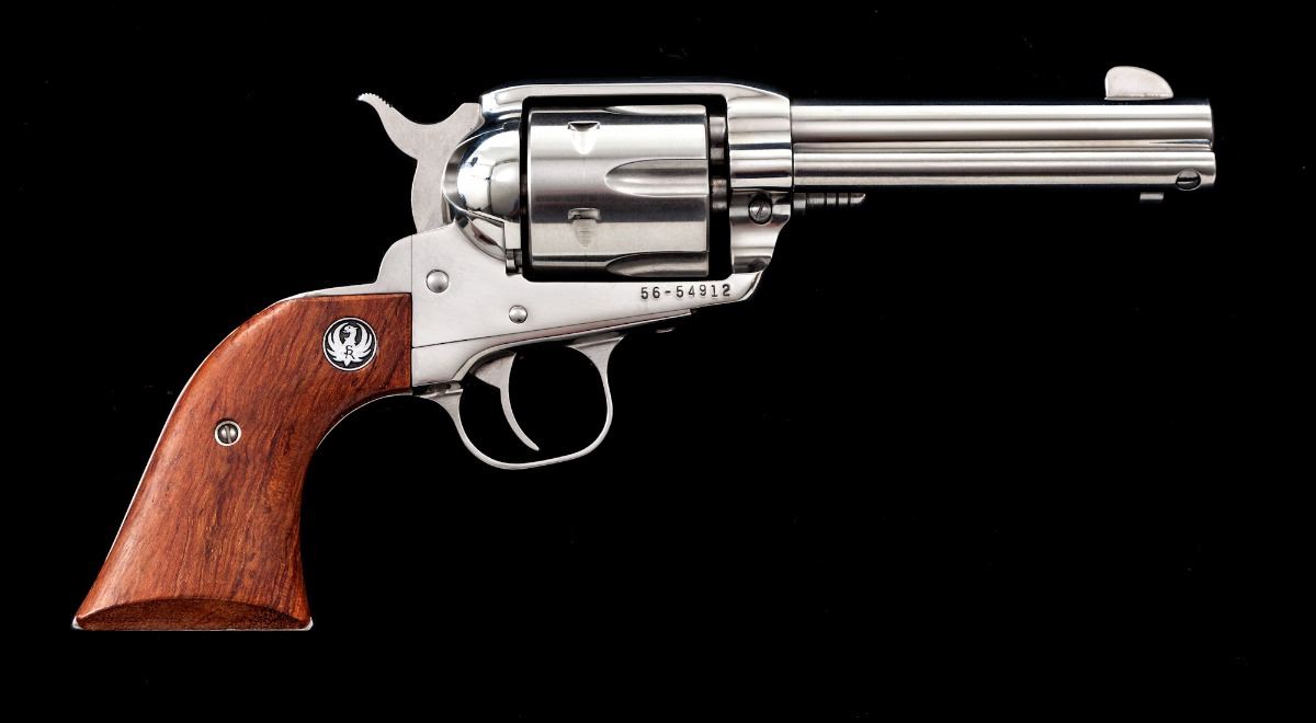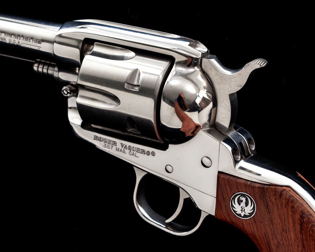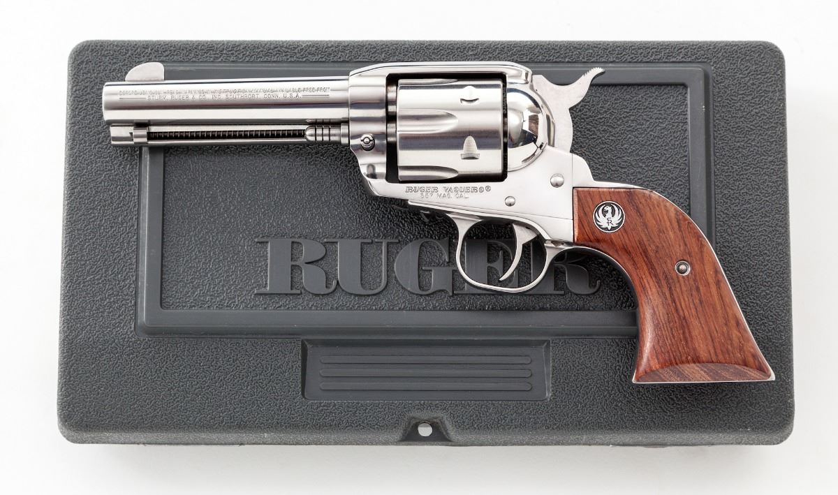 Ruger Vaquero Single Action Revolver, #56-54912, .357 mag. cal., 4-1/2'' barrel, stainless steel, two-piece factory wood grips with Ruger medallions. In original Ruger plastic hard case with associated paperwork. Condition is excellent showing only light marks from handling. Est.: $500-$750. (Modern)