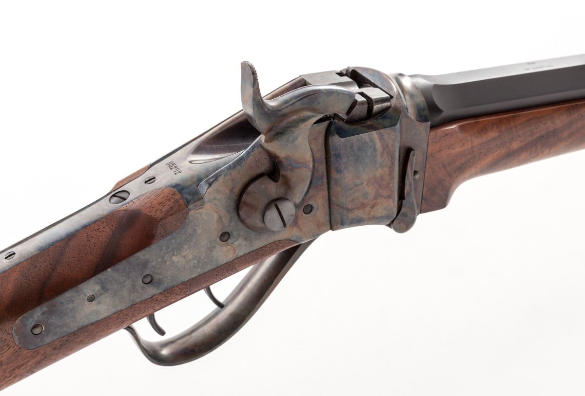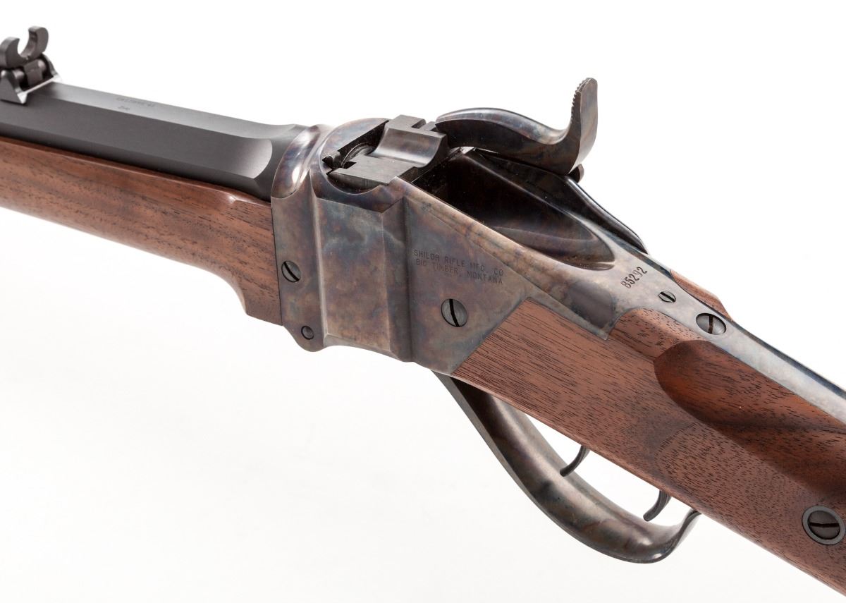 Shiloh Sharps Model 1874 Single Shot Sporting Rifle, #B5292, .45-70 cal., 26'' half-round matte finished barrel, case hardened frame and hammer, double set trigger, select smooth walnut cheekpiece straight non-checkered stock, pewter-tipped forend, with standard Shiloh Sharps rear rifle sight, buckhorn and elevator, and nickel silver Rocky Mountain front sight blade. Condition is excellent, appearing as new. Est.: $1,800-$2,400. (Modern)