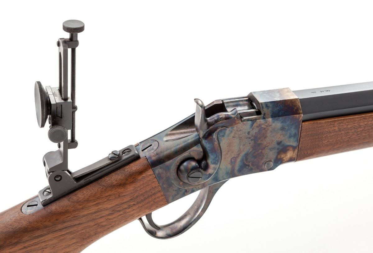 C. Sharps Old Reliable Single Shot Target Rifle, #S686, .40-65 cal., 30'' octagonal blue barrel, case hardened frame and lever, shadowline cheekpiece stock with Schnabel forend, case colored checkered steel buttplate, C. Sharps Arms Co. mid-range vernier tang sight and globe type front sight. Condition is excellent retaining approx. 98%-99% blue and case color. Stock with light to moderate impressions and marks from handling. Action is crisp, bore is bright. Est.: $1,500-$2,000. (Modern)